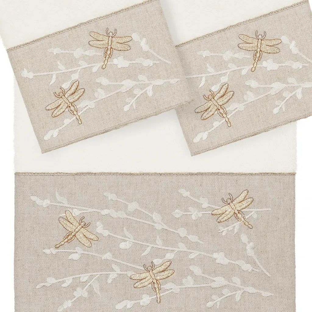 The Braelyn Embellished Towel Collection features glittering dragonflies flying among delicate branches embroidered on a linen-look textured woven cloth border. These soft and luxurious towels are made of 100% premium Turkish Cotton and offer lasting absorbency and superior durability.100% Premium Turkish Cotton Superbly absorbent and quick drying Available in a range of lovely towel colors Machine wash cold, No bleach, line dry or dry clean Set includes 1 bath towel (27" x 54") / 2 hand towels (16" x 30") Made in Turkey • Proudly Embellished in USA