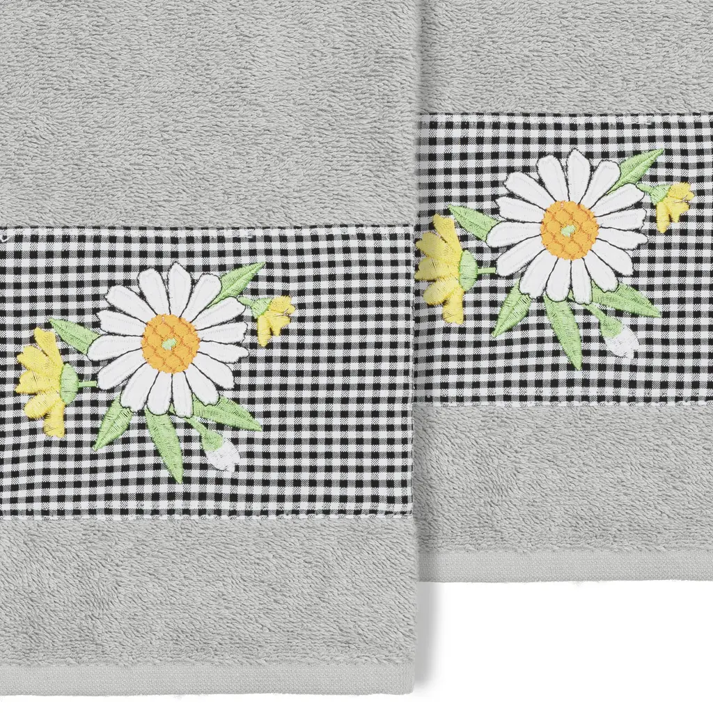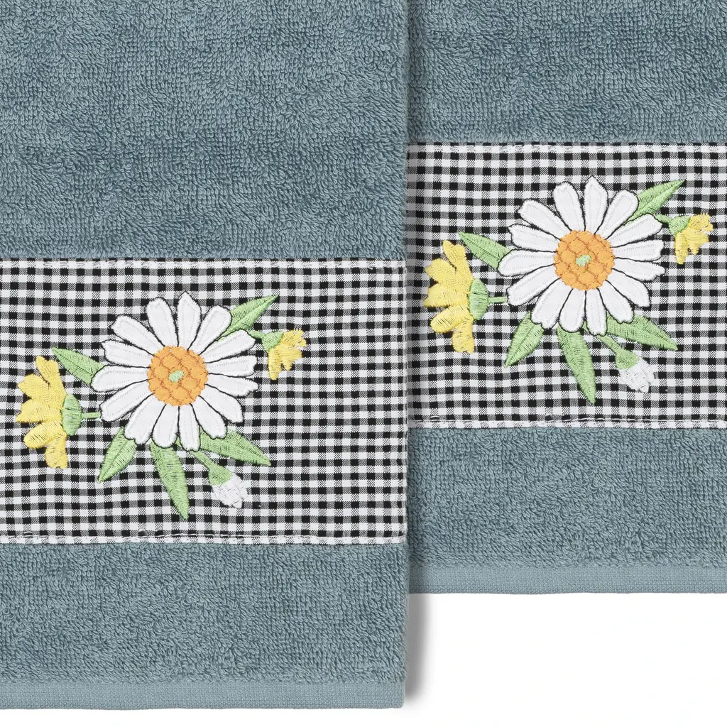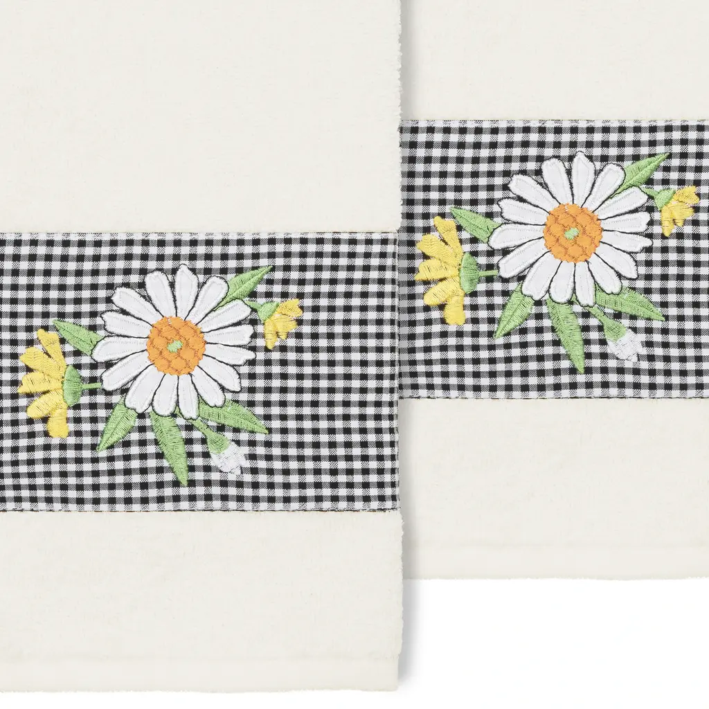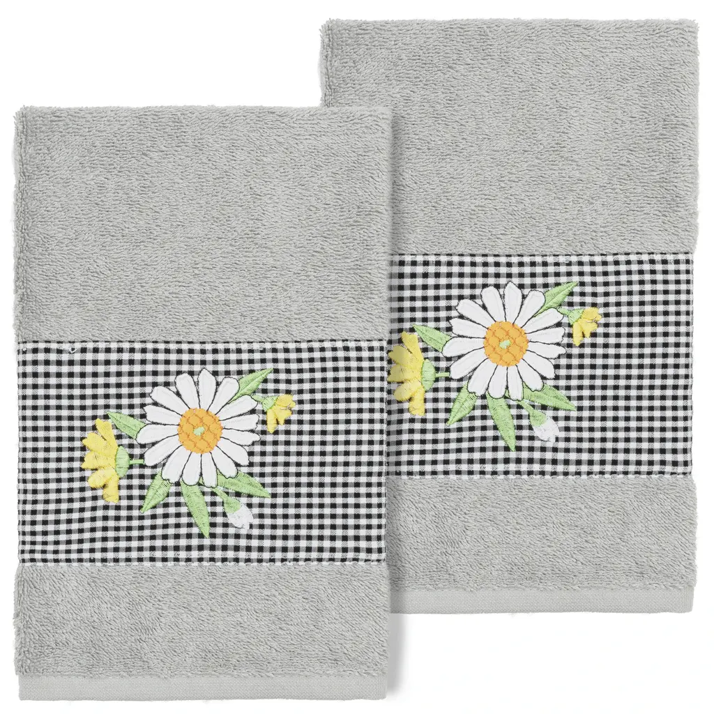The Daisy Embellished Towel Collection features a fresh bouquet embroidered on a textured gingham check cloth border. These soft and luxurious towels are made of 100% premium Turkish Cotton and offer lasting absorbency and superior durability.100% Premium Turkish Cotton Superbly absorbent and quick drying Available in a range of lovely towel colors Machine wash cold, No bleach, line dry or dry clean Set includes 2 hand towels (16" x 30") Made in Turkey Proudly Embellished in USA