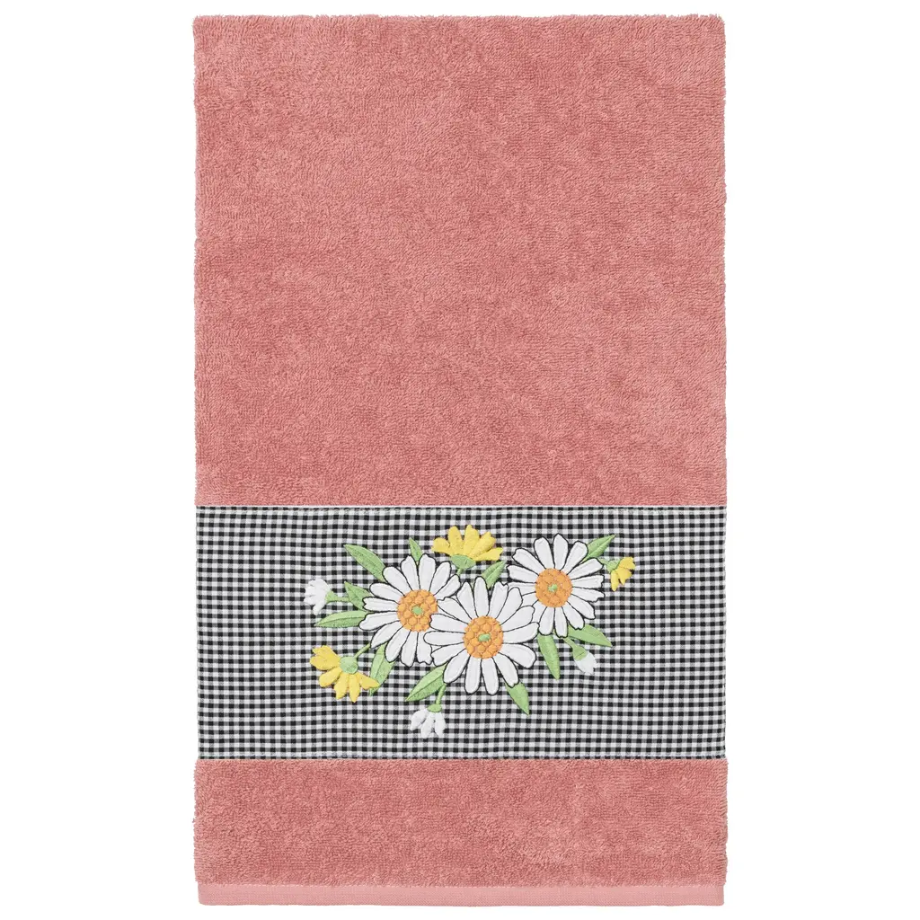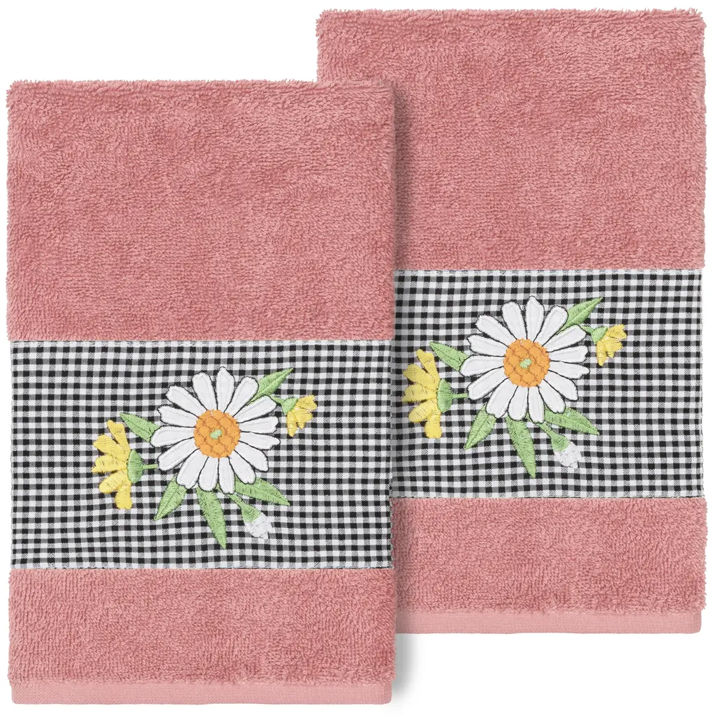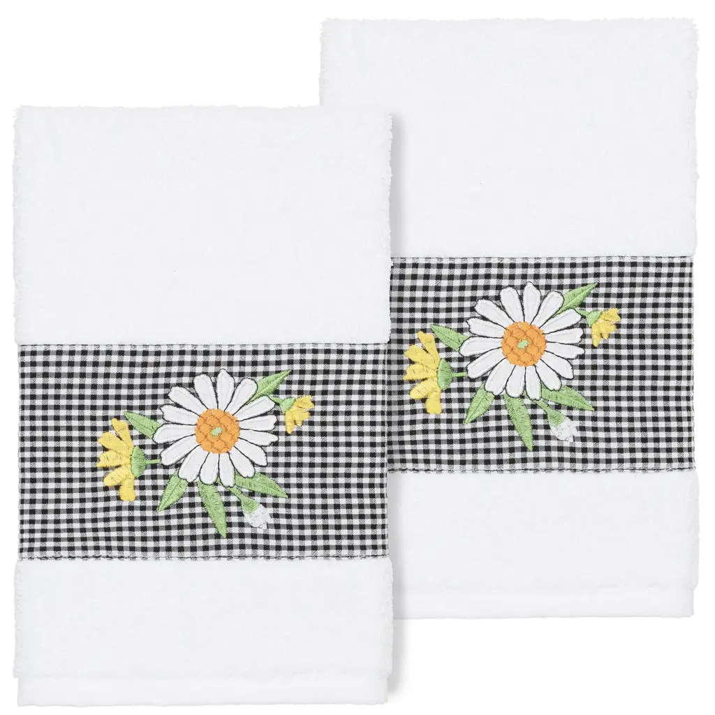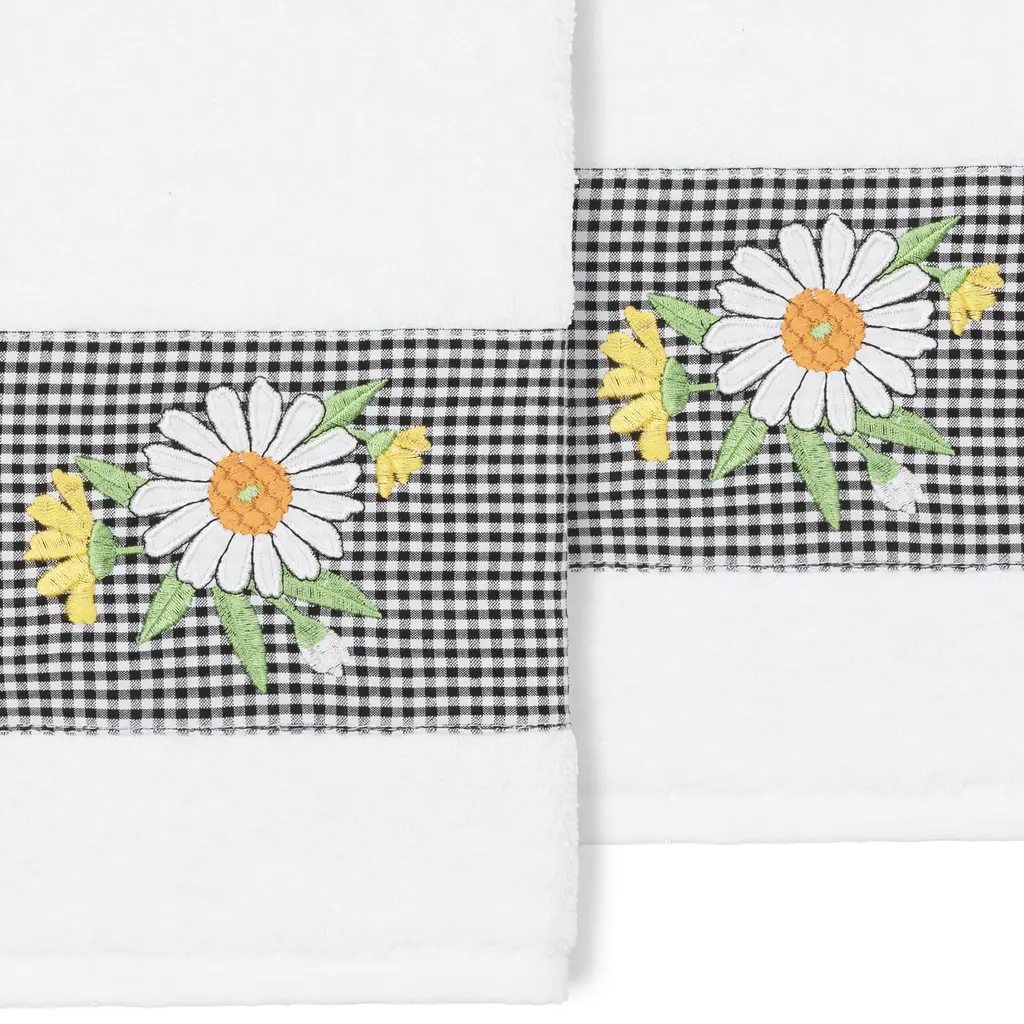 The Daisy Embellished Towel Collection features a fresh bouquet embroidered on a textured gingham check cloth border. These soft and luxurious towels are made of 100% premium Turkish Cotton and offer lasting absorbency and superior durability.100% Premium Turkish Cotton Superbly absorbent and quick drying Available in a range of lovely towel colors Machine wash cold, No bleach, line dry or dry clean Set includes 2 hand towels (16" x 30") Made in Turkey Proudly Embellished in USA