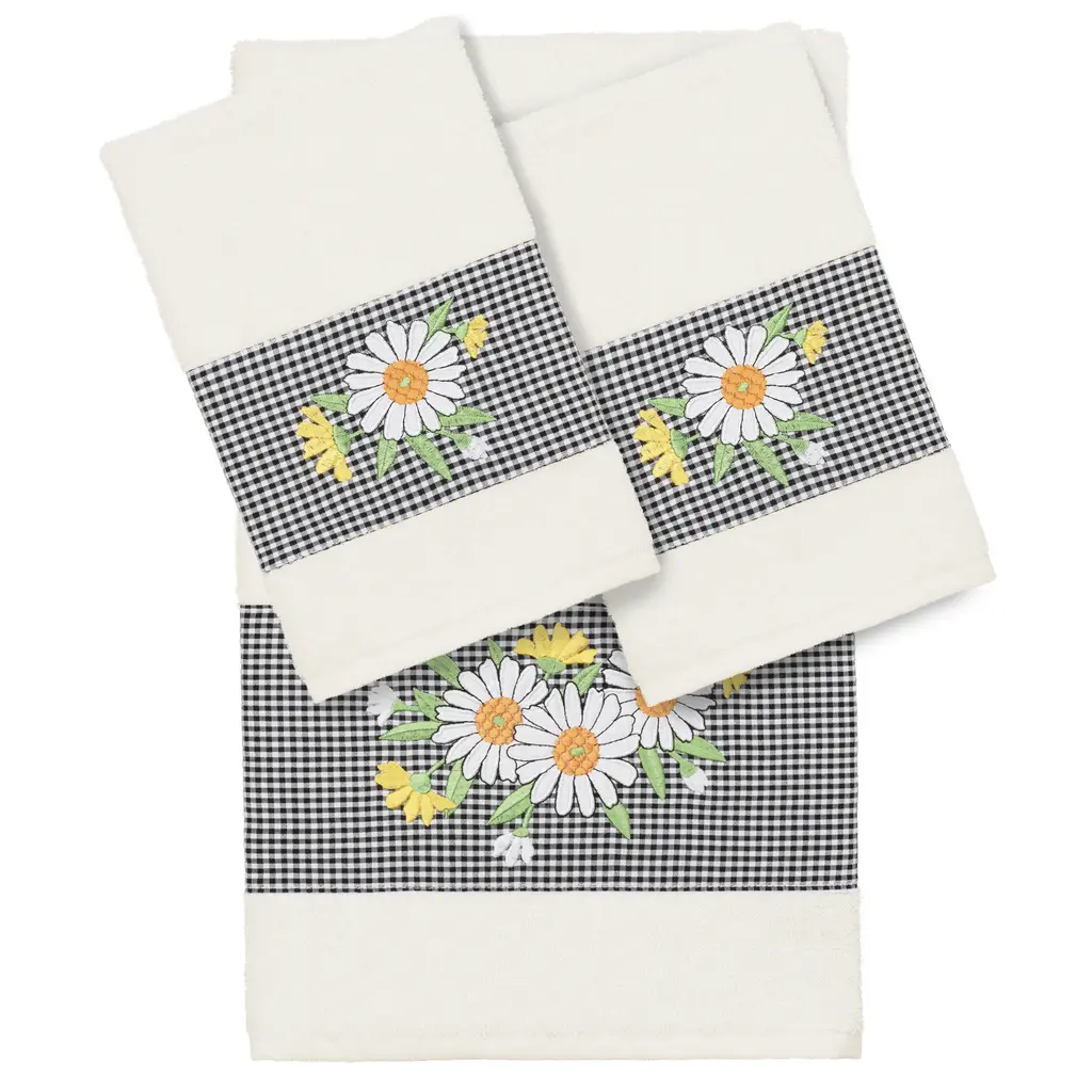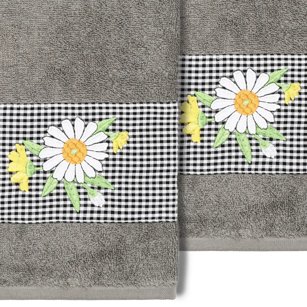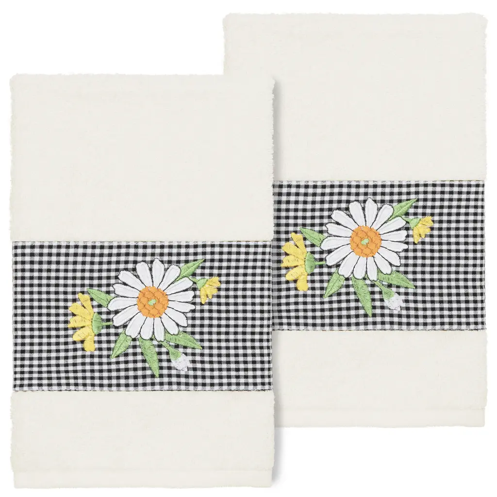 The Daisy Embellished Towel Collection features a fresh bouquet embroidered on a textured gingham check cloth border. These soft and luxurious towels are made of 100% premium Turkish Cotton and offer lasting absorbency and superior durability.100% Premium Turkish Cotton Superbly absorbent and quick drying Available in a range of lovely towel colors Machine wash cold, No bleach, line dry or dry clean Set includes 2 hand towels (16" x 30") Made in Turkey Proudly Embellished in USA