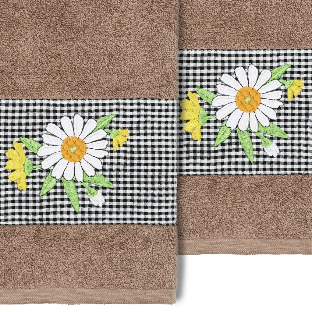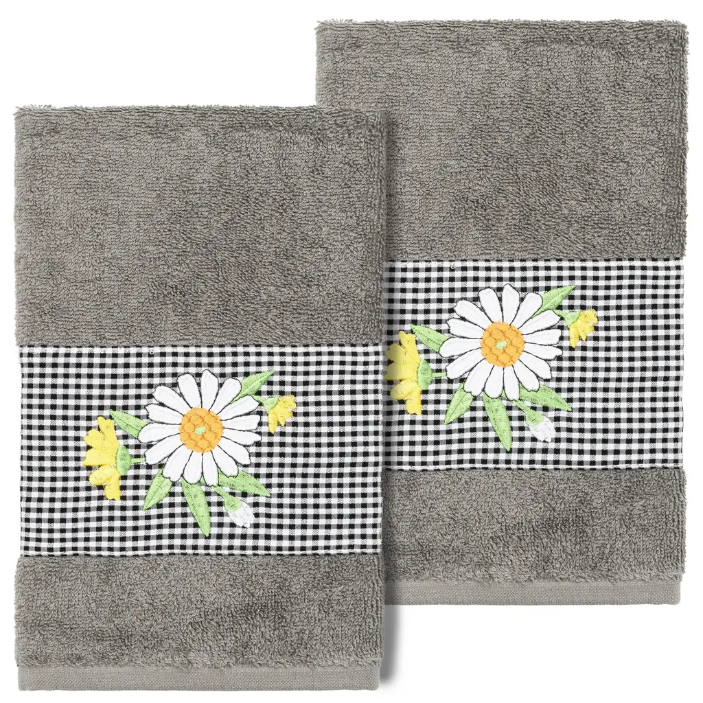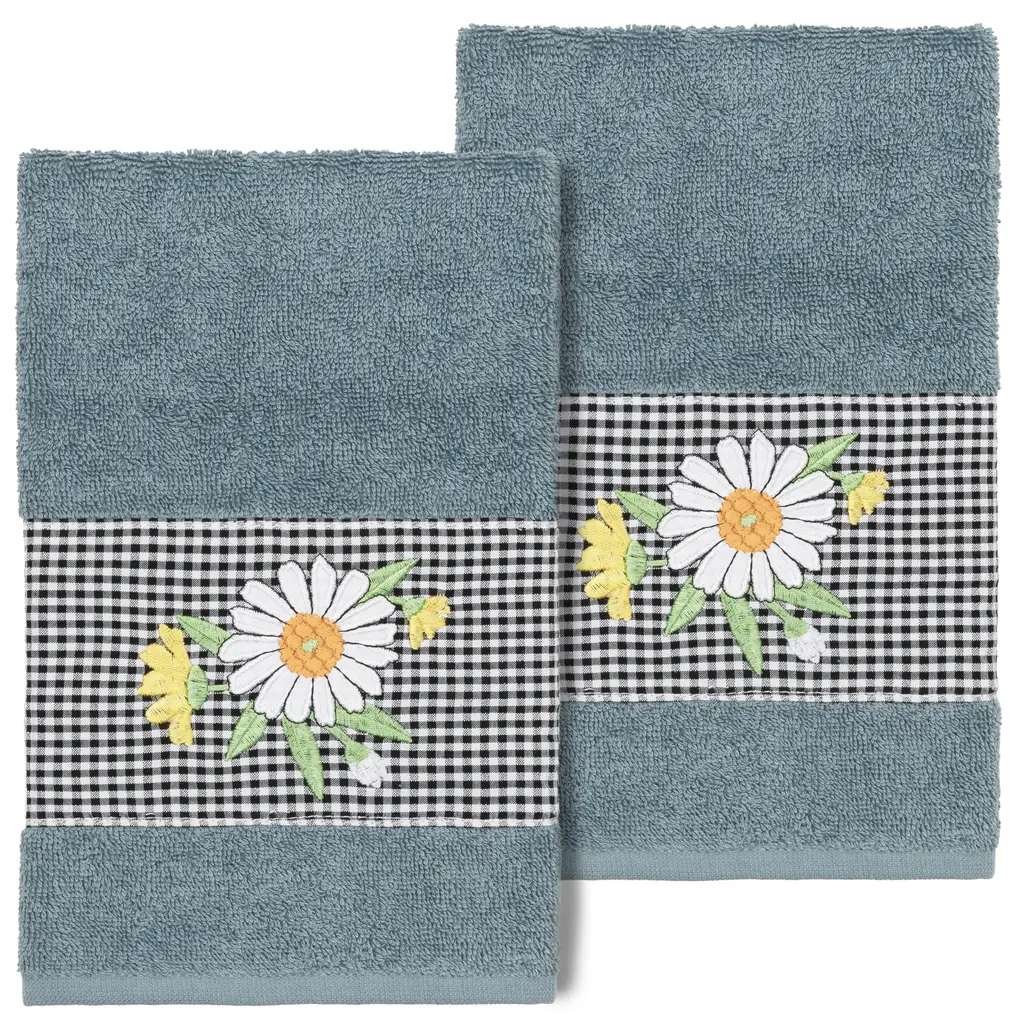 The Daisy Embellished Towel Collection features a fresh bouquet embroidered on a textured gingham check cloth border. These soft and luxurious towels are made of 100% premium Turkish Cotton and offer lasting absorbency and superior durability.100% Premium Turkish Cotton Superbly absorbent and quick drying Available in a range of lovely towel colors Machine wash cold, No bleach, line dry or dry clean Set includes 2 hand towels (16" x 30") Made in Turkey Proudly Embellished in USA