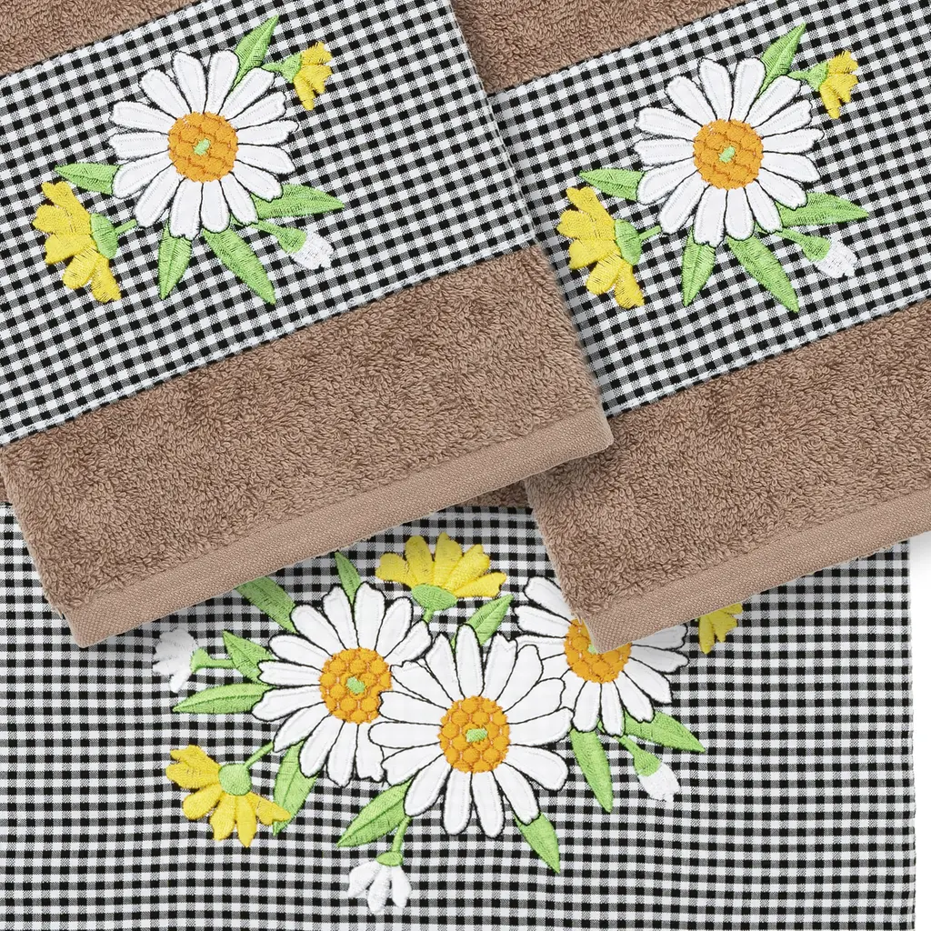 The Daisy Embellished Towel Collection features a fresh bouquet embroidered on a textured gingham check cloth border. These soft and luxurious towels are made of 100% premium Turkish Cotton and offer lasting absorbency and superior durability.100% Premium Turkish Cotton Superbly absorbent and quick drying Available in a range of lovely towel colors Machine wash cold, No bleach, line dry or dry clean Set includes 1 bath towel (27" x 54") / 2 hand towels (16" x 30") Made in Turkey • Proudly Embellished in USA