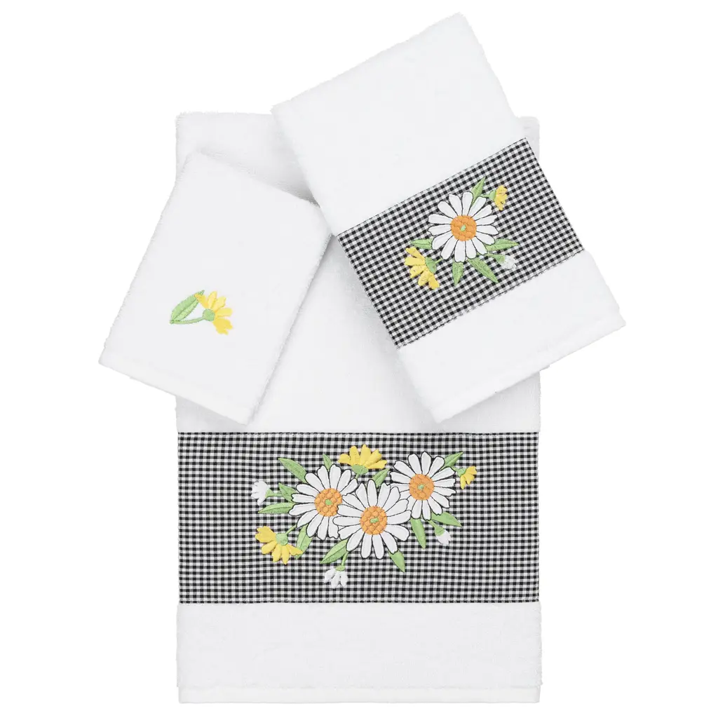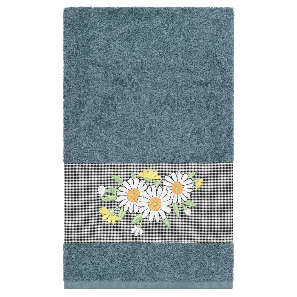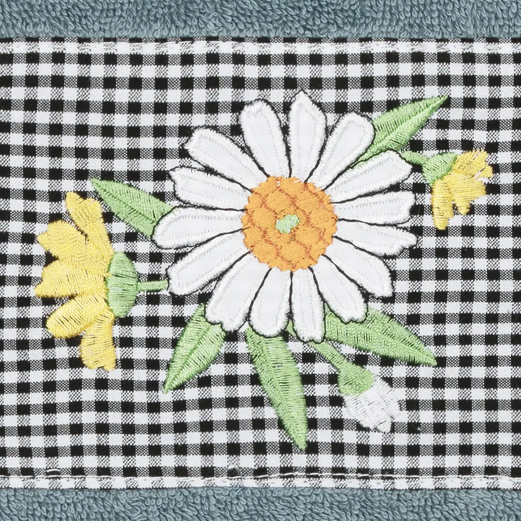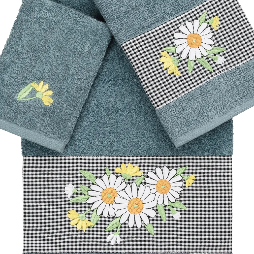 The Daisy Embellished Towel Collection features a fresh bouquet embroidered on a textured gingham check cloth border. These soft and luxurious towels are made of 100% premium Turkish Cotton and offer lasting absorbency and superior durability.100% Premium Turkish Cotton Superbly absorbent and quick drying Available in a range of lovely towel colors Machine wash cold, No bleach, line dry or dry clean Set includes 1 bath towel (27" x 54") / 1 hand towel (16" x 30") / 1 washcloth (13" x 13") Made in Turkey Proudly Embellished in USA