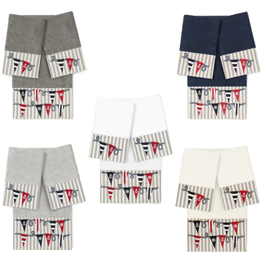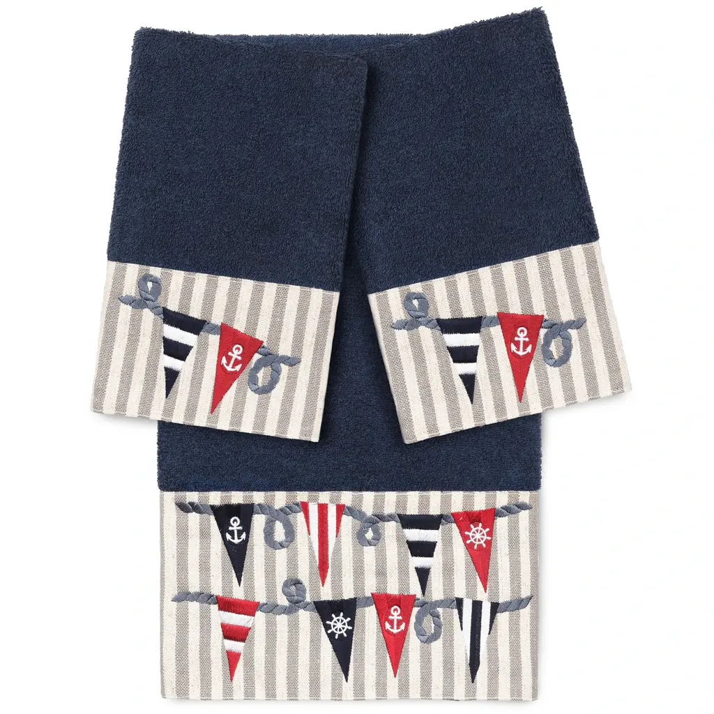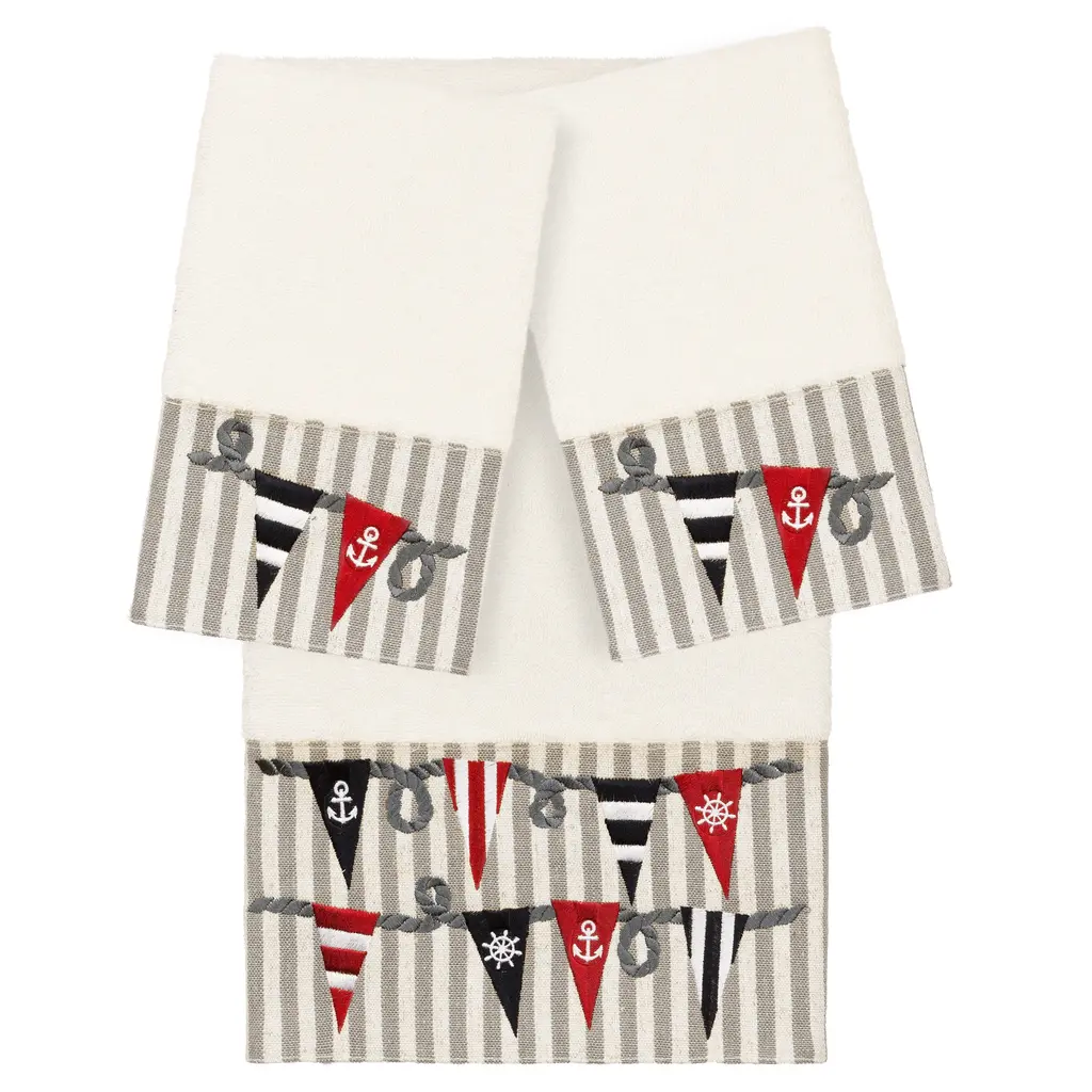 The Ethan Embellished Towel Collection features festive ship's flags embroidered on a beachy stripe border. These soft and luxurious towels are made of 100% premium Turkish Cotton and offer lasting absorbency and superior durability. 100% Premium Turkish Cotton Superbly absorbent and quick drying Available in a range of lovely towel colors Machine wash cold, No bleach, line dry or dry clean Set includes 1 bath towel (27" x 54") / 2 hand towels (16" x 30") Made in Turkey