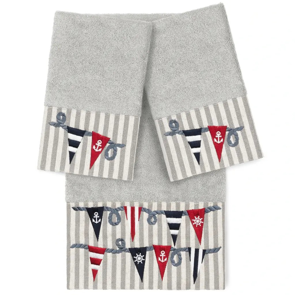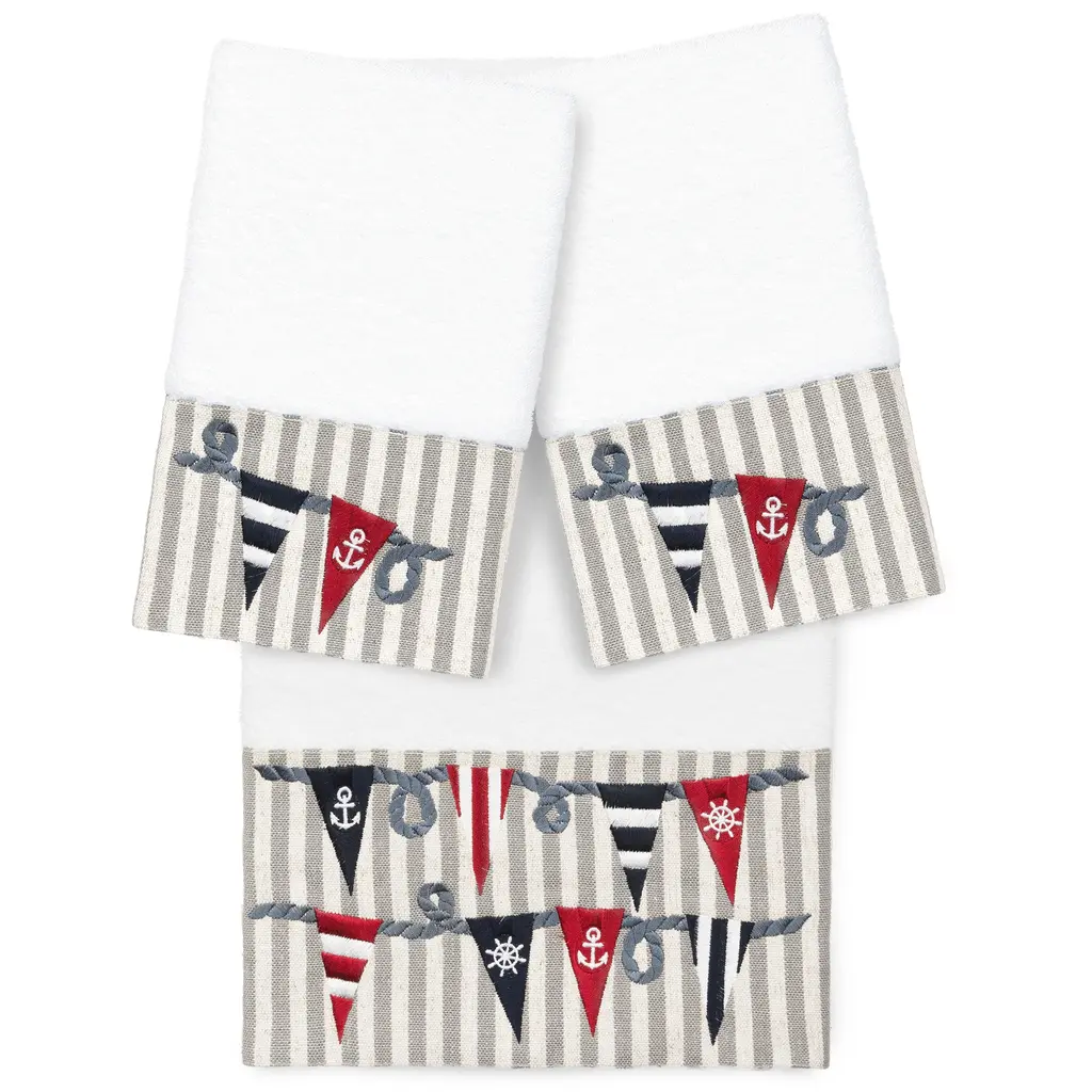 The Ethan Embellished Towel Collection features festive ship's flags embroidered on a beachy stripe border. These soft and luxurious towels are made of 100% premium Turkish Cotton and offer lasting absorbency and superior durability. 100% Premium Turkish Cotton Superbly absorbent and quick drying Available in a range of lovely towel colors Machine wash cold, No bleach, line dry or dry clean Set includes 1 bath towel (27" x 54") / 2 hand towels (16" x 30") Made in Turkey