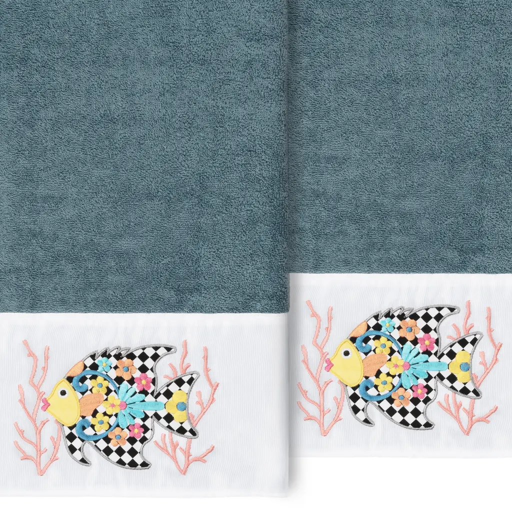 The Feliz Embellished Towel Collection by Authentic Hotel and Spa features a colorful and festive applique fish motif, embroidered on a lustrous ribbed texture cloth border. These soft and luxurious towels are made of 100% premium Turkish Cotton and offer lasting absorbency and superior durability.100% Premium Turkish CottonSuperbly absorbent and quick dryingAvailable in a range of lovely towel colorsMachine wash cold, No bleach, line dry or dry cleanSet includes 2 bath towels (27" x 54")Made in TurkeyProudly Embellished in USA