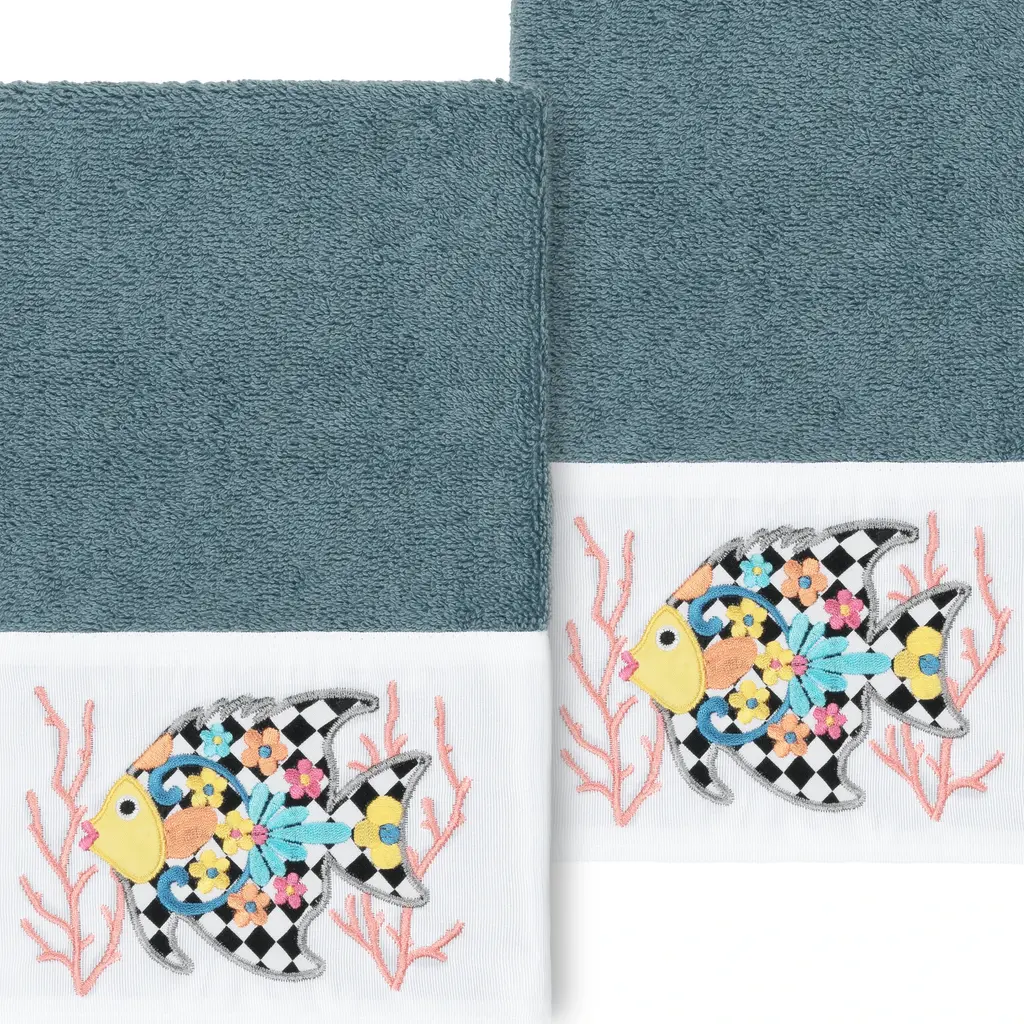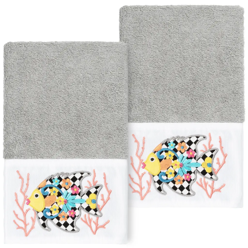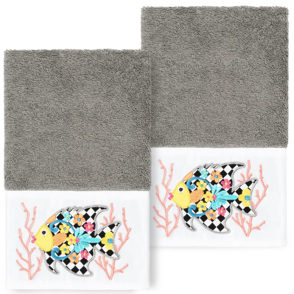 The Feliz Embellished Towel Collection by Authentic Hotel and Spa features a colorful and festive applique fish motif, embroidered on a lustrous ribbed texture cloth border. These soft and luxurious towels are made of 100% premium Turkish Cotton and offer lasting absorbency and superior durability.100% Premium Turkish CottonSuperbly absorbent and quick dryingAvailable in a range of lovely towel colorsMachine wash cold, No bleach, line dry or dry cleanSet includes 2 hand towels (16" x 30")Made in TurkeyProudly Embellished in USA