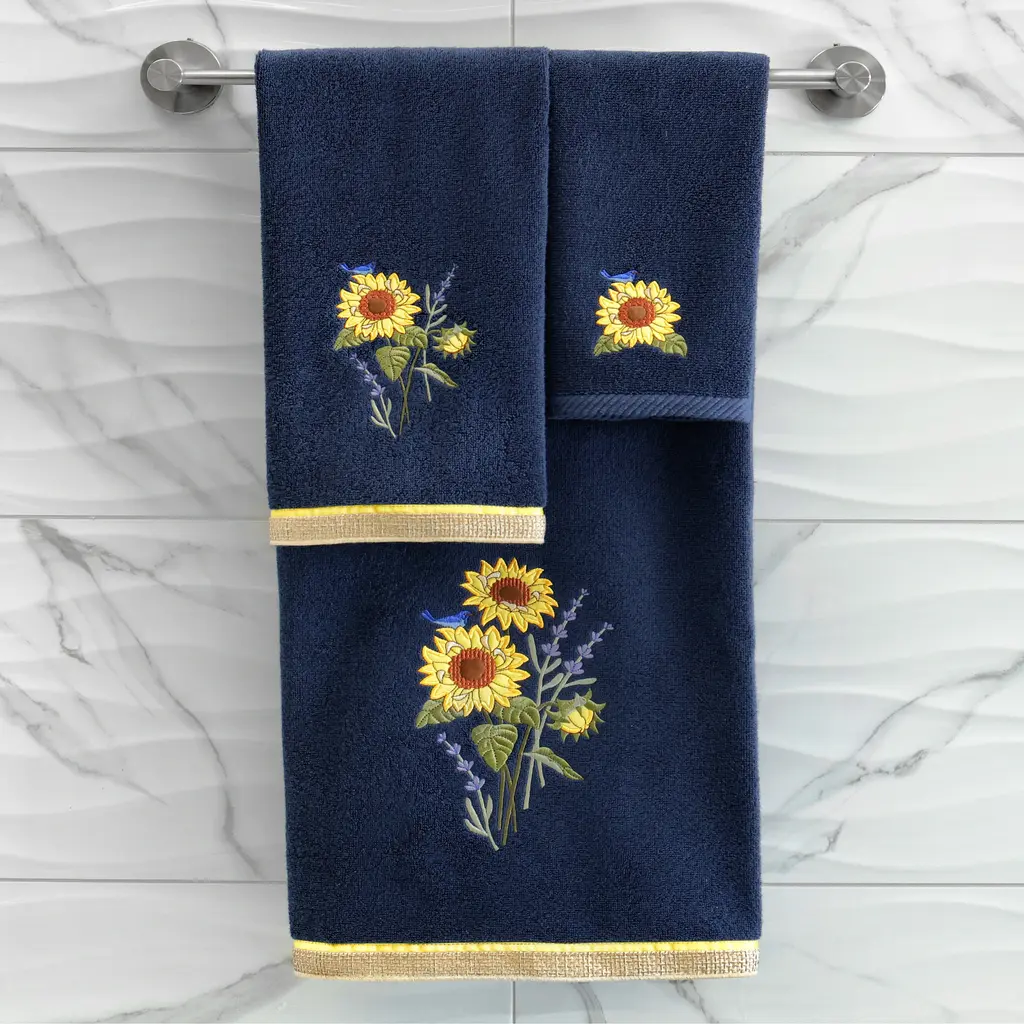 Create a mood of country charm in your bath with the Girasol Embellished Towel Collection by Authentic Hotel and Spa. These towels feature an applique embroidered bouquet of vibrant sunflowers and lavender, highlighted by a bright bird perched on top. Cloud soft and super absorbent, these luxurious, durable towels keep their plush appearance after washing. This collection is available in 8 elegant colors: White, Beige, Blush, Aqua, Silver, Cocoa, Charcoal and Marine. The Girasol Towel Collection brings a natural spirit and richness to your home decor and makes a great gift!Embroidered Bouquet design 100% Premium Turkish Cotton Superbly absorbent and quick drying Available in 8 elegant colors Machine wash cold, No bleach, line dry or dry clean Set includes 2 hand towels (16" x 30") Made in Turkey Proudly Embellished in USA