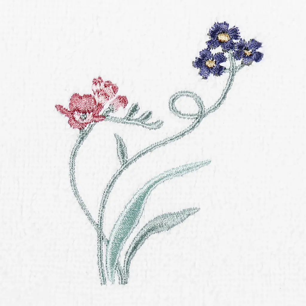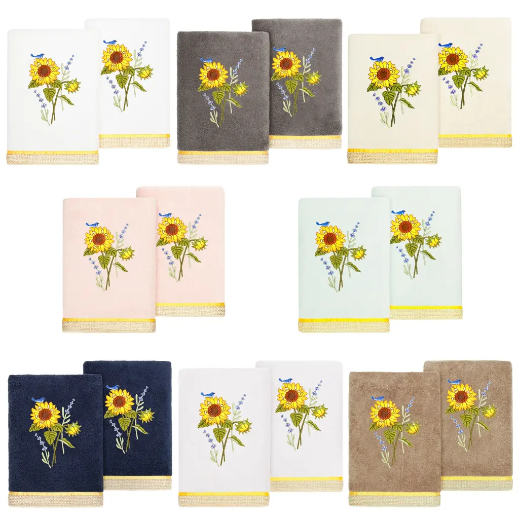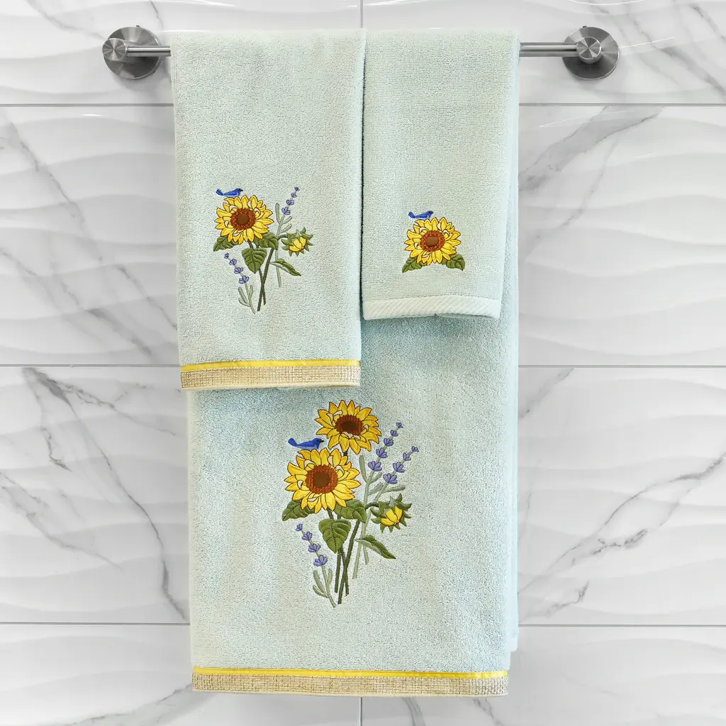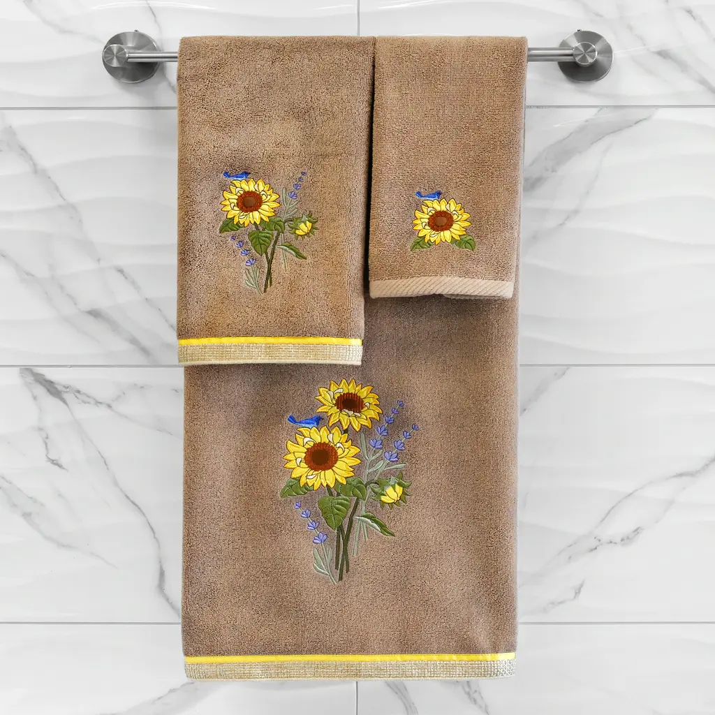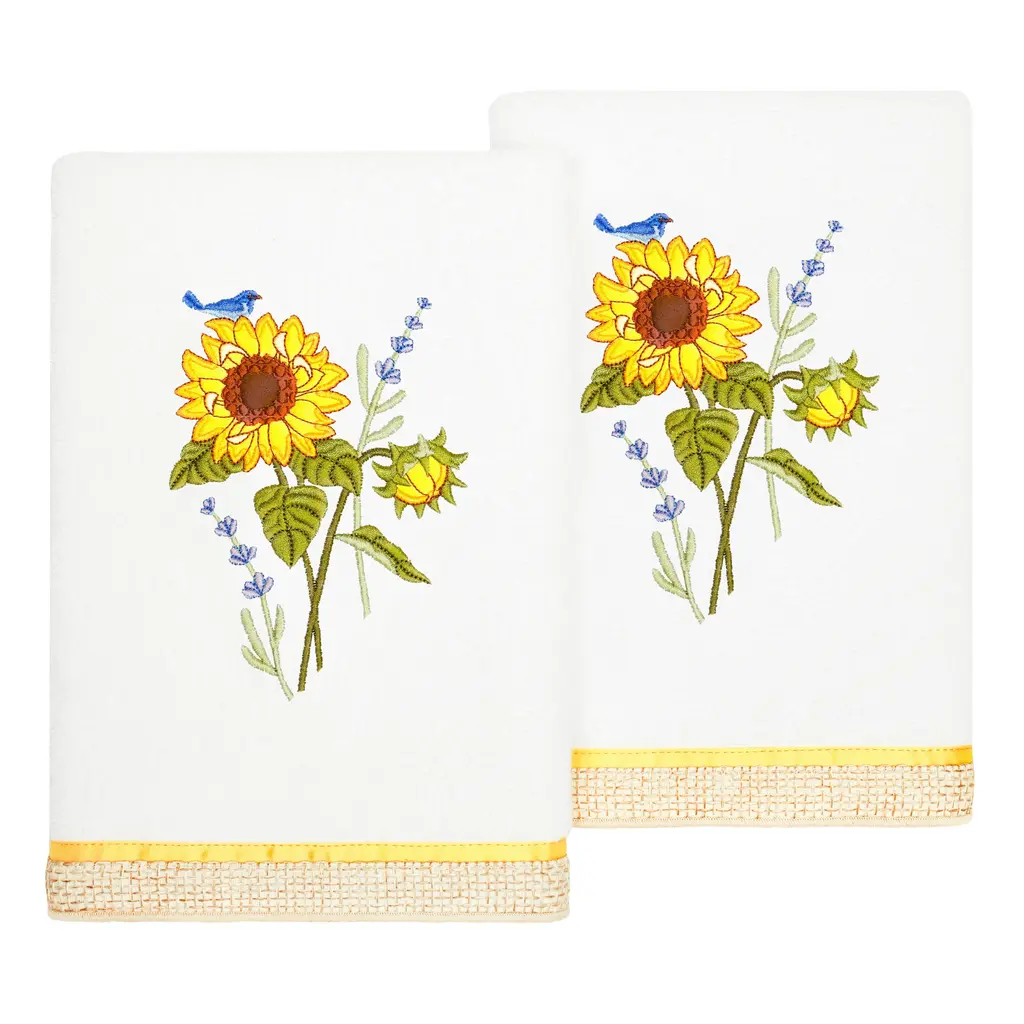 Create a mood of country charm in your bath with the Girasol Embellished Towel Collection by Authentic Hotel and Spa. These towels feature an applique embroidered bouquet of vibrant sunflowers and lavender, highlighted by a bright bird perched on top. Cloud soft and super absorbent, these luxurious, durable towels keep their plush appearance after washing. This collection is available in 8 elegant colors: White, Beige, Blush, Aqua, Silver, Cocoa, Charcoal and Marine. The Girasol Towel Collection brings a natural spirit and richness to your home decor and makes a great gift!Embroidered Bouquet design 100% Premium Turkish Cotton Superbly absorbent and quick drying Available in 8 elegant colors Machine wash cold, No bleach, line dry or dry clean Set includes 2 hand towels (16" x 30") Made in Turkey Proudly Embellished in USA