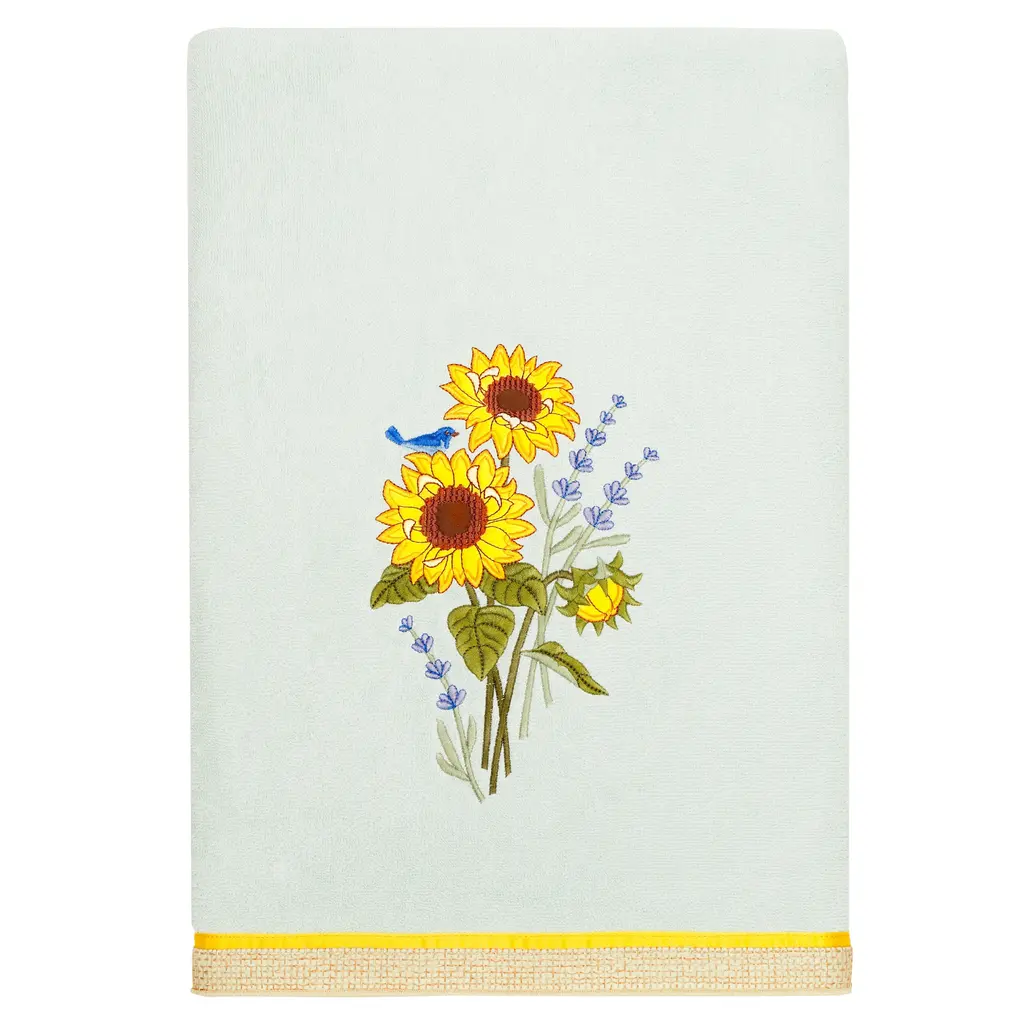 Create a mood of country charm in your bath with the Girasol Embellished Towel Collection by Authentic Hotel and Spa. These towels feature an applique embroidered bouquet of vibrant sunflowers and lavender, highlighted by a bright bird perched on top. Cloud soft and super absorbent, these luxurious, durable towels keep their plush appearance after washing. This collection is available in 8 elegant colors: White, Beige, Blush, Aqua, Silver, Cocoa, Charcoal and Marine. The Girasol Towel Collection brings a natural spirit and richness to your home decor and makes a great gift!Embroidered Bouquet design 100% Premium Turkish Cotton Superbly absorbent and quick drying Available in 8 elegant colors Machine wash cold, No bleach, line dry or dry clean Set includes 2 bath towels (27" x 54") / 2 hand towels (16" x 30") Made in Turkey Proudly Embellished in USA