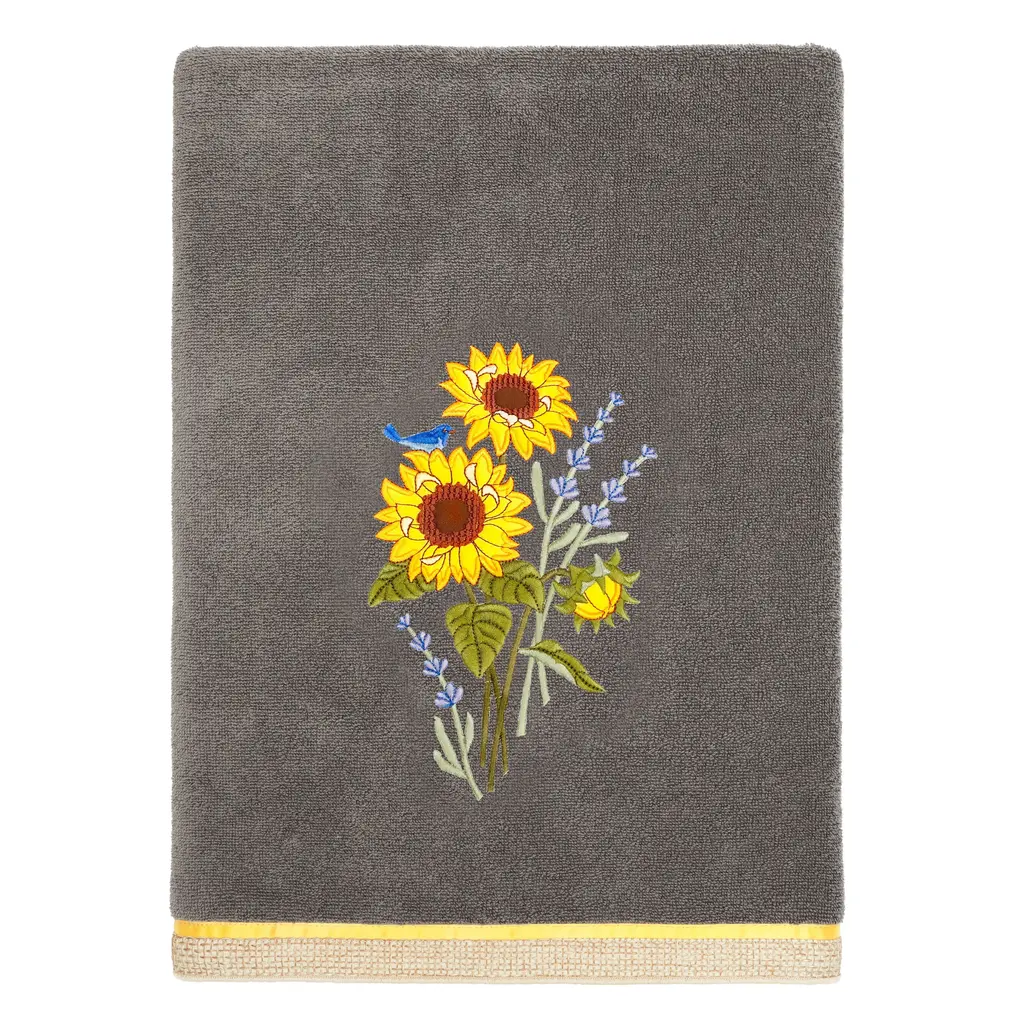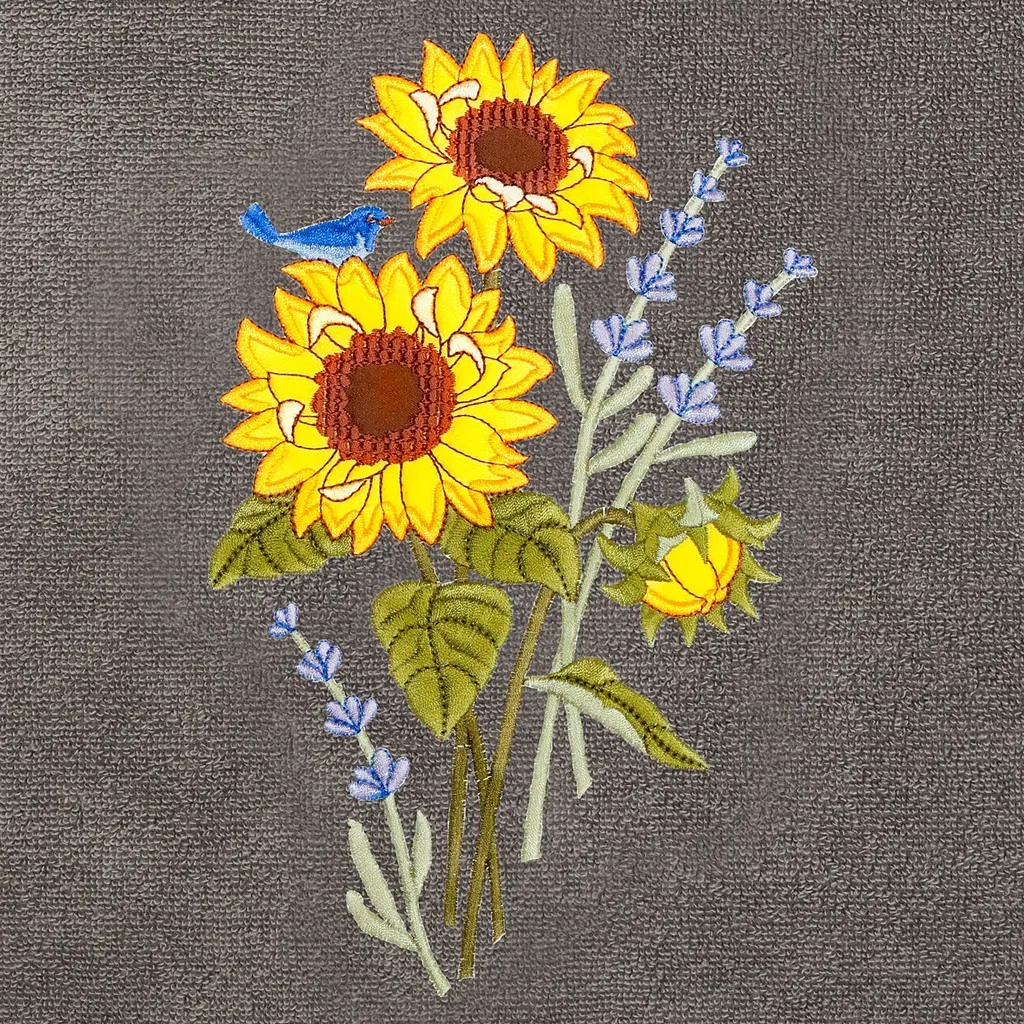 Create a mood of country charm in your bath with the Girasol Embellished Towel Collection by Authentic Hotel and Spa. These towels feature an applique embroidered bouquet of vibrant sunflowers and lavender, highlighted by a bright bird perched on top. Cloud soft and super absorbent, these luxurious, durable towels keep their plush appearance after washing. This collection is available in 8 elegant colors: White, Beige, Blush, Aqua, Silver, Cocoa, Charcoal and Marine. The Girasol Towel Collection brings a natural spirit and richness to your home decor and makes a great gift!Embroidered Bouquet design 100% Premium Turkish Cotton Superbly absorbent and quick drying Available in 8 elegant colors Machine wash cold, No bleach, line dry or dry clean Set includes 2 bath towels (27" x 54") / 2 hand towels (16" x 30") Made in Turkey Proudly Embellished in USA