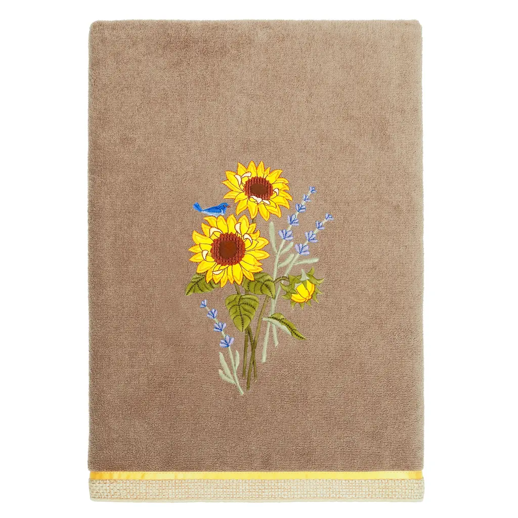 Create a mood of country charm in your bath with the Girasol Embellished Towel Collection by Authentic Hotel and Spa. These towels feature an applique embroidered bouquet of vibrant sunflowers and lavender, highlighted by a bright bird perched on top. Cloud soft and super absorbent, these luxurious, durable towels keep their plush appearance after washing. This collection is available in 8 elegant colors: White, Beige, Blush, Aqua, Silver, Cocoa, Charcoal and Marine. The Girasol Towel Collection brings a natural spirit and richness to your home decor and makes a great gift!Embroidered Bouquet design 100% Premium Turkish Cotton Superbly absorbent and quick drying Available in 8 elegant colors Machine wash cold, No bleach, line dry or dry clean Set includes 2 bath towels (27" x 54") / 2 hand towels (16" x 30") Made in Turkey Proudly Embellished in USA