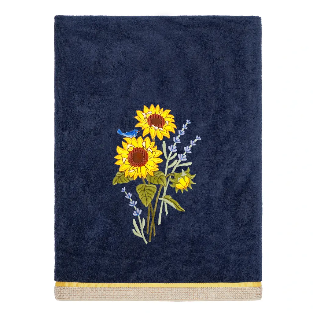 Create a mood of country charm in your bath with the Girasol Embellished Towel Collection by Authentic Hotel and Spa. These towels feature an applique embroidered bouquet of vibrant sunflowers and lavender, highlighted by a bright bird perched on top. Cloud soft and super absorbent, these luxurious, durable towels keep their plush appearance after washing. This collection is available in 8 elegant colors: White, Beige, Blush, Aqua, Silver, Cocoa, Charcoal and Marine. The Girasol Towel Collection brings a natural spirit and richness to your home decor and makes a great gift!Embroidered Bouquet design 100% Premium Turkish Cotton Superbly absorbent and quick drying Available in 8 elegant colors Machine wash cold, No bleach, line dry or dry clean Set includes 2 bath towels (27" x 54") / 2 hand towels (16" x 30") Made in Turkey Proudly Embellished in USA