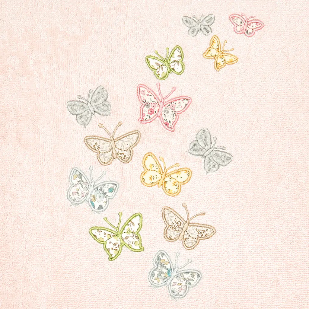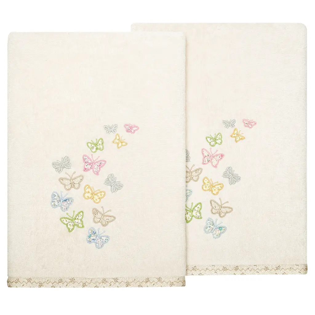 Your decorations are not complete without exquisite embroidered towels for the comfort of your family and guests. The Mariposa towels feature calico applique butterflies and are trimmed with a calico border. Cloud soft and super absorbent, these luxurious, durable towels keep their plush appearance after washing. The Mariposa Towel Collection brings a cottage spirit and richness to your home decor and makes a great gift!Embroidered Butterfly design 100% Premium Turkish Cotton Superbly absorbent and quick drying Available in a range of lovely towel colors Machine wash cold, No bleach, line dry or dry clean Set includes 2 bath towels (27" x 54") Made in Turkey Proudly Embellished in USA