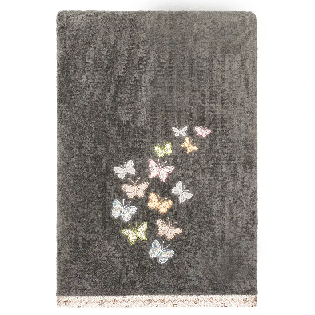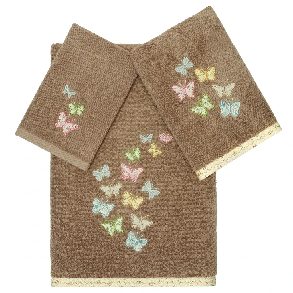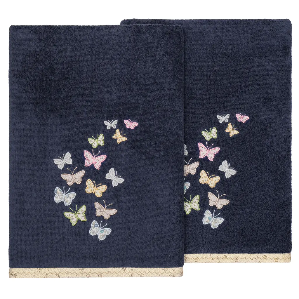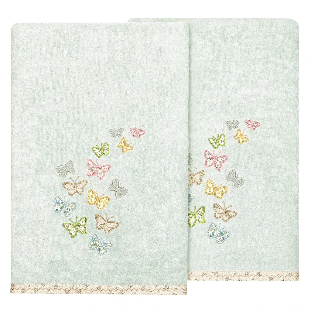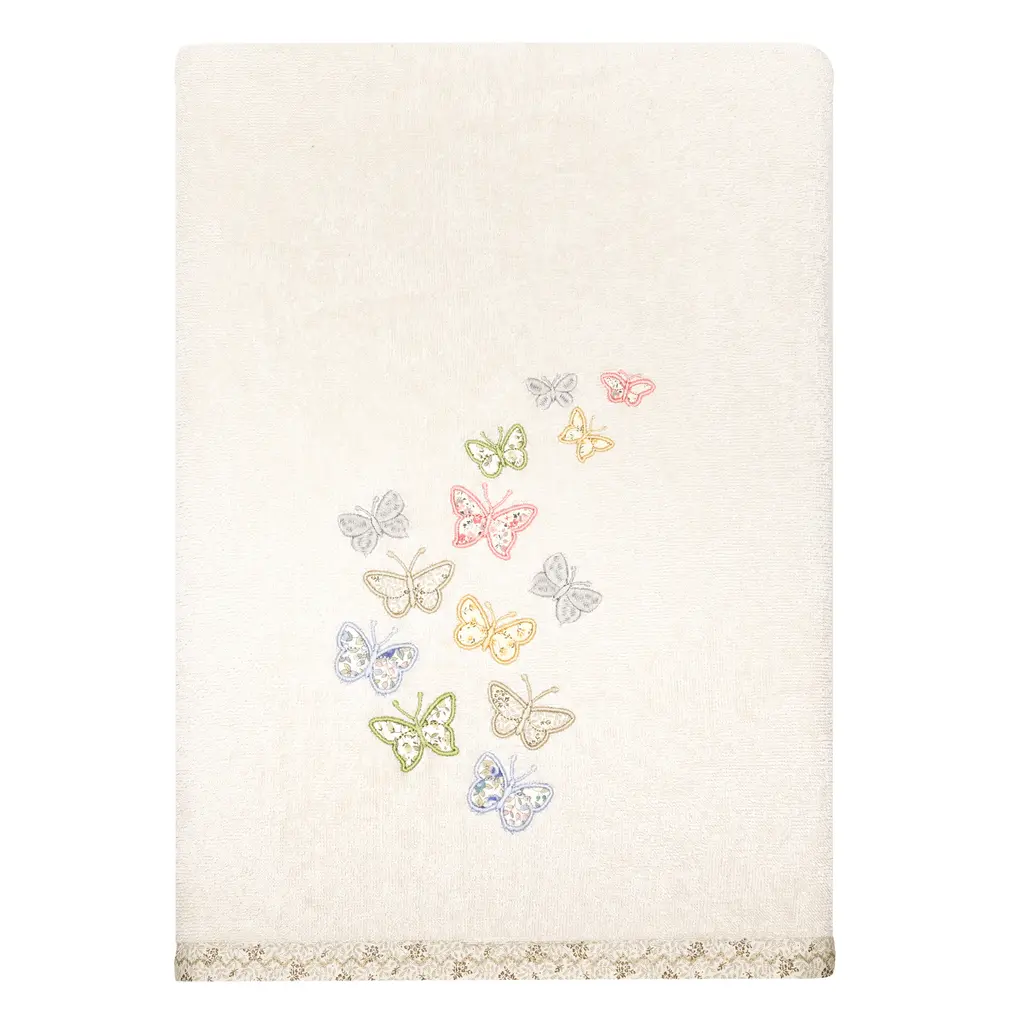 Your decorations are not complete without exquisite embroidered towels for the comfort of your family and guests. The Mariposa towels feature calico applique butterflies and are trimmed with a calico border. Cloud soft and super absorbent, these luxurious, durable towels keep their plush appearance after washing. The Mariposa Towel Collection brings a cottage spirit and richness to your home decor and makes a great gift!Embroidered Butterfly design 100% Premium Turkish Cotton Superbly absorbent and quick drying Available in a range of lovely towel colors Machine wash cold, No bleach, line dry or dry clean Set includes 2 bath towels (27" x 54") Made in Turkey Proudly Embellished in USA