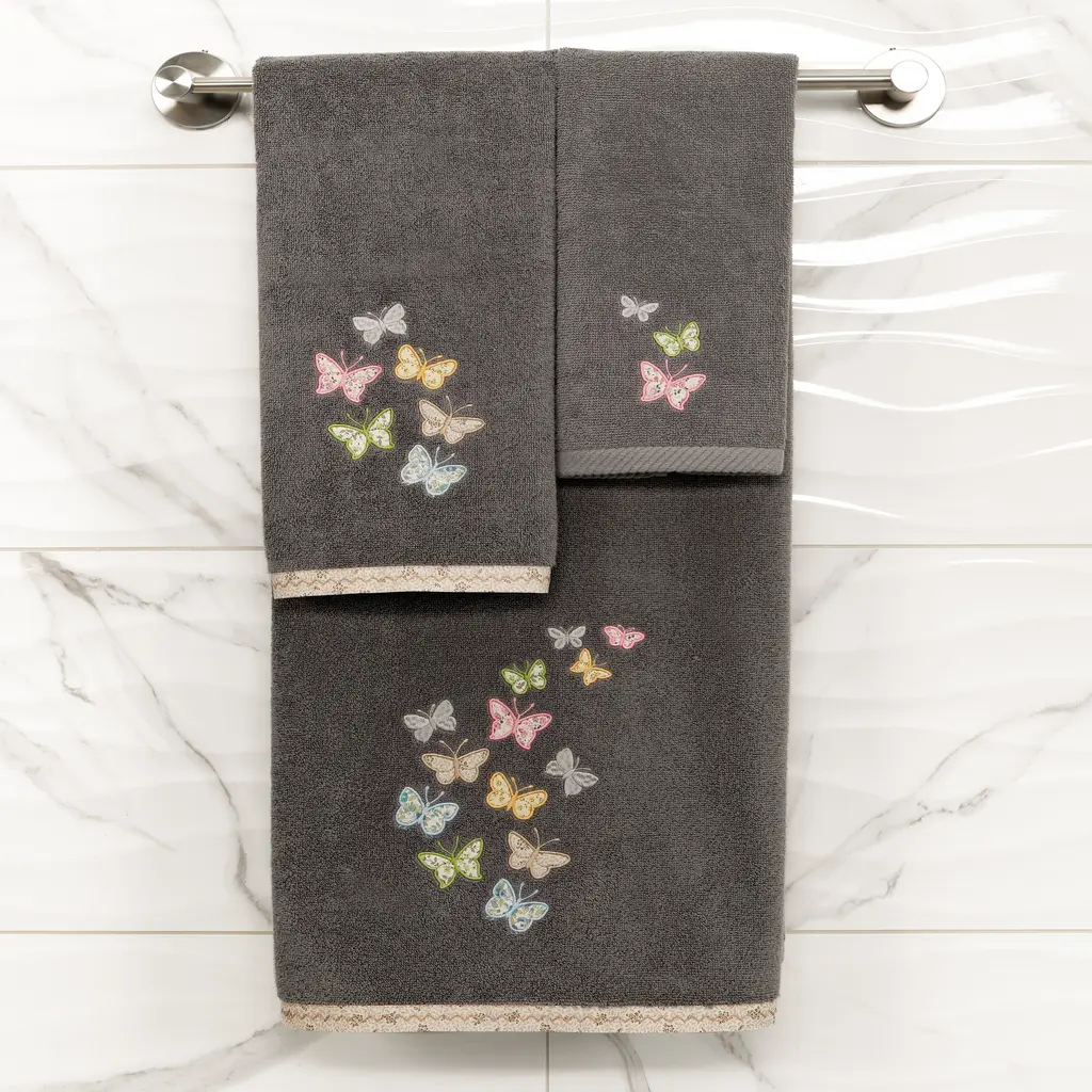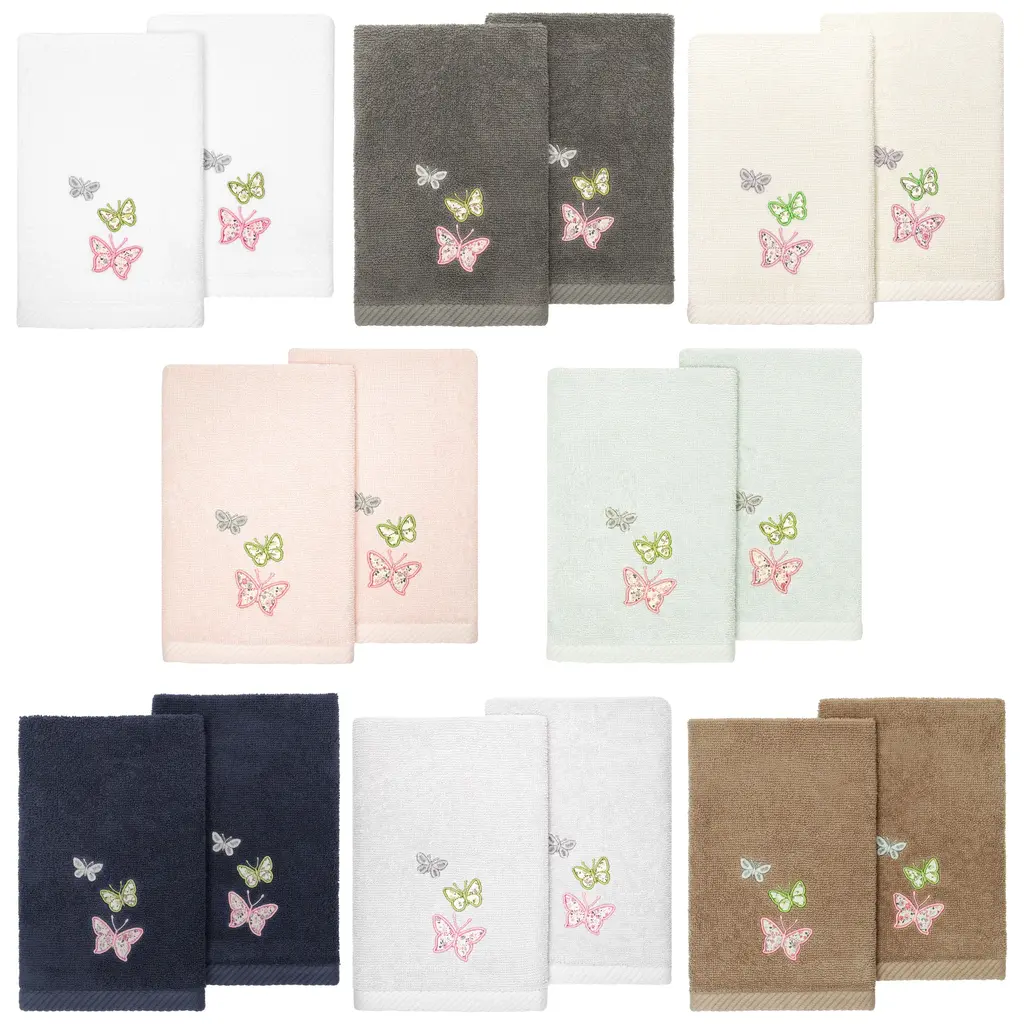 Your decorations are not complete without exquisite embroidered towels for the comfort of your family and guests. The Mariposa towels feature calico applique butterflies and are trimmed with a calico border. Cloud soft and super absorbent, these luxurious, durable towels keep their plush appearance after washing. The Mariposa Towel Collection brings a cottage spirit and richness to your home decor and makes a great gift!Embroidered Butterfly design 100% Premium Turkish Cotton Superbly absorbent and quick drying Available in a range of lovely towel colors Machine wash cold, No bleach, line dry or dry clean Set includes 2 fingertip towels (11" x 18") Made in Turkey Proudly Embellished in USA