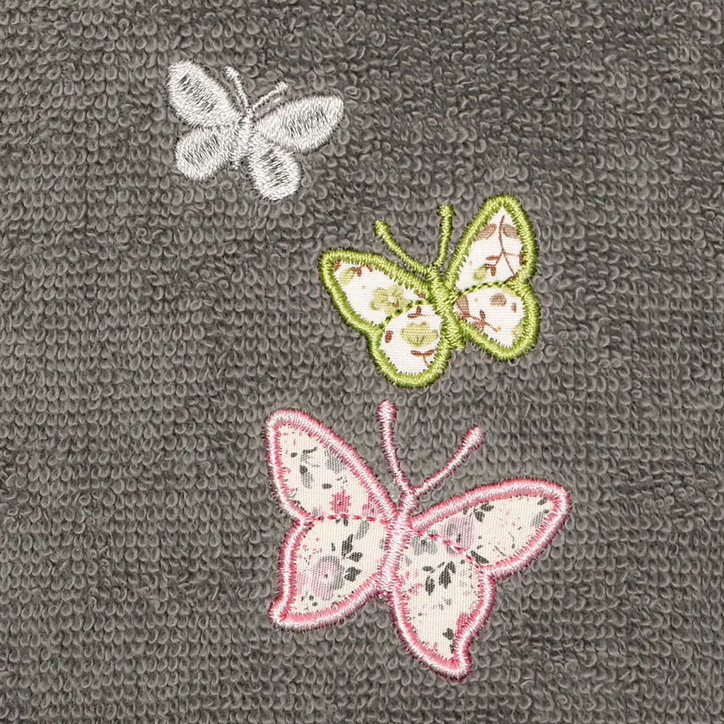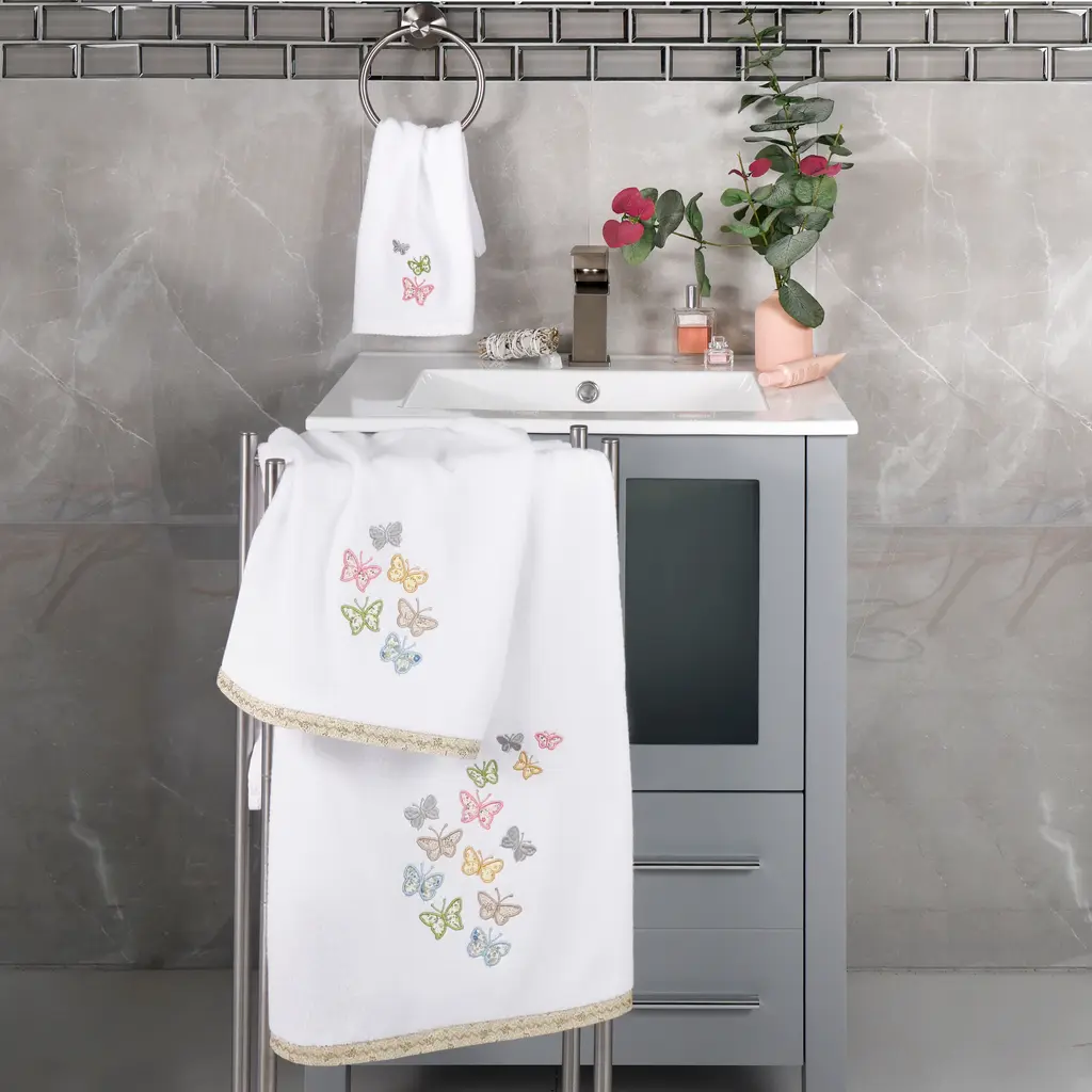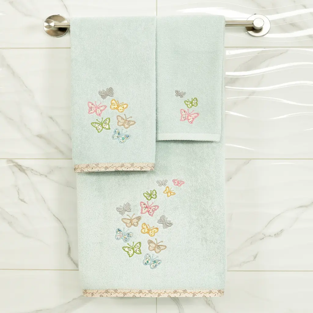 Your decorations are not complete without exquisite embroidered towels for the comfort of your family and guests. The Mariposa towels feature calico applique butterflies and are trimmed with a calico border. Cloud soft and super absorbent, these luxurious, durable towels keep their plush appearance after washing. The Mariposa Towel Collection brings a cottage spirit and richness to your home decor and makes a great gift!Embroidered Butterfly design 100% Premium Turkish Cotton Superbly absorbent and quick drying Available in a range of lovely towel colors Machine wash cold, No bleach, line dry or dry clean Set includes 2 fingertip towels (11" x 18") Made in Turkey Proudly Embellished in USA