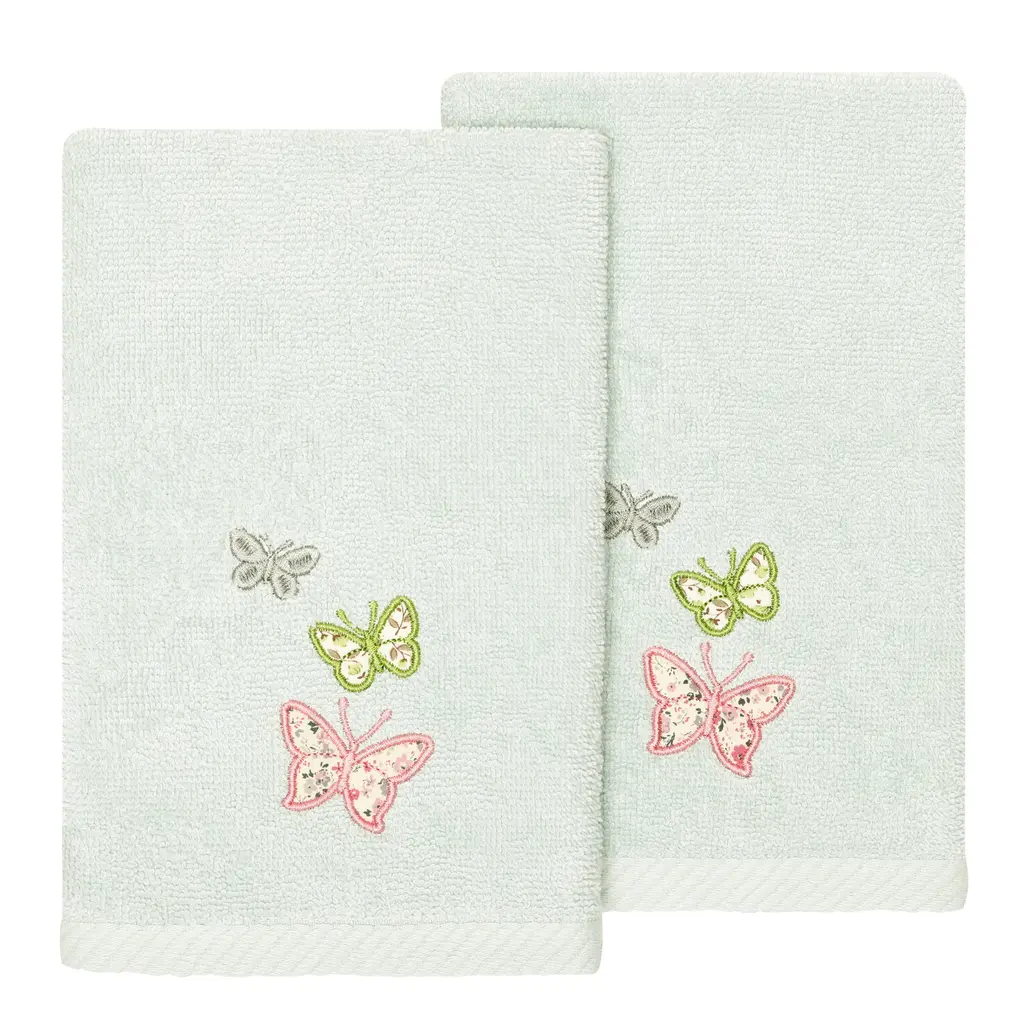 Your decorations are not complete without exquisite embroidered towels for the comfort of your family and guests. The Mariposa towels feature calico applique butterflies and are trimmed with a calico border. Cloud soft and super absorbent, these luxurious, durable towels keep their plush appearance after washing. The Mariposa Towel Collection brings a cottage spirit and richness to your home decor and makes a great gift!Embroidered Butterfly design 100% Premium Turkish Cotton Superbly absorbent and quick drying Available in a range of lovely towel colors Machine wash cold, No bleach, line dry or dry clean Set includes 2 fingertip towels (11" x 18") Made in Turkey Proudly Embellished in USA
