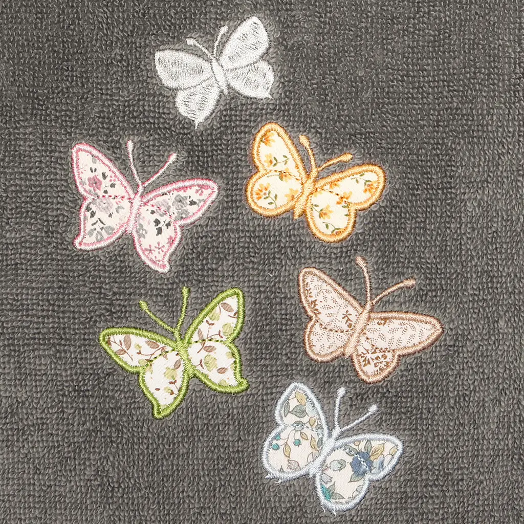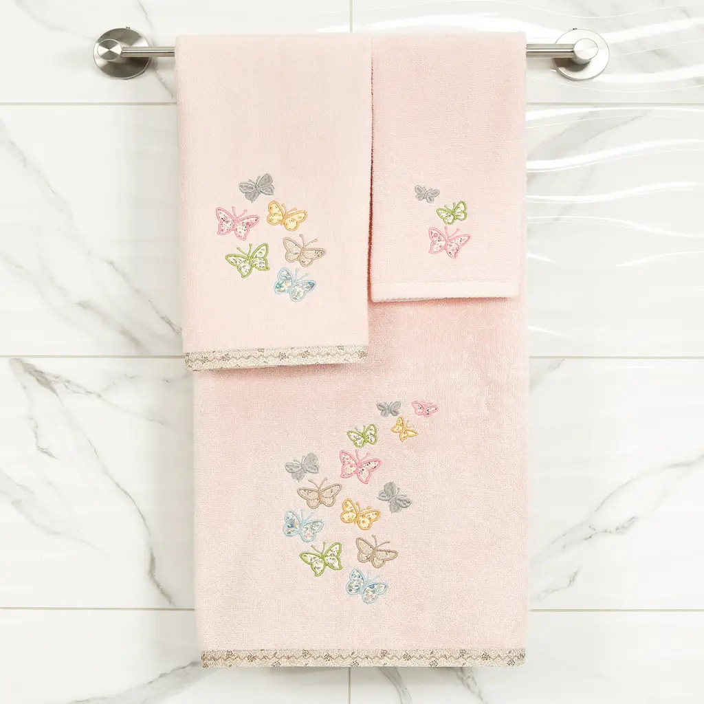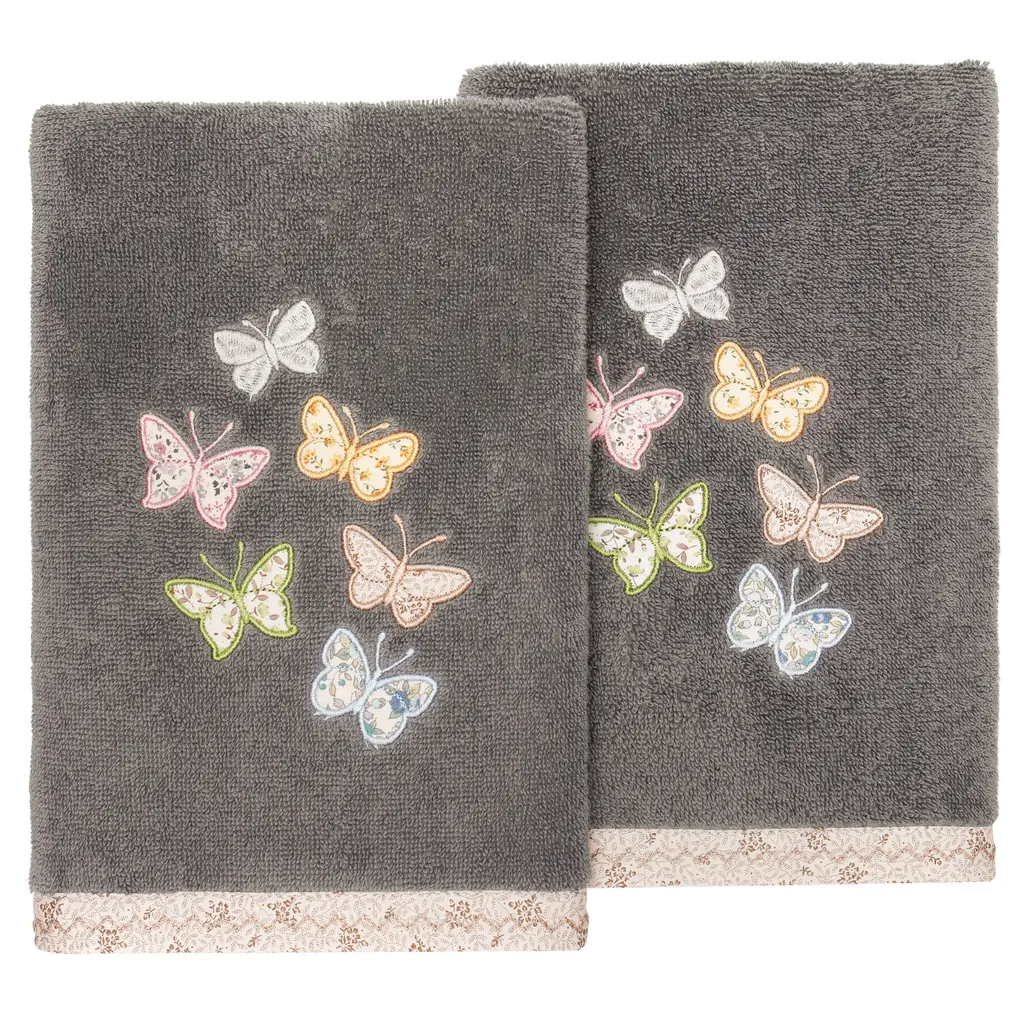 Your decorations are not complete without exquisite embroidered towels for the comfort of your family and guests. The Mariposa towels feature calico applique butterflies and are trimmed with a calico border. Cloud soft and super absorbent, these luxurious, durable towels keep their plush appearance after washing. The Mariposa Towel Collection brings a cottage spirit and richness to your home decor and makes a great gift!Embroidered Butterfly design 100% Premium Turkish Cotton Superbly absorbent and quick drying Available in a range of lovely towel colors Machine wash cold, No bleach, line dry or dry clean Set includes 2 hand towels (16" x 30") Made in Turkey Proudly Embellished in USA