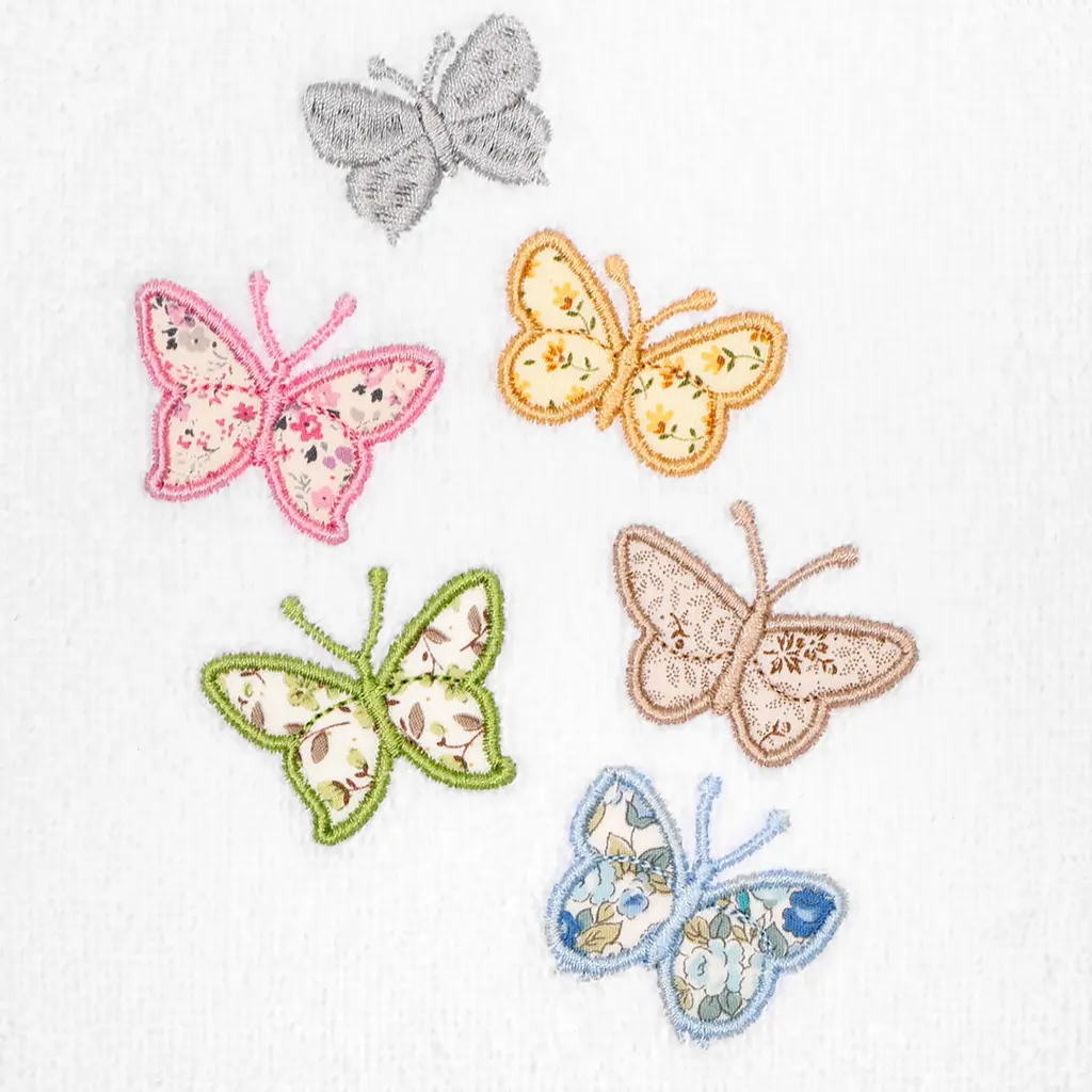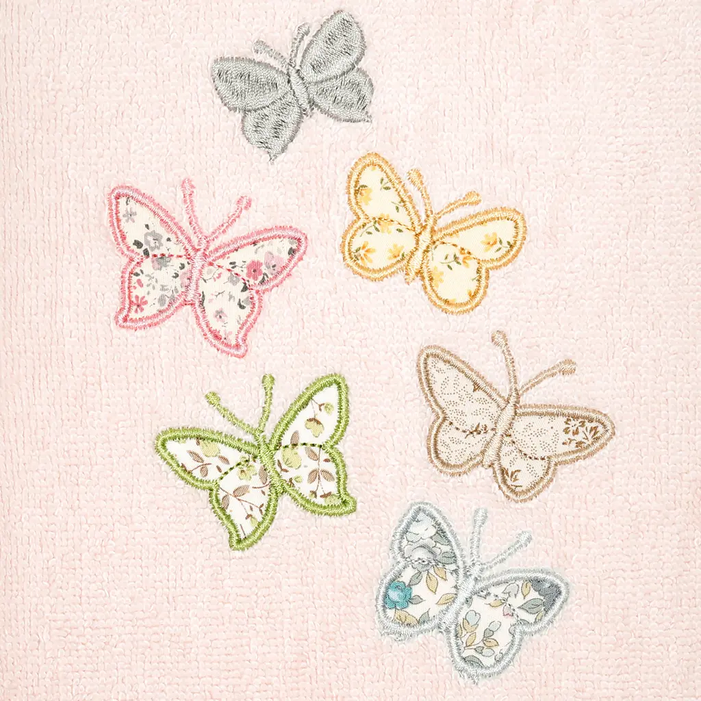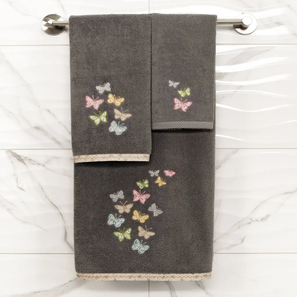 Your decorations are not complete without exquisite embroidered towels for the comfort of your family and guests. The Mariposa towels feature calico applique butterflies and are trimmed with a calico border. Cloud soft and super absorbent, these luxurious, durable towels keep their plush appearance after washing. The Mariposa Towel Collection brings a cottage spirit and richness to your home decor and makes a great gift!Embroidered Butterfly design 100% Premium Turkish Cotton Superbly absorbent and quick drying Available in a range of lovely towel colors Machine wash cold, No bleach, line dry or dry clean Set includes 2 hand towels (16" x 30") Made in Turkey Proudly Embellished in USA