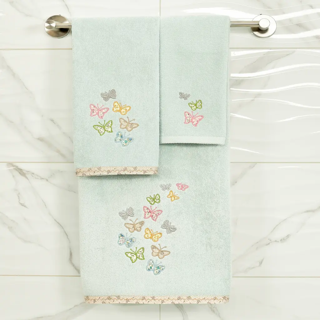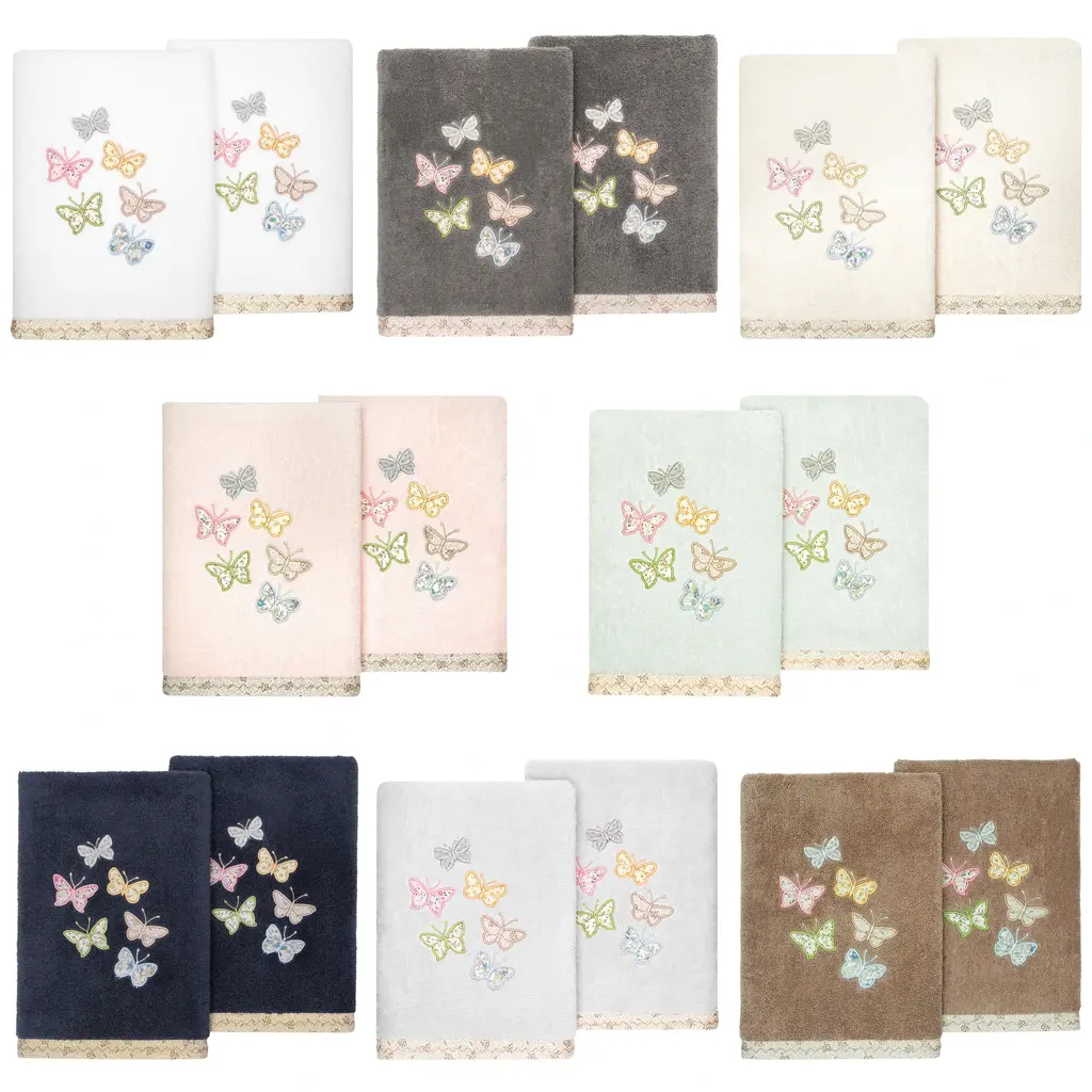 Your decorations are not complete without exquisite embroidered towels for the comfort of your family and guests. The Mariposa towels feature calico applique butterflies and are trimmed with a calico border. Cloud soft and super absorbent, these luxurious, durable towels keep their plush appearance after washing. The Mariposa Towel Collection brings a cottage spirit and richness to your home decor and makes a great gift!Embroidered Butterfly design 100% Premium Turkish Cotton Superbly absorbent and quick drying Available in a range of lovely towel colors Machine wash cold, No bleach, line dry or dry clean Set includes 2 hand towels (16" x 30") Made in Turkey Proudly Embellished in USA