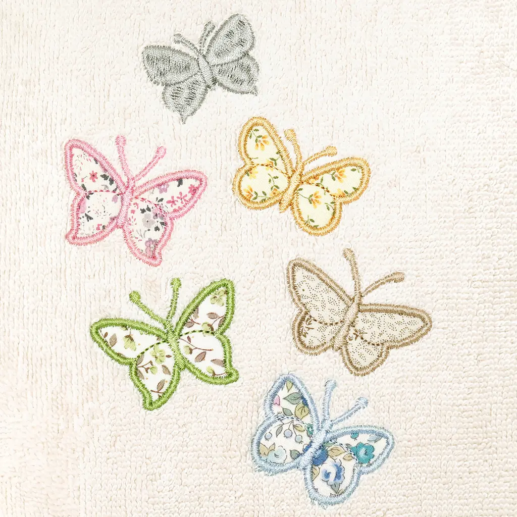 Your decorations are not complete without exquisite embroidered towels for the comfort of your family and guests. The Mariposa towels feature calico applique butterflies and are trimmed with a calico border. Cloud soft and super absorbent, these luxurious, durable towels keep their plush appearance after washing. The Mariposa Towel Collection brings a cottage spirit and richness to your home decor and makes a great gift!Embroidered Butterfly design 100% Premium Turkish Cotton Superbly absorbent and quick drying Available in a range of lovely towel colors Machine wash cold, No bleach, line dry or dry clean Set includes 1 bath towel (27" x 54") / 2 hand towels (16" x 30") Made in Turkey Proudly Embellished in USA