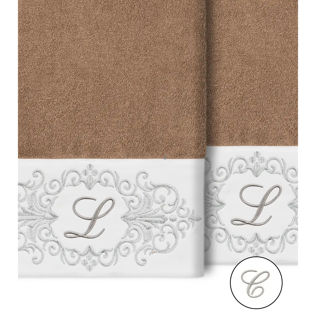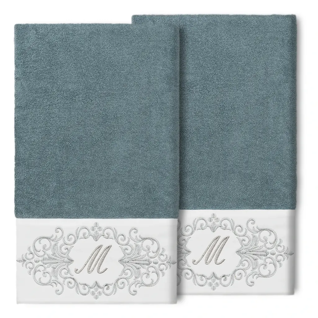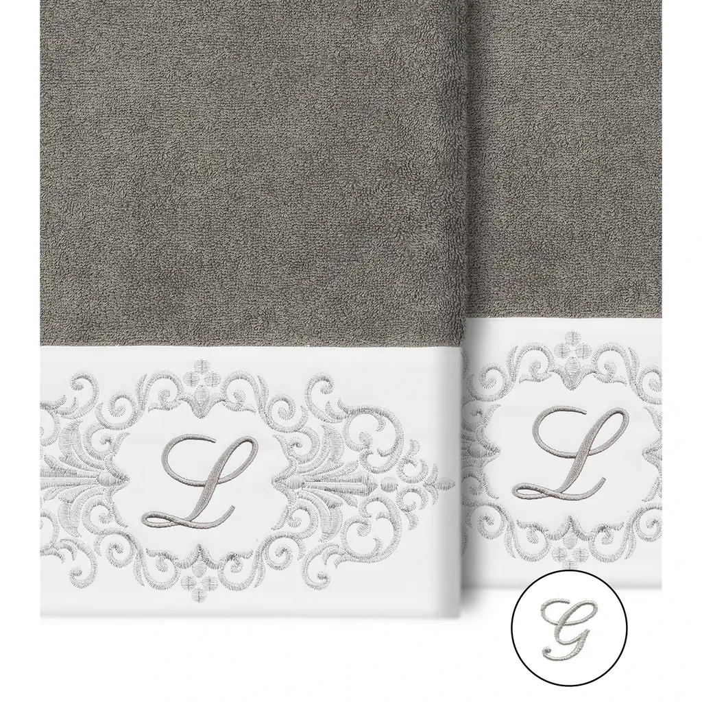 The Monica Embellished Towel Collection features an elegant metallic crest motif with your monogram embroidered on a crisp white border. These soft and luxurious towels are made of 100% premium Turkish Cotton and offer lasting absorbency and superior durability. 100% Premium Turkish Cotton Superbly absorbent and quick drying Available in a range of lovely towel colors Machine wash cold, No bleach, line dry or dry clean Set includes 2 bath towels (27" x 54") Embellished in USA Made in Turkey