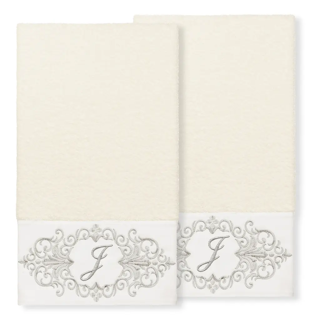 The Monica Embellished Towel Collection features an elegant metallic crest motif with your monogram embroidered on a crisp white border. These soft and luxurious towels are made of 100% premium Turkish Cotton and offer lasting absorbency and superior durability. 100% Premium Turkish Cotton Superbly absorbent and quick drying Available in a range of lovely towel colors Machine wash cold, No bleach, line dry or dry clean Set includes 2 bath towels (27" x 54") Embellished in USA Made in Turkey