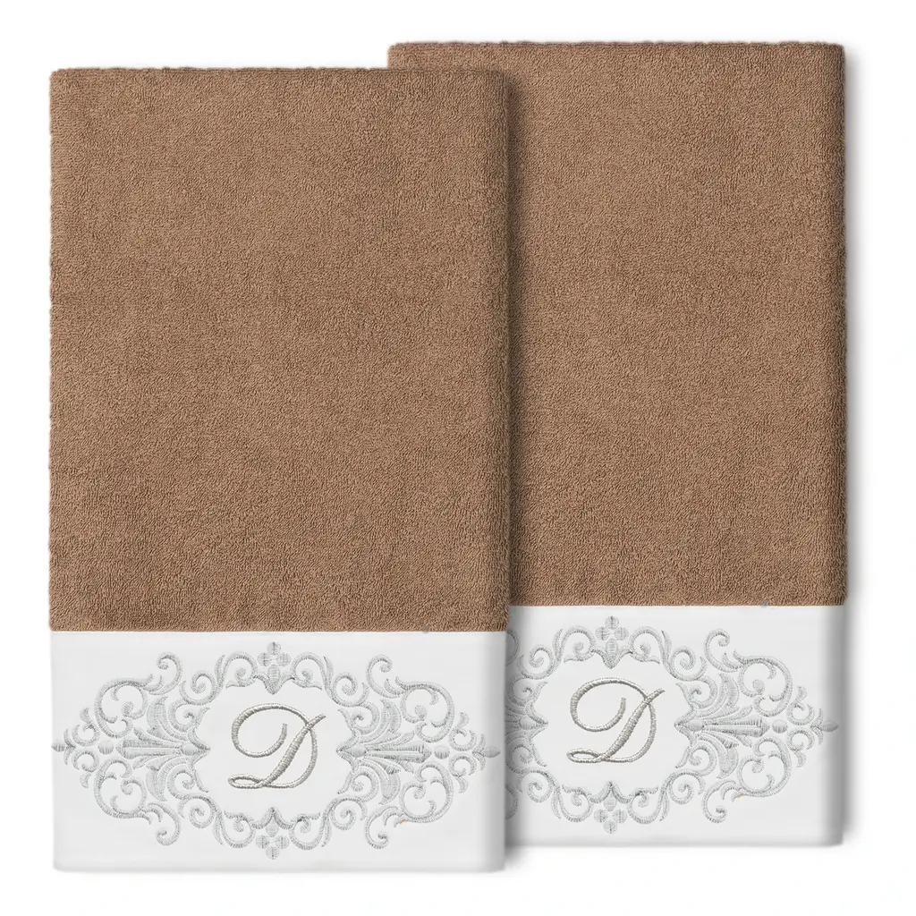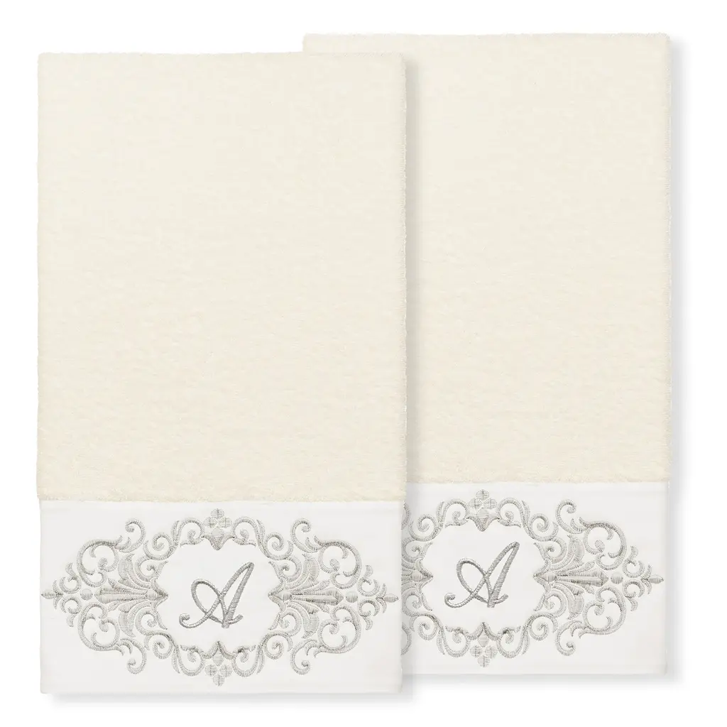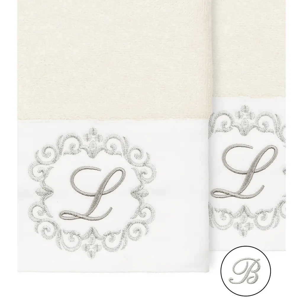 The Monica Embellished Towel Collection features an elegant metallic crest motif with your monogram embroidered on a crisp white border. These soft and luxurious towels are made of 100% premium Turkish Cotton and offer lasting absorbency and superior durability. 100% Premium Turkish Cotton Superbly absorbent and quick drying Available in a range of lovely towel colors Machine wash cold, No bleach, line dry or dry clean Set includes 2 bath towels (27" x 54") Embellished in USA Made in Turkey