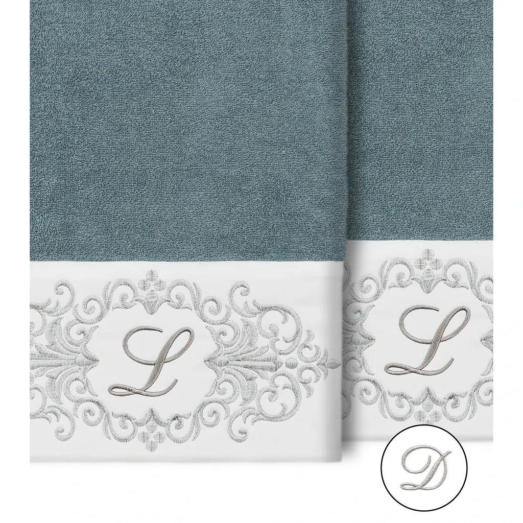 The Monica Embellished Towel Collection features an elegant metallic crest motif with your monogram embroidered on a crisp white border. These soft and luxurious towels are made of 100% premium Turkish Cotton and offer lasting absorbency and superior durability. 100% Premium Turkish Cotton Superbly absorbent and quick drying Available in a range of lovely towel colors Machine wash cold, No bleach, line dry or dry clean Set includes 2 bath towels (27" x 54") Embellished in USA Made in Turkey