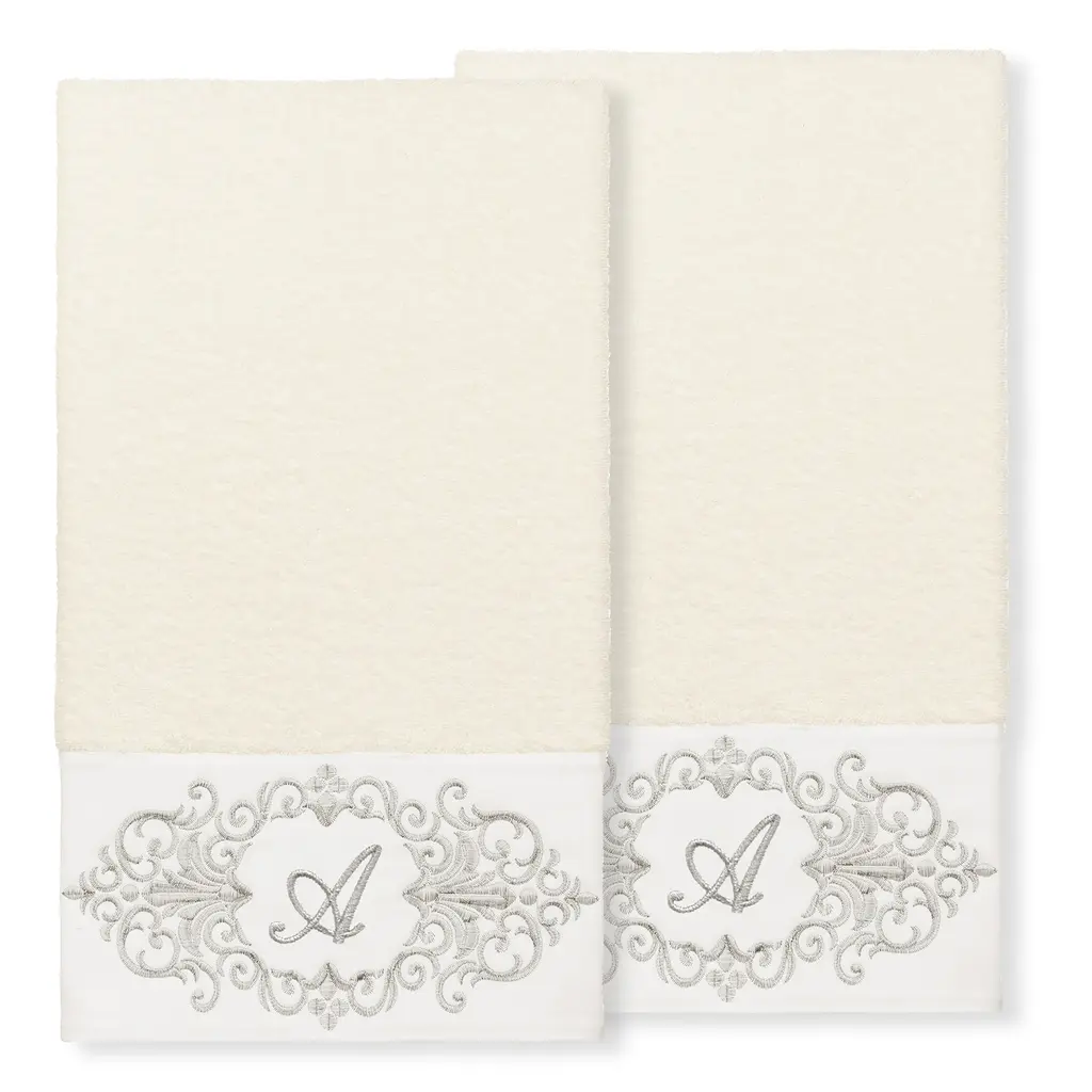 The Monica Embellished Towel Collection features an elegant metallic crest motif with your monogram embroidered on a crisp white border. These soft and luxurious towels are made of 100% premium Turkish Cotton and offer lasting absorbency and superior durability. 100% Premium Turkish Cotton Superbly absorbent and quick drying Available in a range of lovely towel colors Machine wash cold, No bleach, line dry or dry clean Set includes 2 bath towels (27" x 54") Embellished in USA Made in Turkey