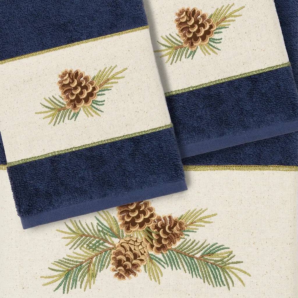 The Pierre Embellished Towel Collection by Authentic Hotel and Spa features a rustic pinecones on branches motif, embroidered on a natural cotton osnaburg cloth border. These soft and luxurious towels are made of 100% premium Turkish Cotton and offer lasting absorbency and superior durability.100% Premium Turkish Cotton Superbly absorbent and quick drying Available in a range of lovely towel colors Machine wash cold, No bleach, line dry or dry clean Set includes 1 bath towel (27" x 54") / 2 hand towels (16" x 30") Made in Turkey Proudly Embellished in USA
