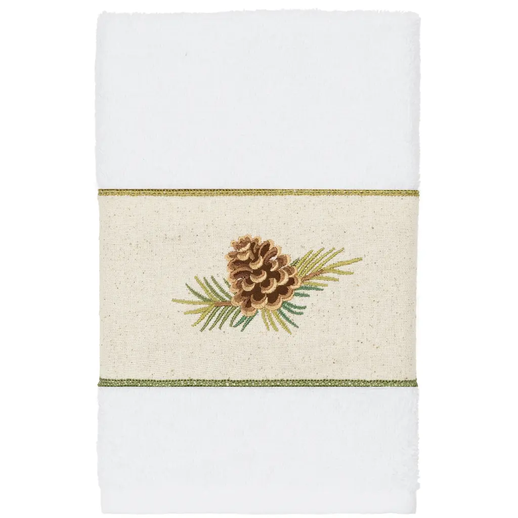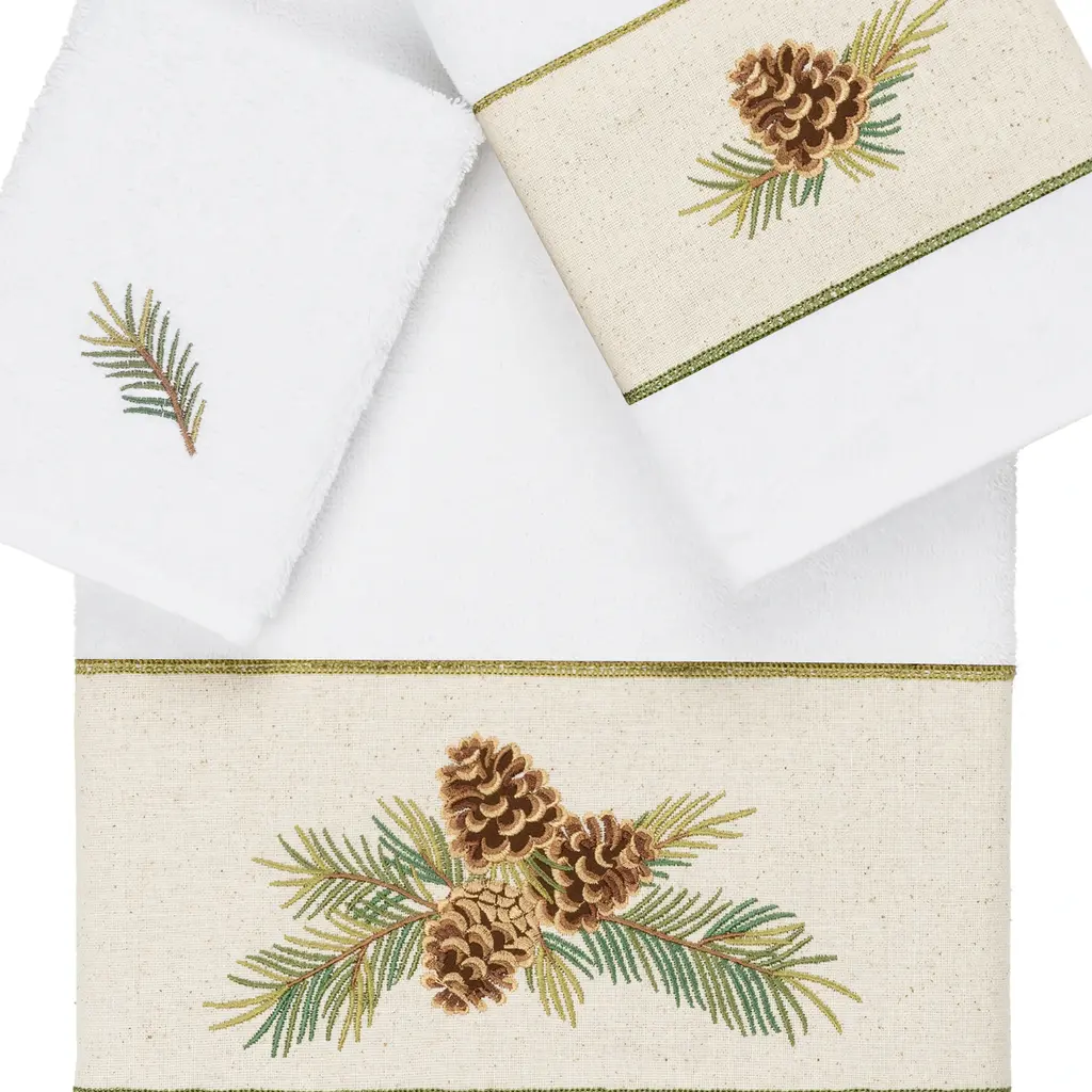 The Pierre Embellished Towel Collection by Authentic Hotel and Spa features a rustic pinecones on branches motif, embroidered on a natural cotton osnaburg cloth border. These soft and luxurious towels are made of 100% premium Turkish Cotton and offer lasting absorbency and superior durability.100% Premium Turkish Cotton Superbly absorbent and quick drying Available in a range of lovely towel colors Machine wash cold, No bleach, line dry or dry clean Set includes 1 bath towel (27" x 54") / 1 hand towel (16" x 30") / 1 washcloth (13" x 13") Made in Turkey Proudly Embellished in USA