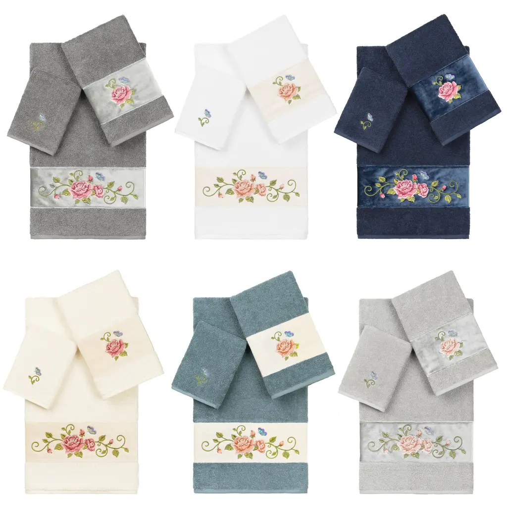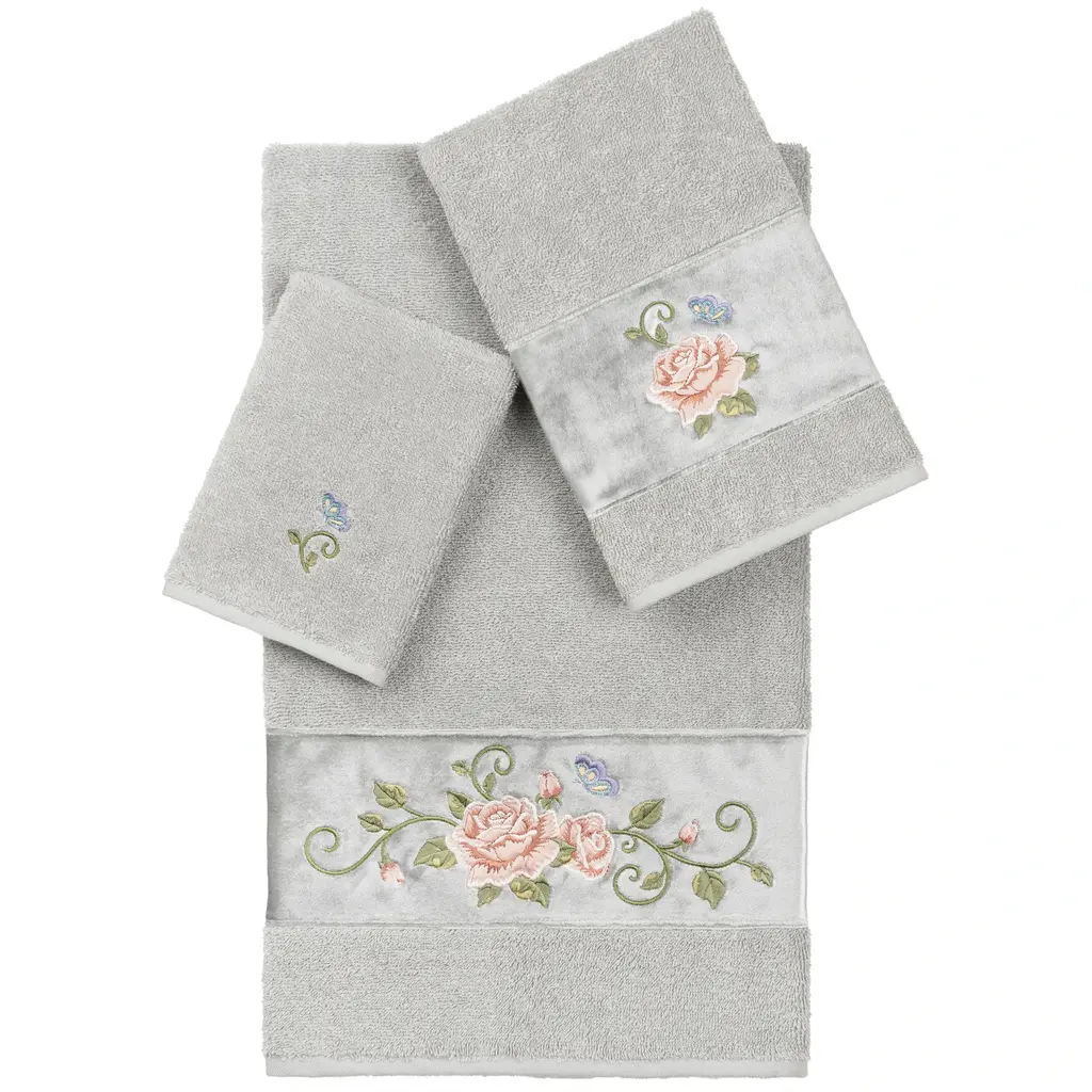 The Rebecca Embellished Towel Collection features a romantic rose & butterfly motif embroidered on a rich velvet border. These soft and luxurious towels are made of 100% premium Turkish Cotton and offer lasting absorbency and superior durability. 100% Premium Turkish Cotton Superbly absorbent and quick drying Available in a range of lovely towel colors Machine wash cold, No bleach, line dry or dry clean Set includes 1 bath towel (27" x 54") / 1 hand towel (16" x 30") / 1 washcloth (13" x 13") Made in Turkey
