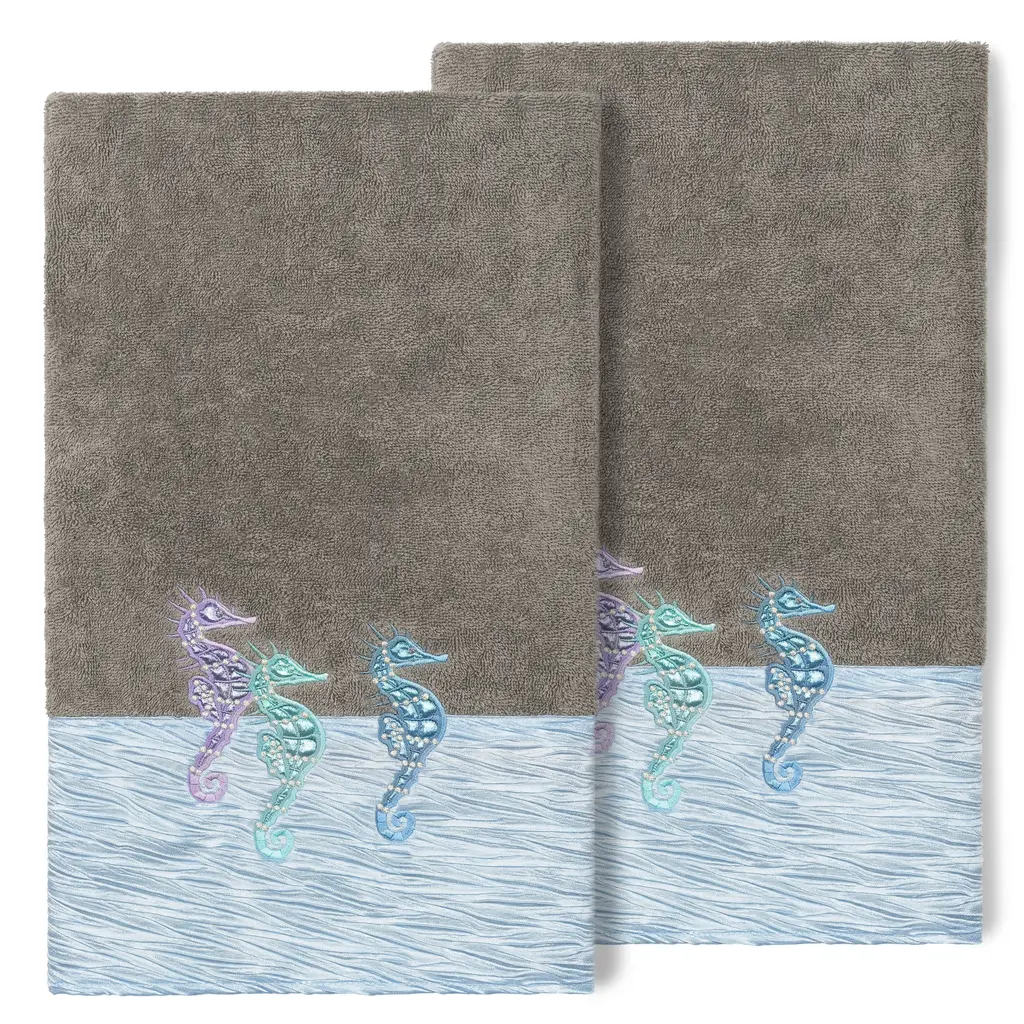 The Sofia Embellished Towel Collection features sparkling seahorses embroidered on a lustrous pleated border. These soft and luxurious towels are made of 100% premium Turkish Cotton and offer lasting absorbency and superior durability.100% Premium Turkish Cotton Superbly absorbent and quick drying Available in a range of lovely towel colors Machine wash cold, No bleach, line dry or dry clean Set includes 2 bath towels (27" x 54") Made in Turkey