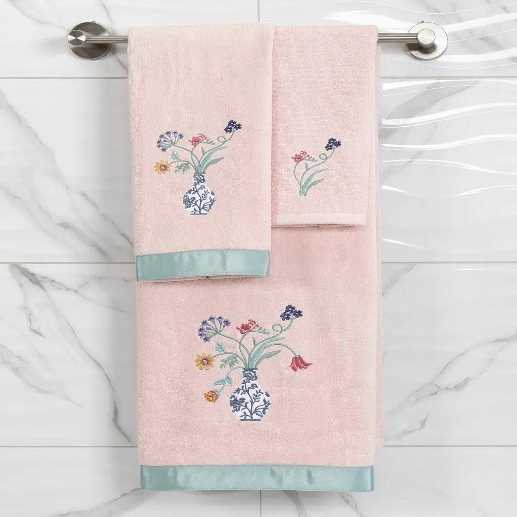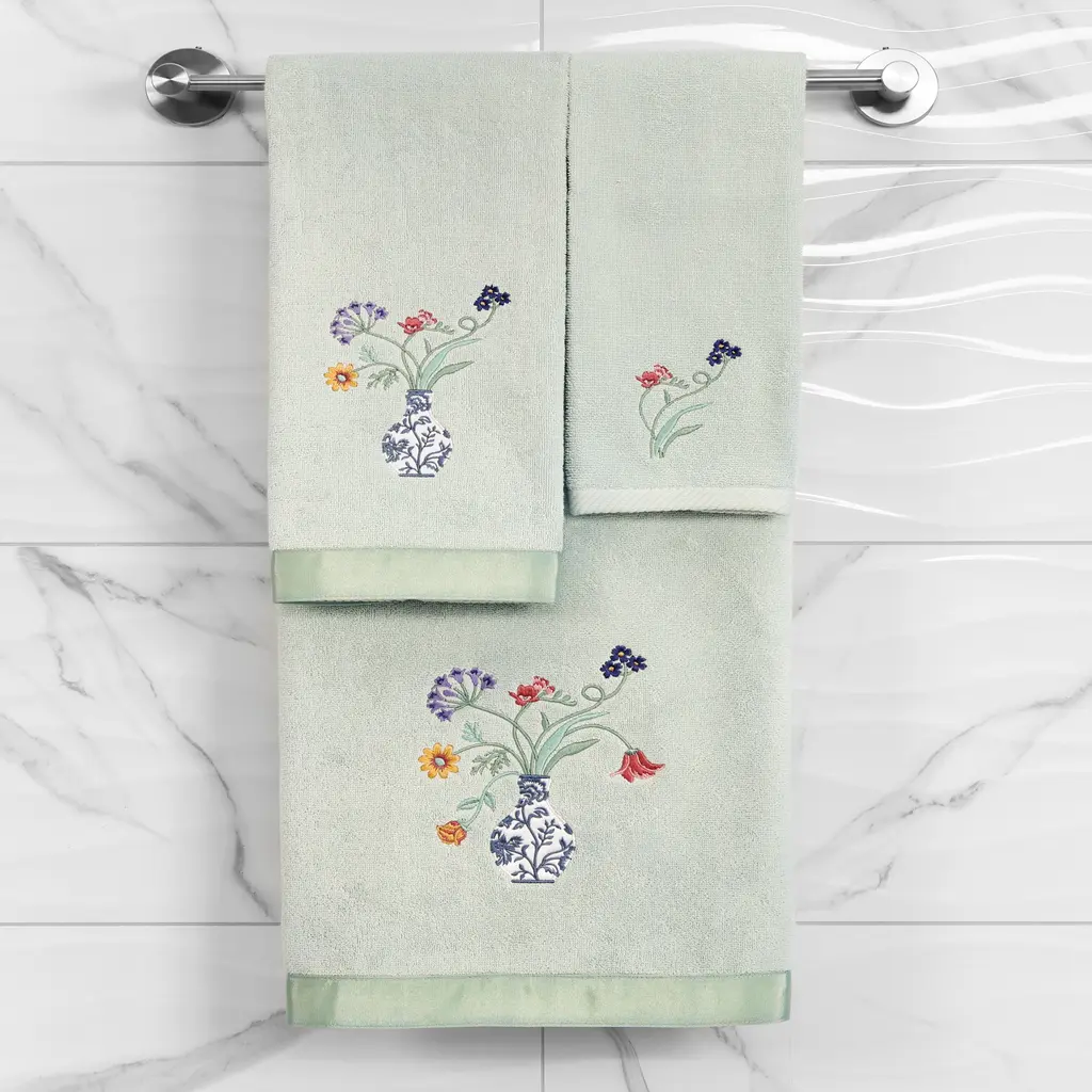 Your decorations are not complete without charming embroidered towels for the comfort of your family and guests. The Stella towels feature lovely flower stems in an applique blue & white vase and are trimmed with a lustrous bengaline border. Cloud soft and super absorbent, these luxurious, durable towels keep their plush appearance after washing. The Stella Towel Collection brings cottage spirit and richness to your home decor and makes a great gift!Embroidered Flower & Vase design100% Premium Turkish CottonSuperbly absorbent and quick dryingAvailable in a range of lovely towel colorsMachine wash cold, No bleach, line dry or dry cleanSet includes 2 fingertip towels (11" x 18")Made in TurkeyProudly Embellished in USA.