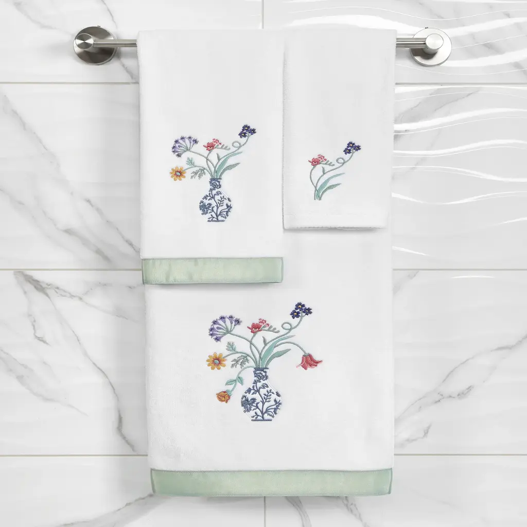Your decorations are not complete without charming embroidered towels for the comfort of your family and guests. The Stella towels feature lovely flower stems in an applique blue & white vase and are trimmed with a lustrous bengaline border. Cloud soft and super absorbent, these luxurious, durable towels keep their plush appearance after washing. The Stella Towel Collection brings cottage spirit and richness to your home decor and makes a great gift!Embroidered Flower & Vase design100% Premium Turkish CottonSuperbly absorbent and quick dryingAvailable in a range of lovely towel colorsMachine wash cold, No bleach, line dry or dry cleanSet includes 2 fingertip towels (11" x 18")Made in TurkeyProudly Embellished in USA.