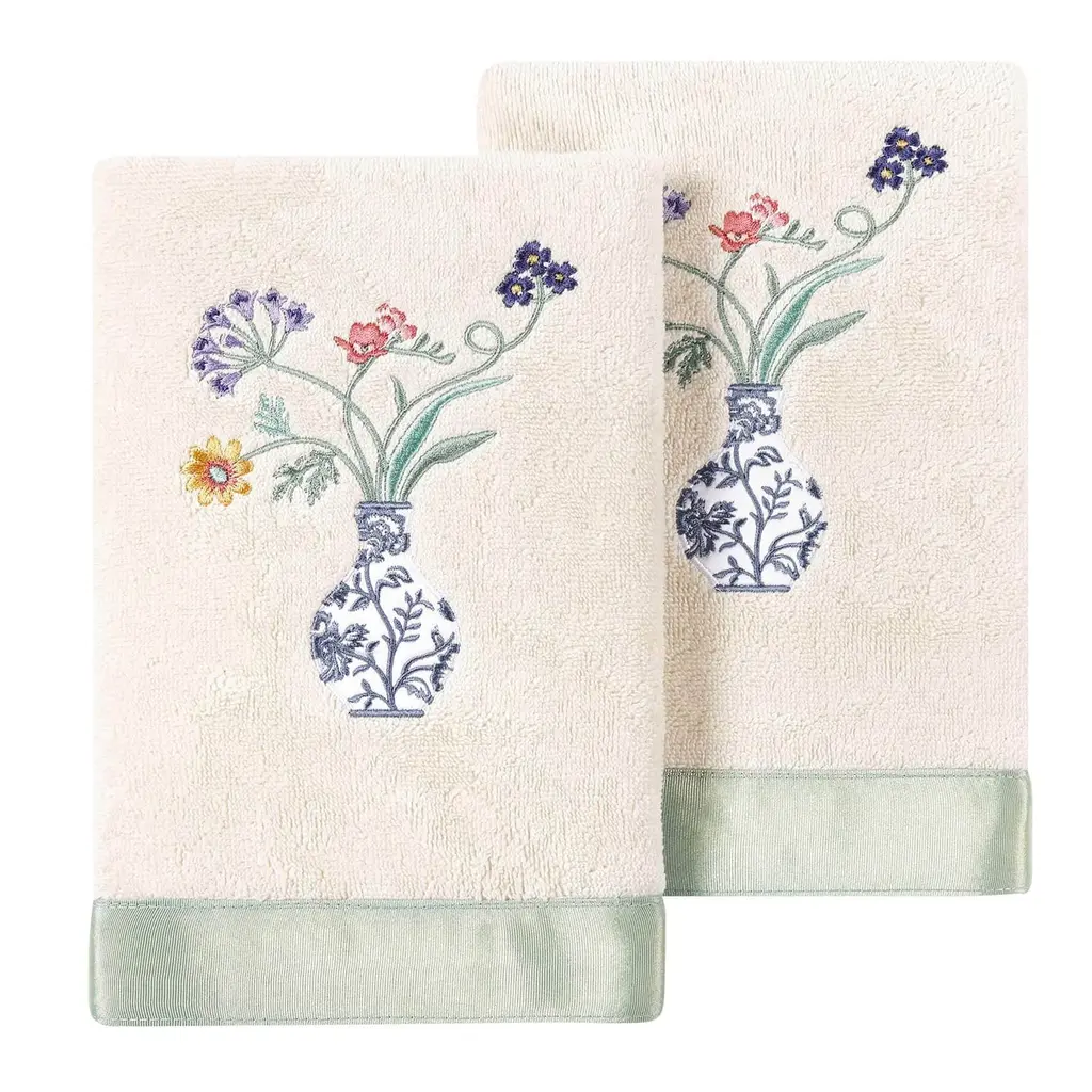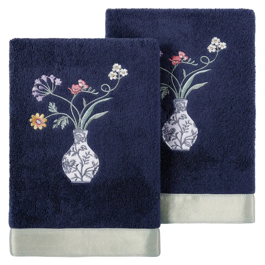 Your decorations are not complete without charming embroidered towels for the comfort of your family and guests. The Stella towels feature lovely flower stems in an applique blue & white vase and are trimmed with a lustrous bengaline border. Cloud soft and super absorbent, these luxurious, durable towels keep their plush appearance after washing. The Stella Towel Collection brings cottage spirit and richness to your home decor and makes a great gift!Embroidered Flower & Vase design 100% Premium Turkish Cotton. Superbly absorbent and quick drying Available in a range of lovely towel colors Machine wash cold, No bleach, line dry or dry clean Set includes 2 hand towels (16" x 30") Made in Turkey Proudly Embellished in USA