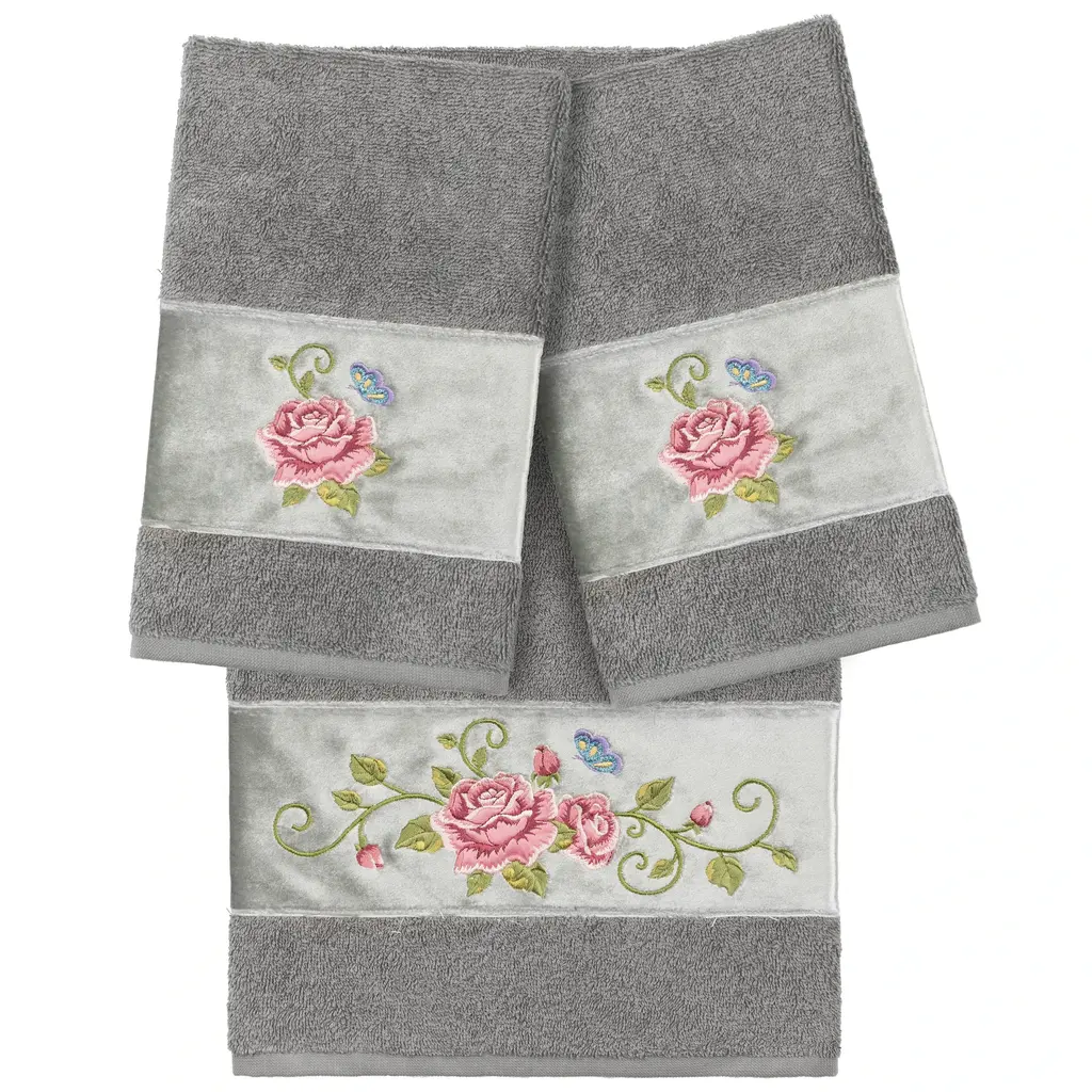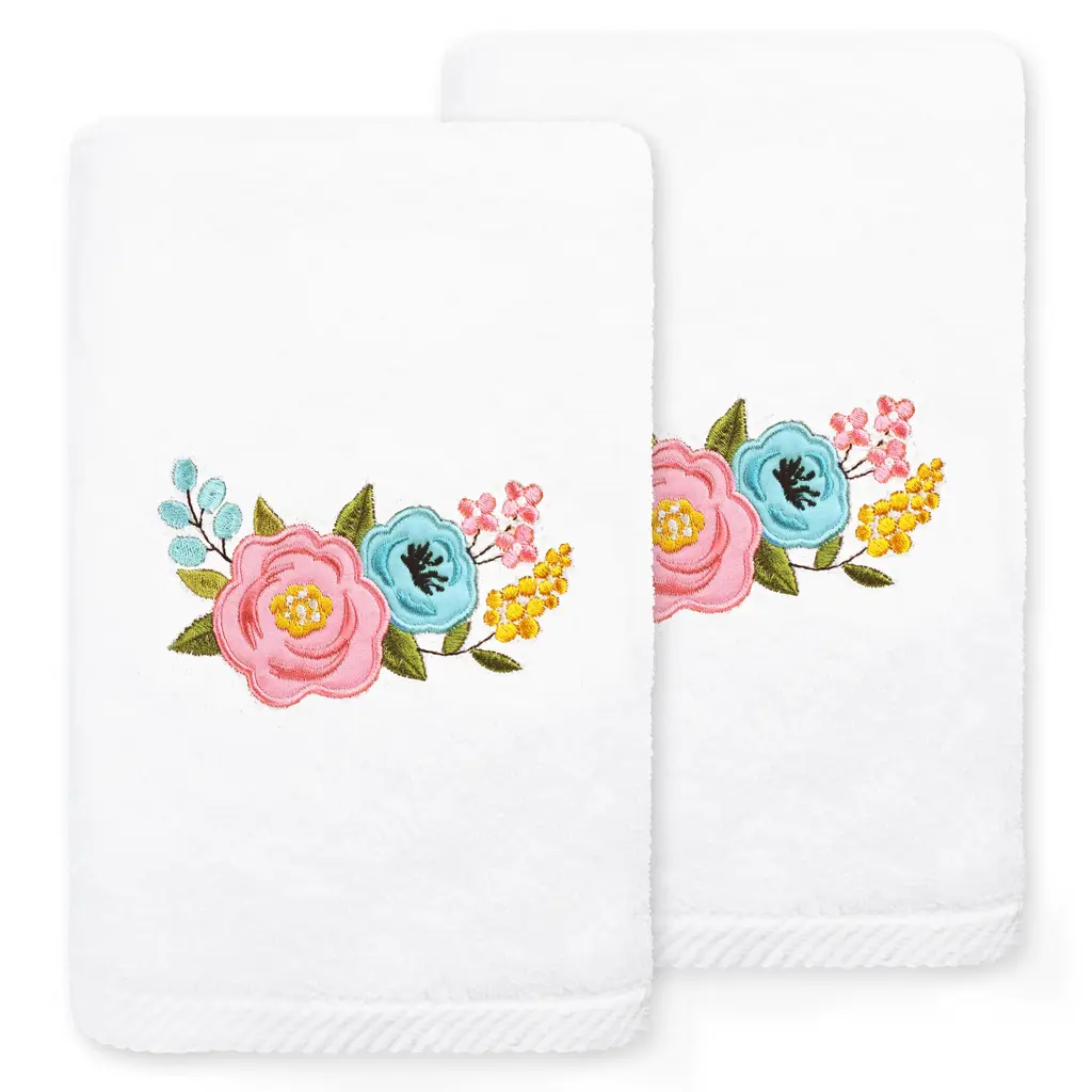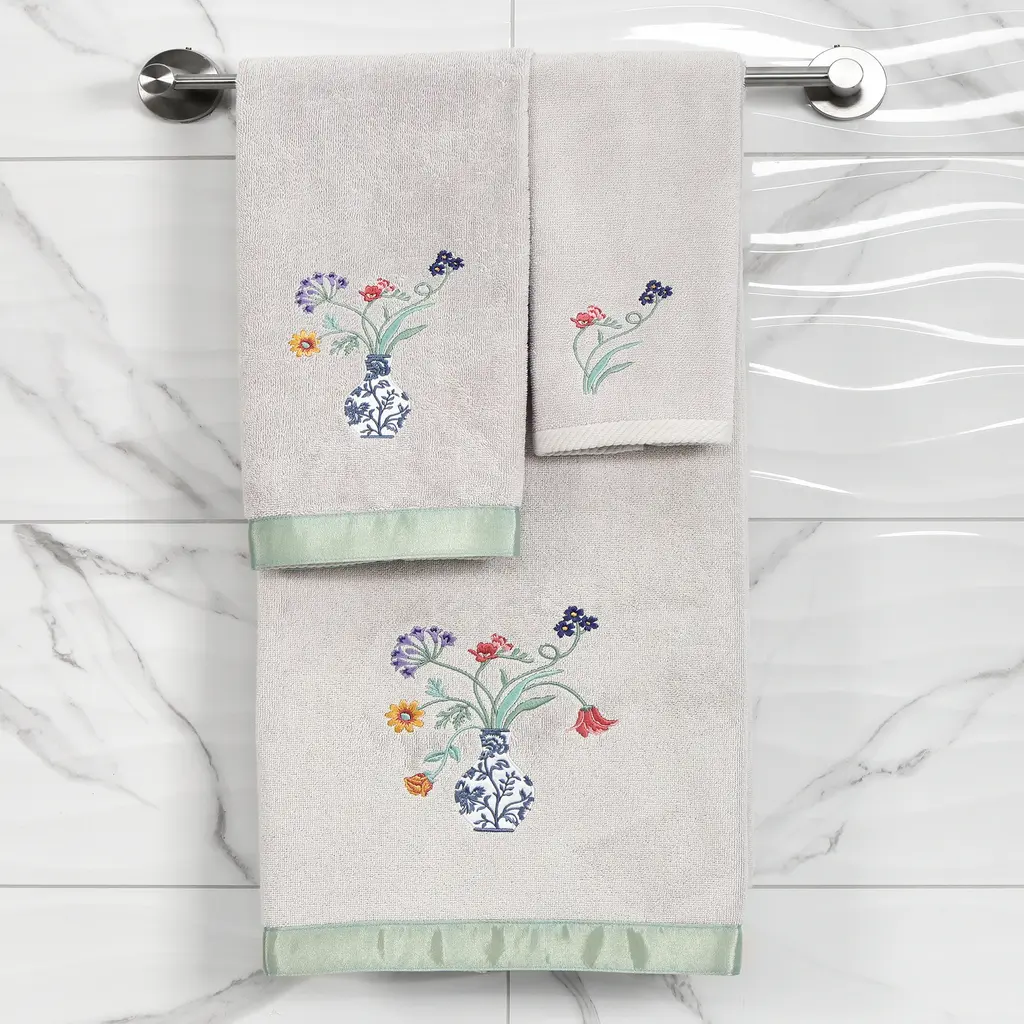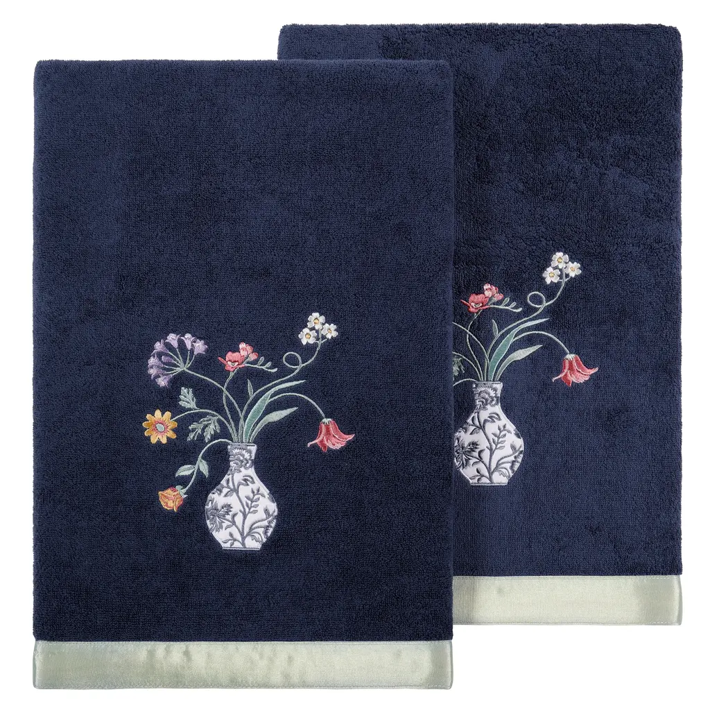 Your decorations are not complete without charming embroidered towels for the comfort of your family and guests. The Stella towels feature lovely flower stems in an applique blue & white vase and are trimmed with a lustrous bengaline border. Cloud soft and super absorbent, these luxurious, durable towels keep their plush appearance after washing. The Stella Towel Collection brings cottage spirit and richness to your home decor and makes a great gift!Embroidered Flower & Vase design 100% Premium Turkish Cotton. Superbly absorbent and quick drying Available in a range of lovely towel colors Machine wash cold, No bleach, line dry or dry clean Set includes 2 hand towels (16" x 30") Made in Turkey Proudly Embellished in USA