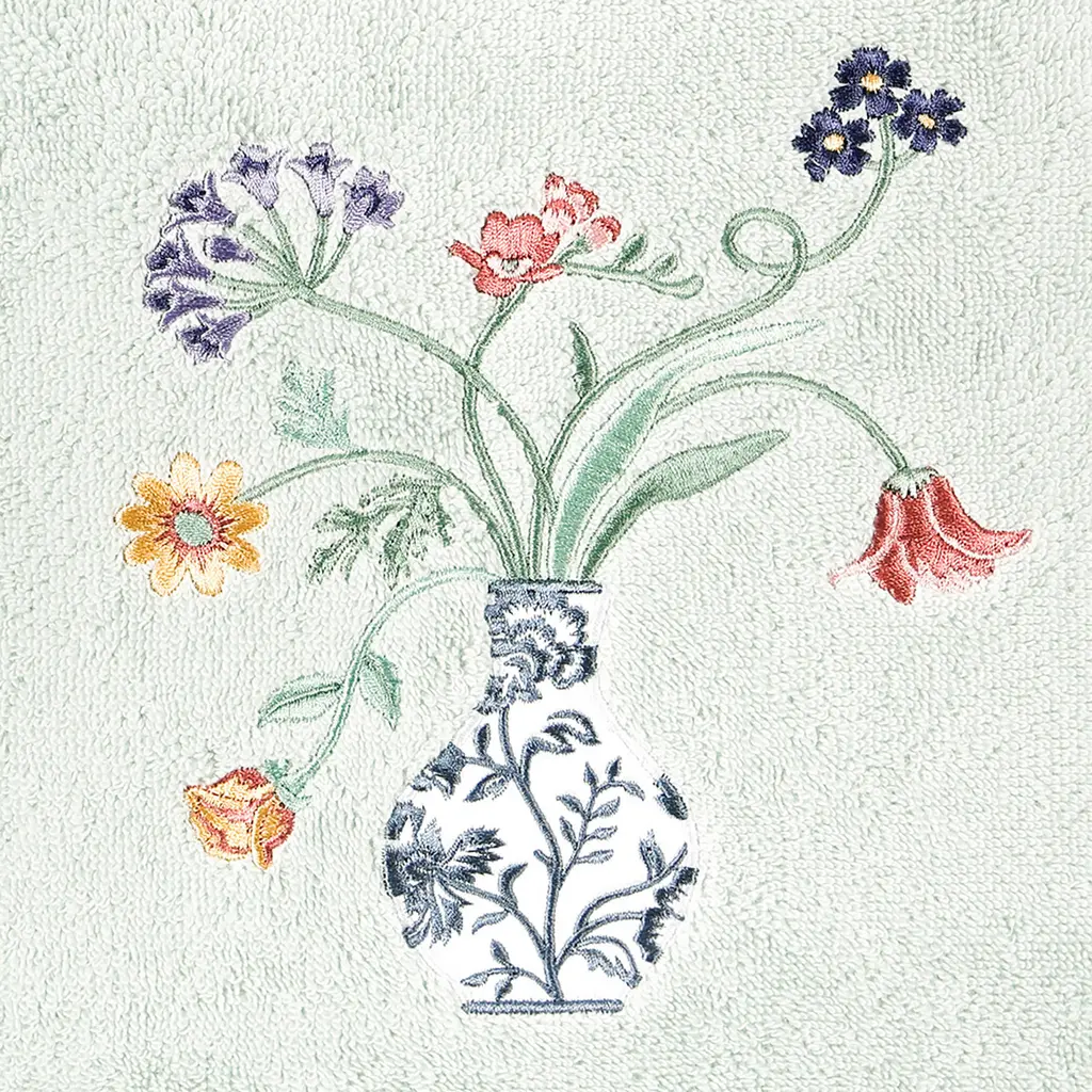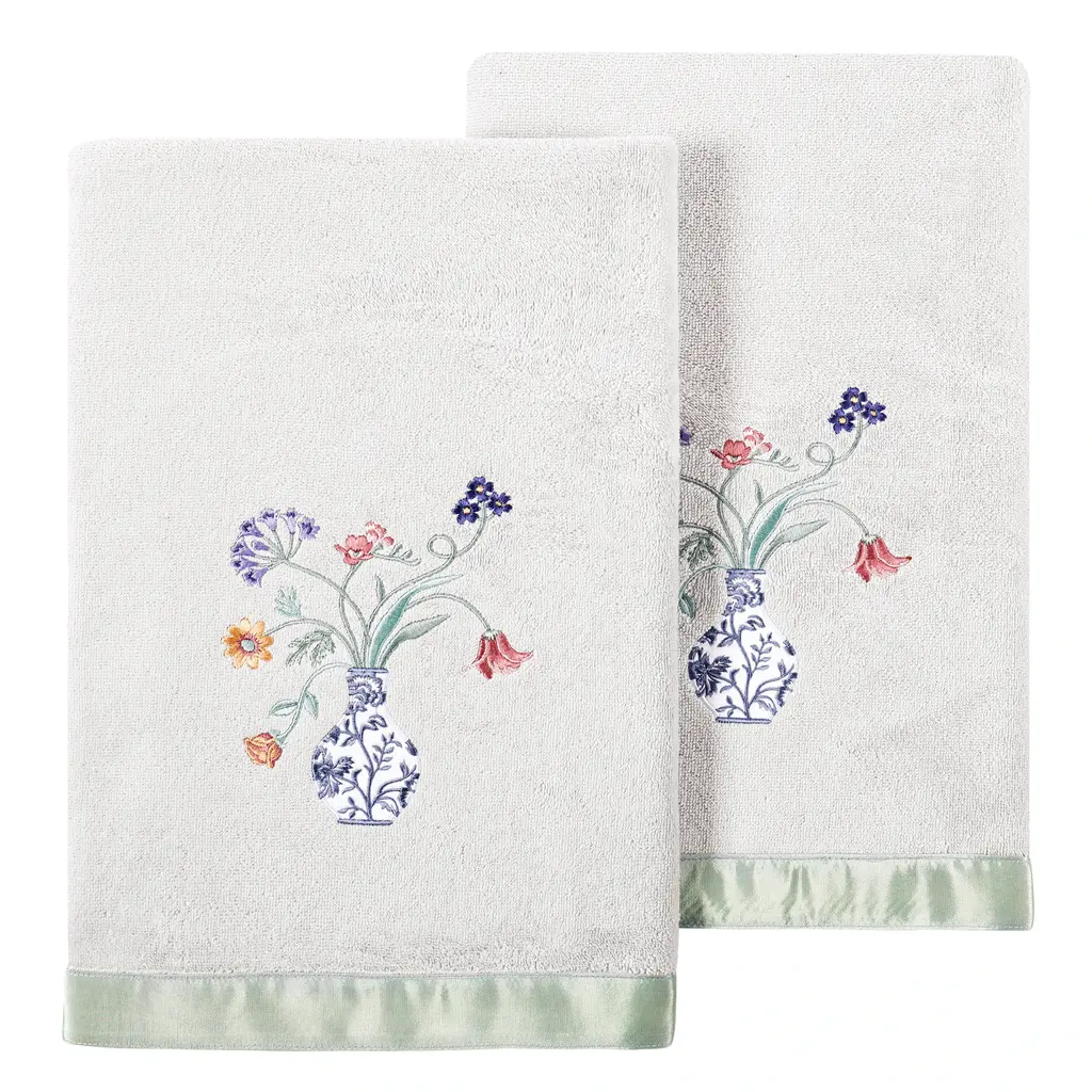 Your decorations are not complete without charming embroidered towels for the comfort of your family and guests. The Stella towels feature lovely flower stems in an applique blue & white vase and are trimmed with a lustrous bengaline border. Cloud soft and super absorbent, these luxurious, durable towels keep their plush appearance after washing. The Stella Towel Collection brings cottage spirit and richness to your home decor and makes a great gift!Embroidered Flower & Vase design 100% Premium Turkish Cotton Superbly absorbent and quick drying Available in a range of lovely towel colors Machine wash cold, No bleach, line dry or dry clean Set includes 2 bath towels (27" x 54") Made in Turkey Proudly Embellished in USA