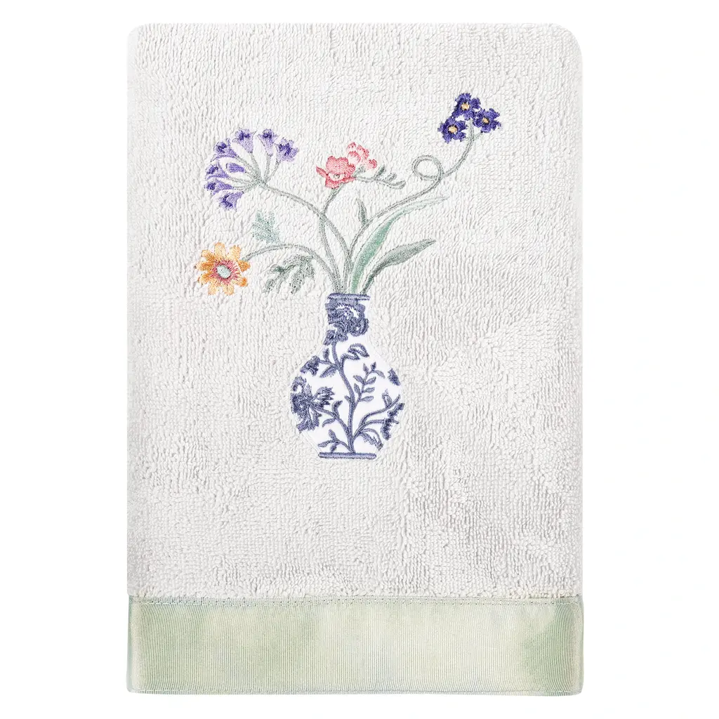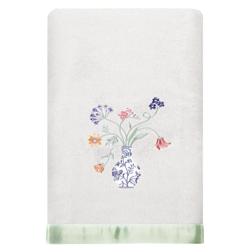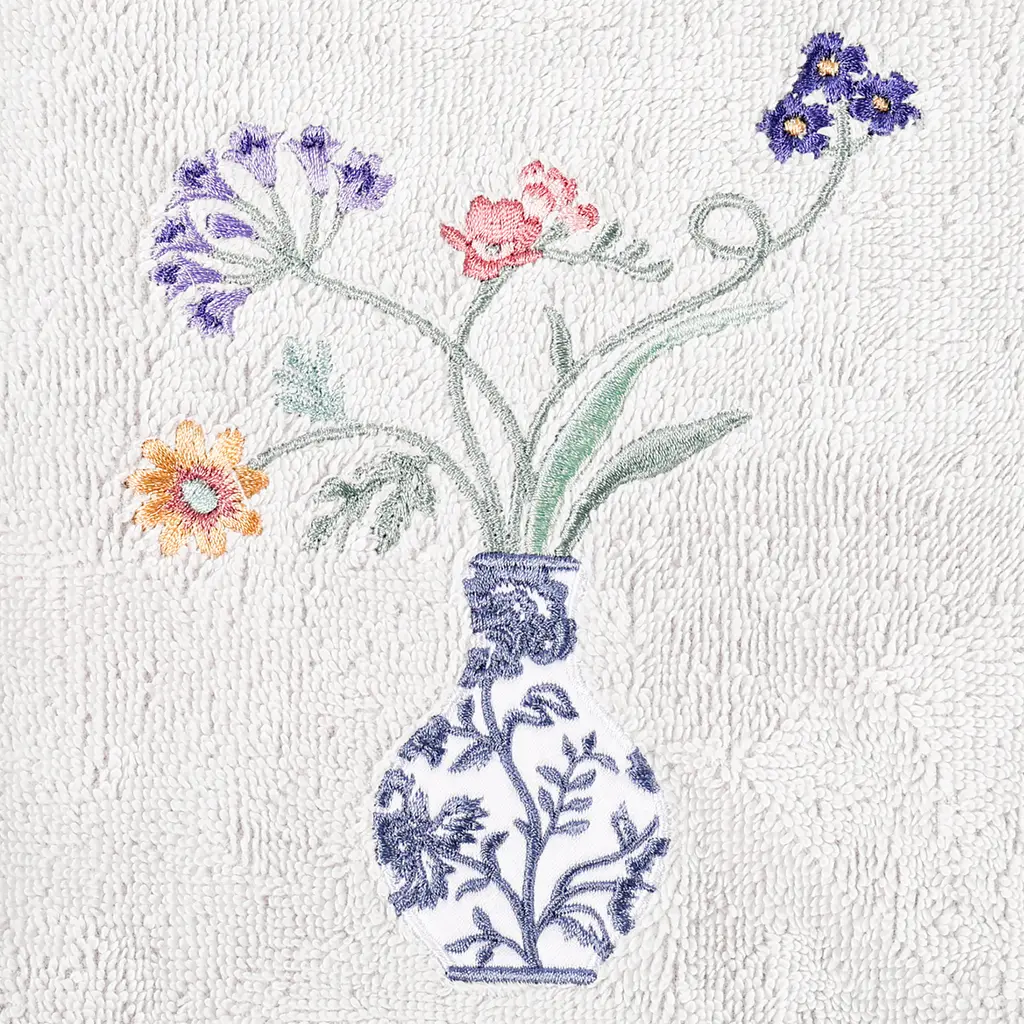 Your decorations are not complete without charming embroidered towels for the comfort of your family and guests. The Stella towels feature lovely flower stems in an applique blue & white vase and are trimmed with a lustrous bengaline border. Cloud soft and super absorbent, these luxurious, durable towels keep their plush appearance after washing. The Stella Towel Collection brings cottage spirit and richness to your home decor and makes a great gift!Embroidered Flower & Vase design 100% Premium Turkish Cotton Superbly absorbent and quick drying Available in a range of lovely towel colors Machine wash cold, No bleach, line dry or dry clean Set includes 1 bath towel (27" x 54") / 2 hand towels (16" x 30") Made in Turkey Proudly Embellished in USA