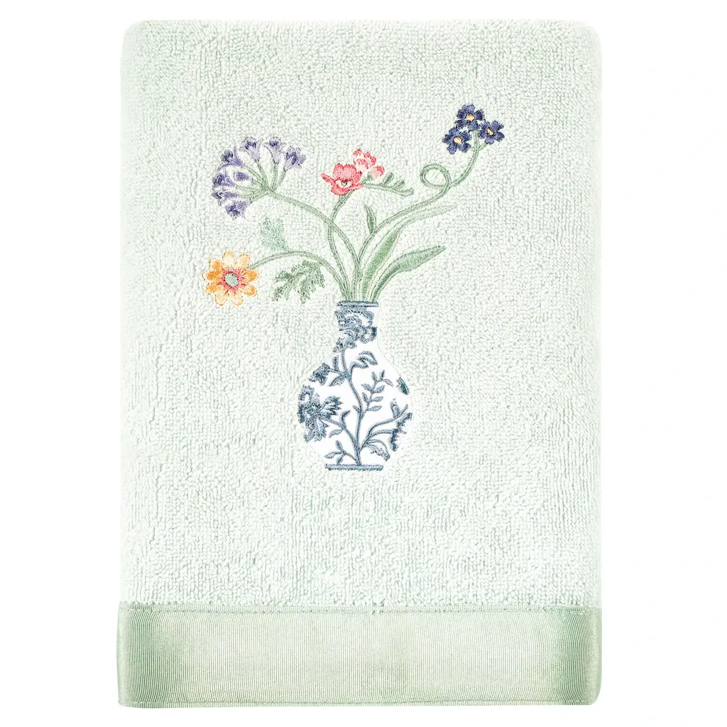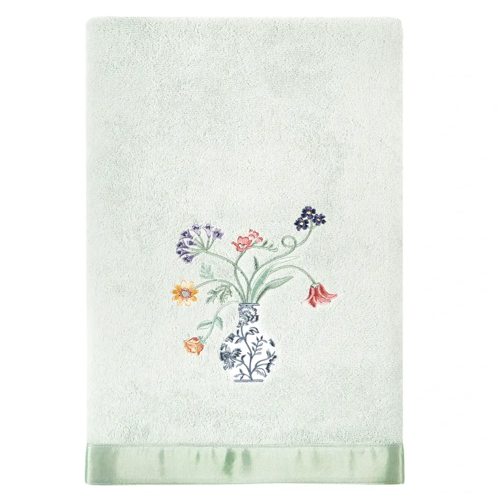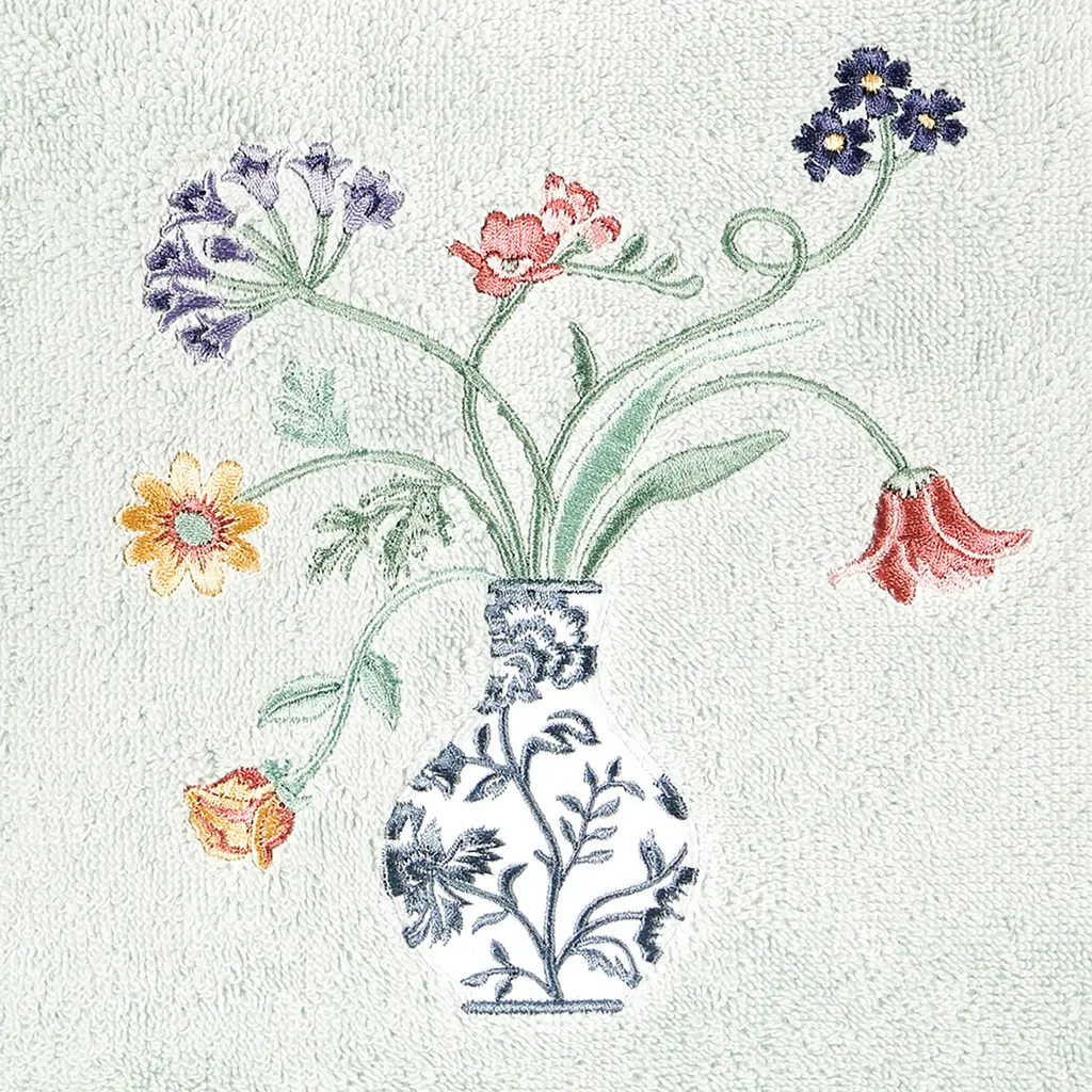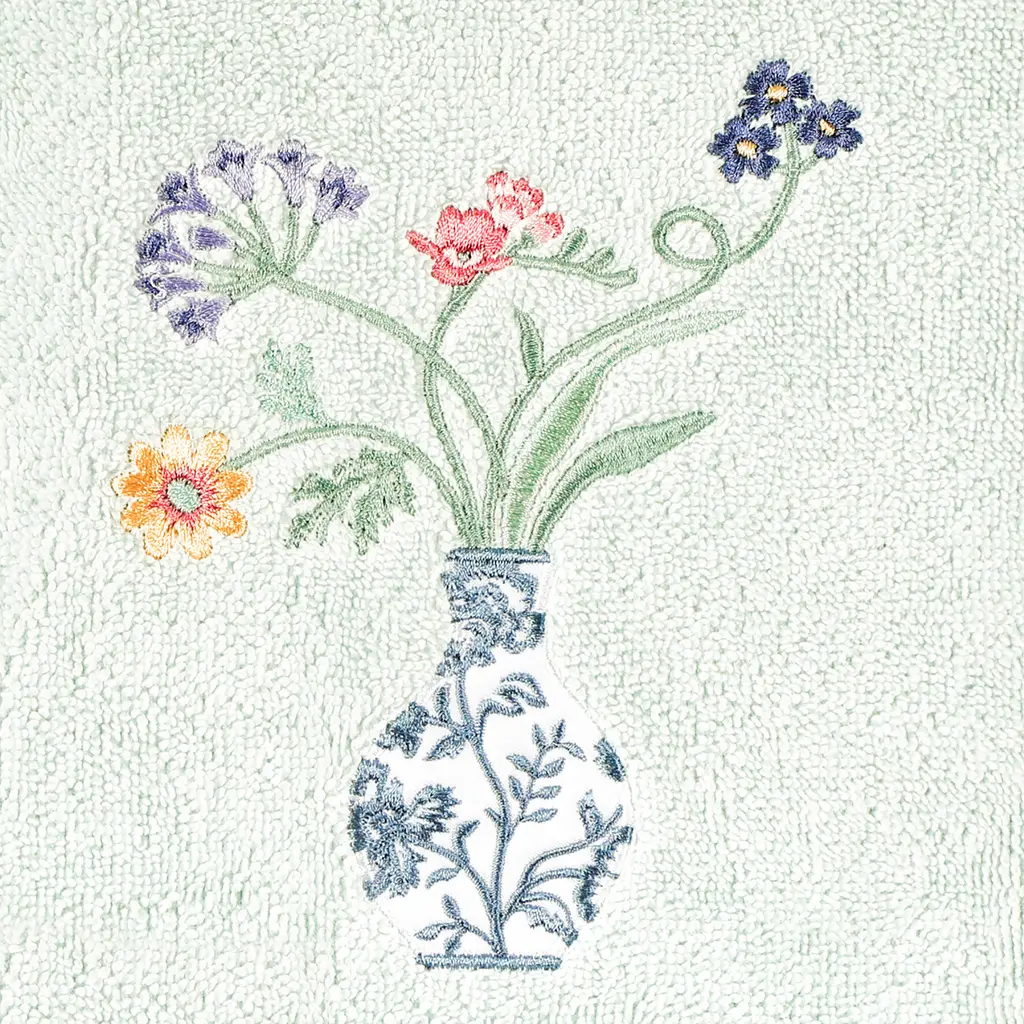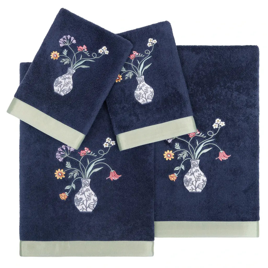 Your decorations are not complete without charming embroidered towels for the comfort of your family and guests. The Stella towels feature lovely flower stems in an applique blue & white vase and are trimmed with a lustrous bengaline border. Cloud soft and super absorbent, these luxurious, durable towels keep their plush appearance after washing. The Stella Towel Collection brings cottage spirit and richness to your home decor and makes a great gift!Embroidered Flower & Vase design 100% Premium Turkish Cotton Superbly absorbent and quick drying Available in a range of lovely towel colors Machine wash cold, No bleach, line dry or dry clean Set includes 2 bath towels (27" x 54") / 2 hand towels (16" x 30") Made in Turkey Proudly Embellished in USA