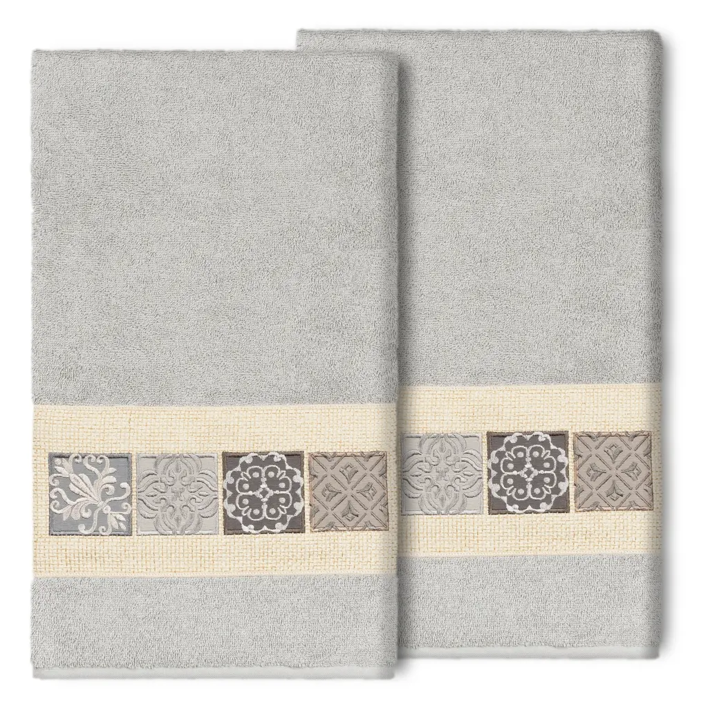 The Vivian Embellished Towel Collection features a classic tile pattern embroidered on a woven textured border. These soft and luxurious towels are made of 100% premium Turkish Cotton and offer lasting absorbency and superior durability.100% Premium Turkish Cotton Superbly absorbent and quick drying Available in a range of lovely towel colors Machine wash cold, No bleach, line dry or dry clean Set includes 2 bath towels (27" x 54") Made in Turkey