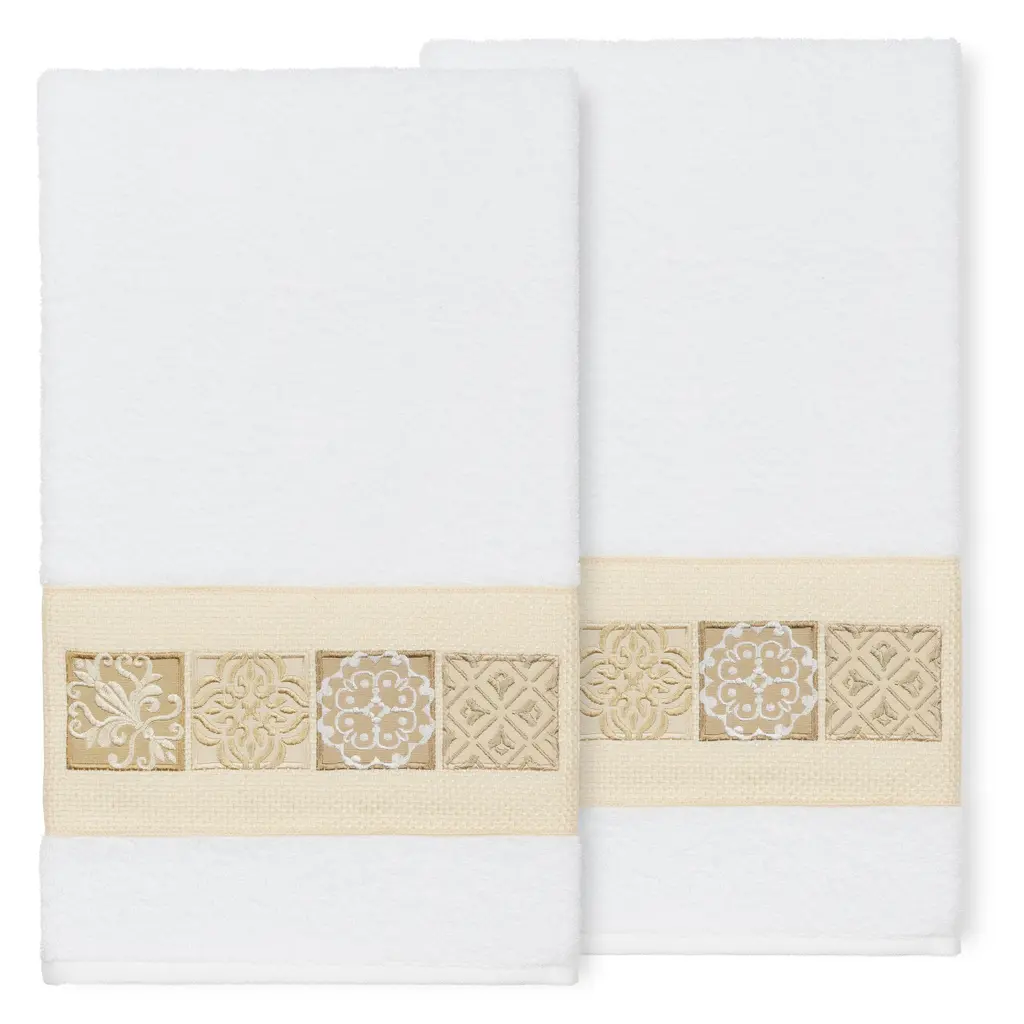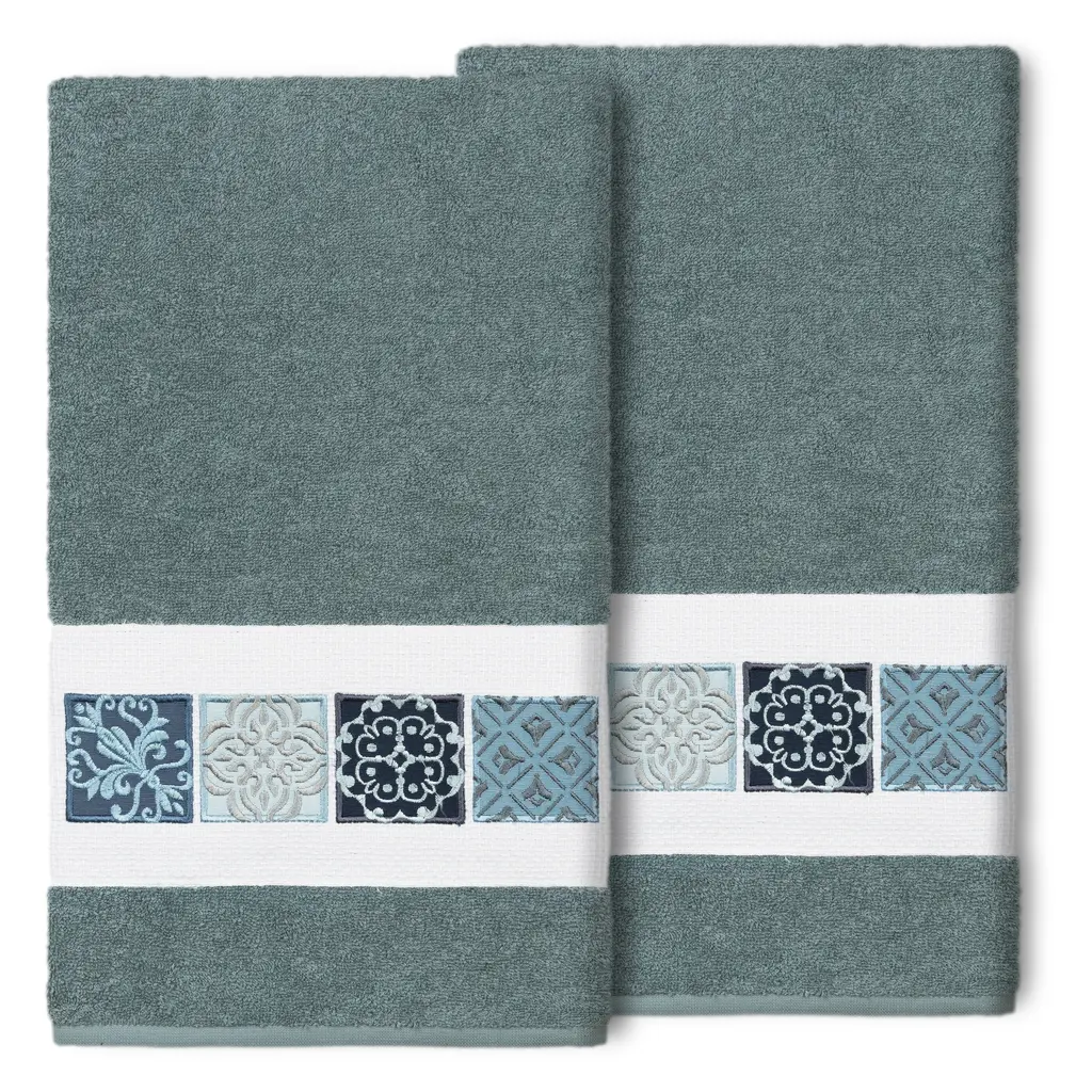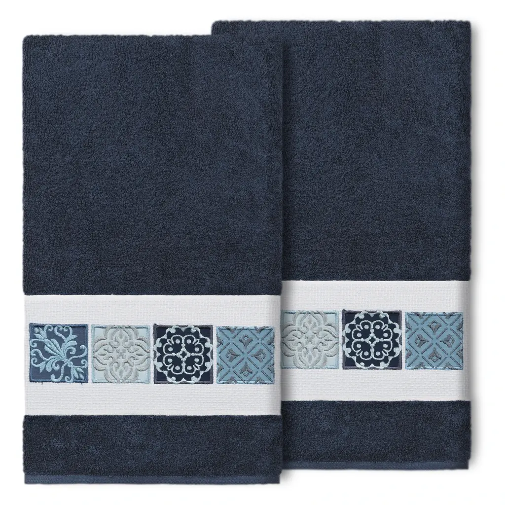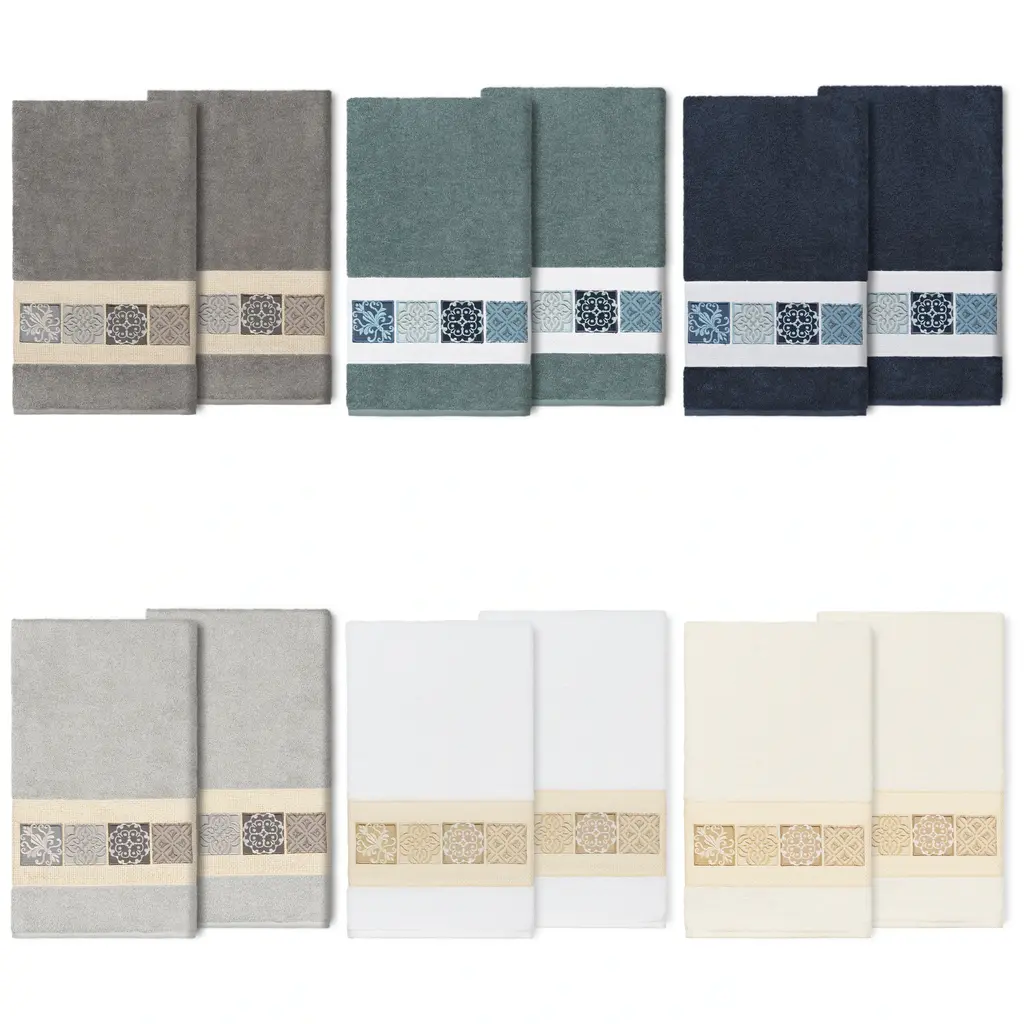 The Vivian Embellished Towel Collection features a classic tile pattern embroidered on a woven textured border. These soft and luxurious towels are made of 100% premium Turkish Cotton and offer lasting absorbency and superior durability.100% Premium Turkish Cotton Superbly absorbent and quick drying Available in a range of lovely towel colors Machine wash cold, No bleach, line dry or dry clean Set includes 2 bath towels (27" x 54") Made in Turkey