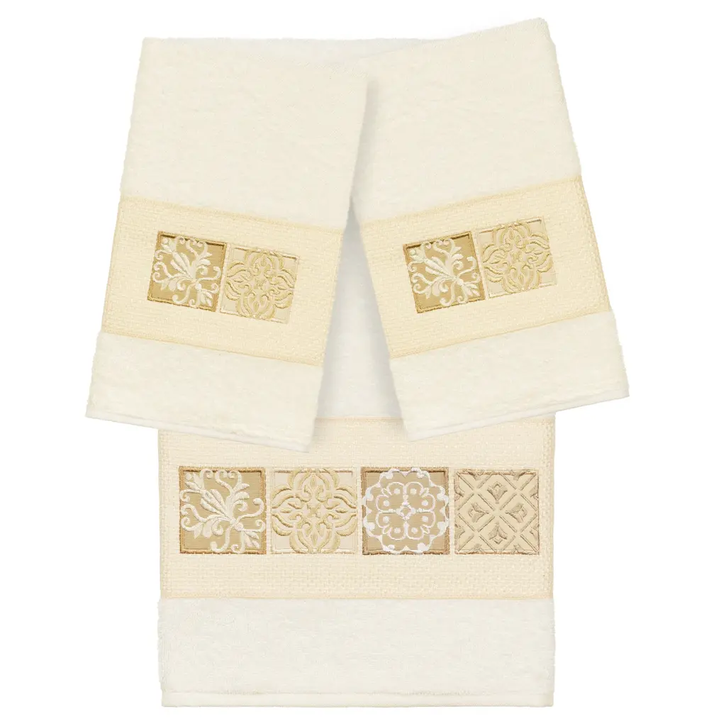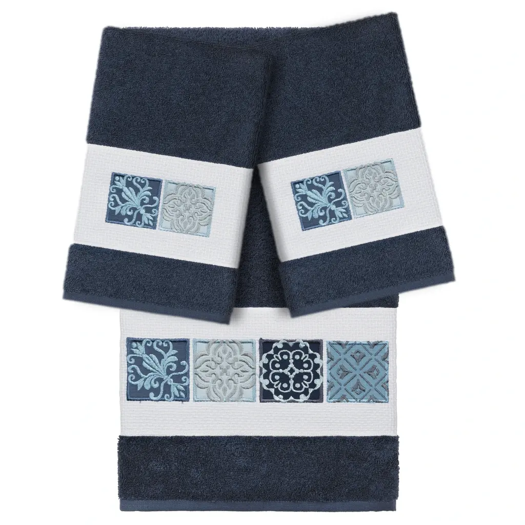 The Vivian Embellished Towel Collection features a classic tile pattern embroidered on a woven textured border. These soft and luxurious towels are made of 100% premium Turkish Cotton and offer lasting absorbency and superior durability.100% Premium Turkish Cotton Superbly absorbent and quick drying Available in a range of lovely towel colors Machine wash cold, No bleach, line dry or dry clean Set includes 1 bath towel (27" x 54") / 2 hand towels (16" x 30") Made in Turkey