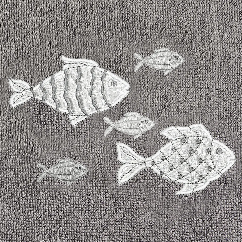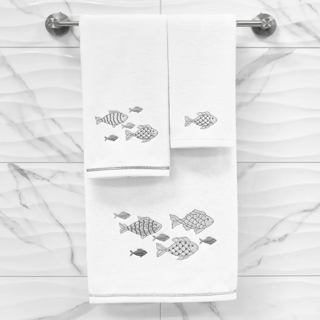 Your decorations are not complete without graceful embroidered towels for the comfort of your family and guests. The Figi towels by Authentic Hotel and Spa feature sparkling applique fish and are trimmed with a matching cord. Cloud soft and super absorbent, these luxurious, durable towels keep their plush appearance after washing. This collection is available in 8 elegant colors: White, Beige, Blush, Aqua, Silver, Cocoa, Charcoal and Marine. The Figi Towel Collection brings a coastal spirit and richness to your home decor and makes a great gift! Note: Due to variations in computer screen resolutions, slight color differences may exist between images provided and actual product.Embroidered Fish design100% Premium Turkish CottonSuperbly absorbent and quick dryingAvailable in 8 elegant colorsMachine wash cold, No bleach, line dry or dry cleanSet includes 2 fingertip towels (11" x 18")Made in TurkeyProudly Embellished in USA