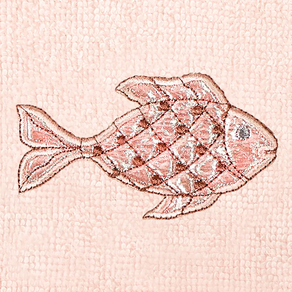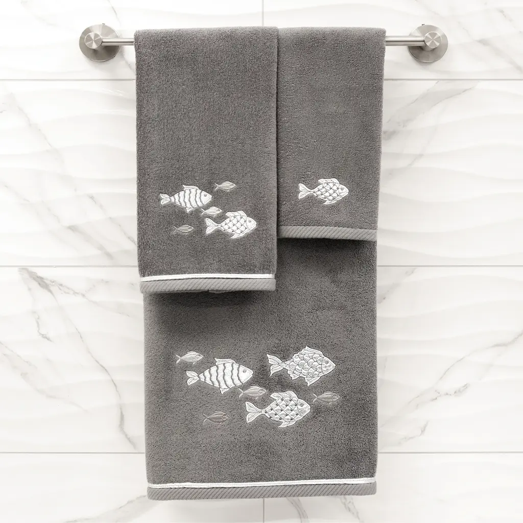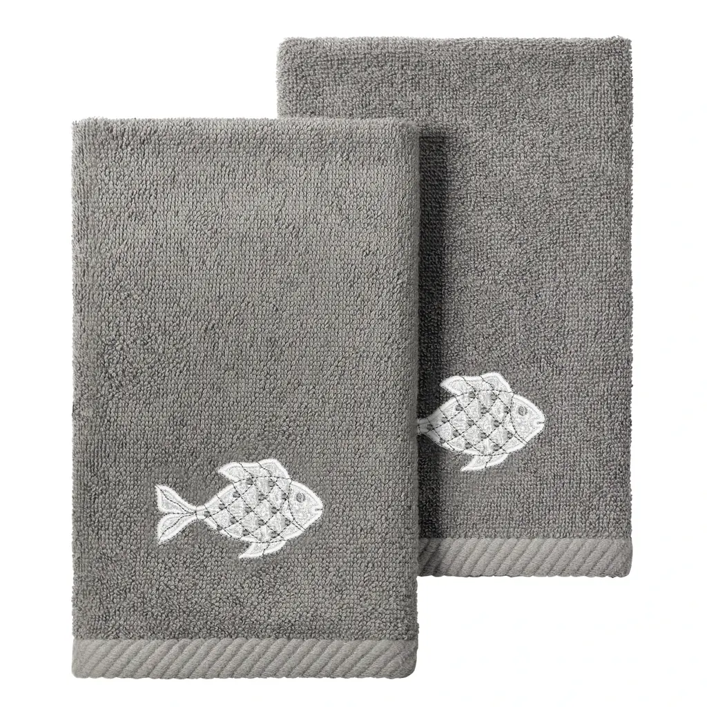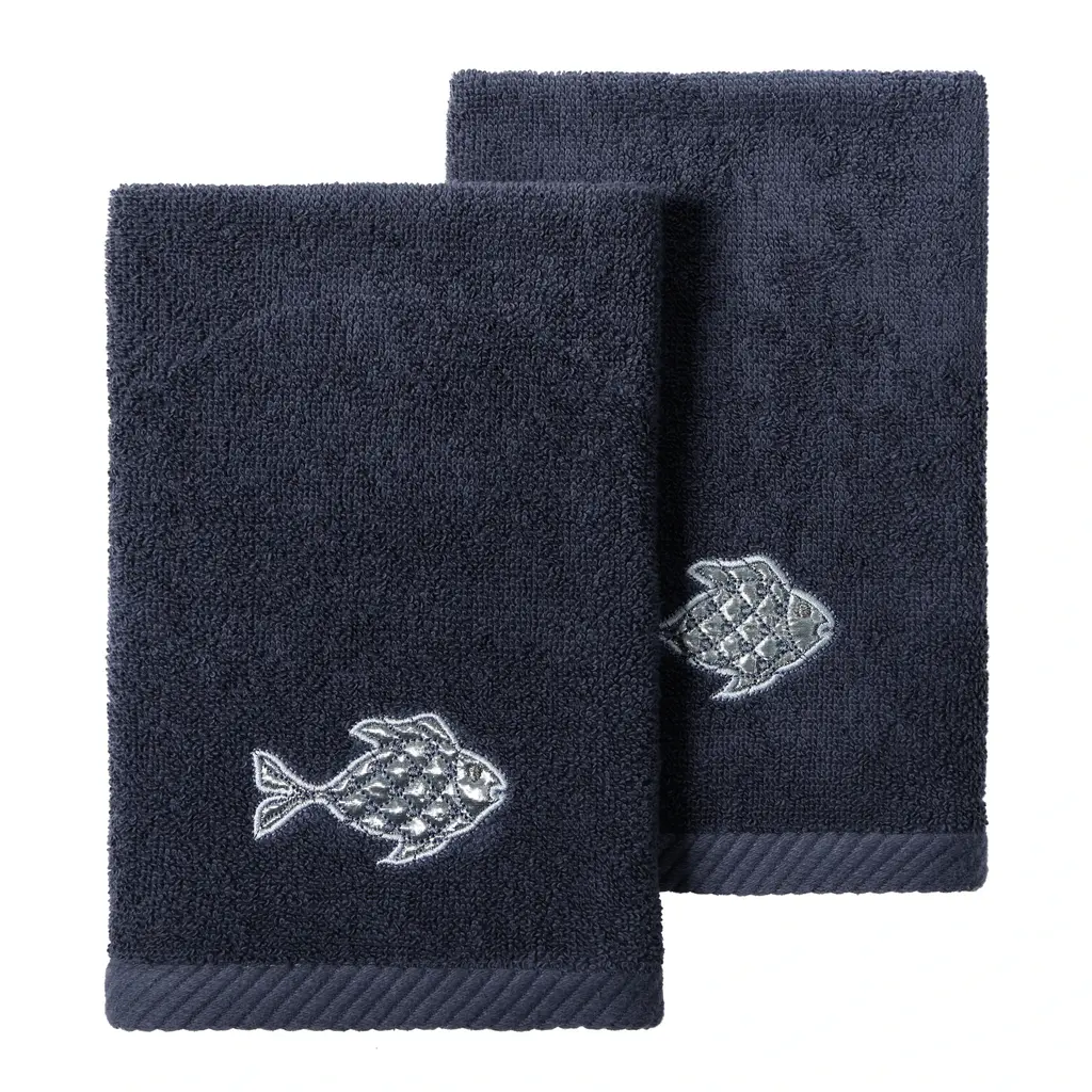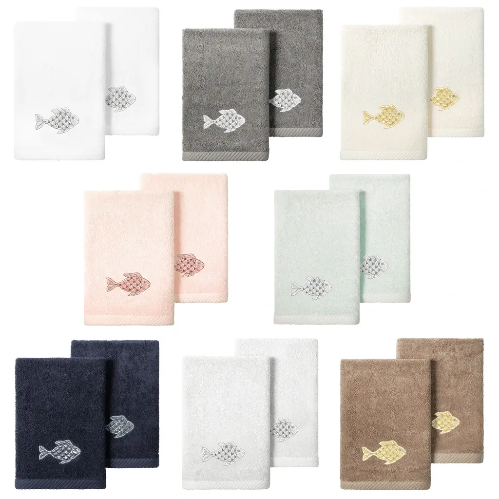 Your decorations are not complete without graceful embroidered towels for the comfort of your family and guests. The Figi towels by Authentic Hotel and Spa feature sparkling applique fish and are trimmed with a matching cord. Cloud soft and super absorbent, these luxurious, durable towels keep their plush appearance after washing. This collection is available in 8 elegant colors: White, Beige, Blush, Aqua, Silver, Cocoa, Charcoal and Marine. The Figi Towel Collection brings a coastal spirit and richness to your home decor and makes a great gift! Note: Due to variations in computer screen resolutions, slight color differences may exist between images provided and actual product.Embroidered Fish design100% Premium Turkish CottonSuperbly absorbent and quick dryingAvailable in 8 elegant colorsMachine wash cold, No bleach, line dry or dry cleanSet includes 2 fingertip towels (11" x 18")Made in TurkeyProudly Embellished in USA