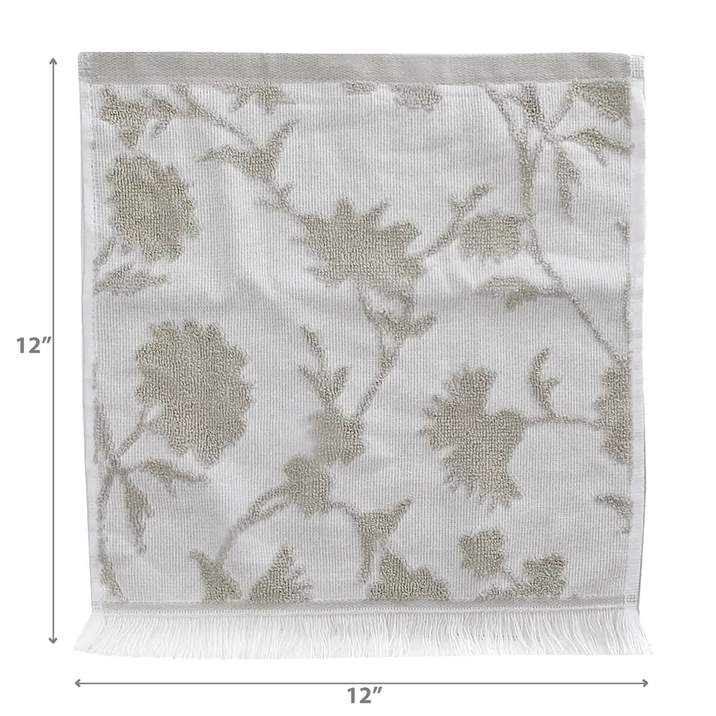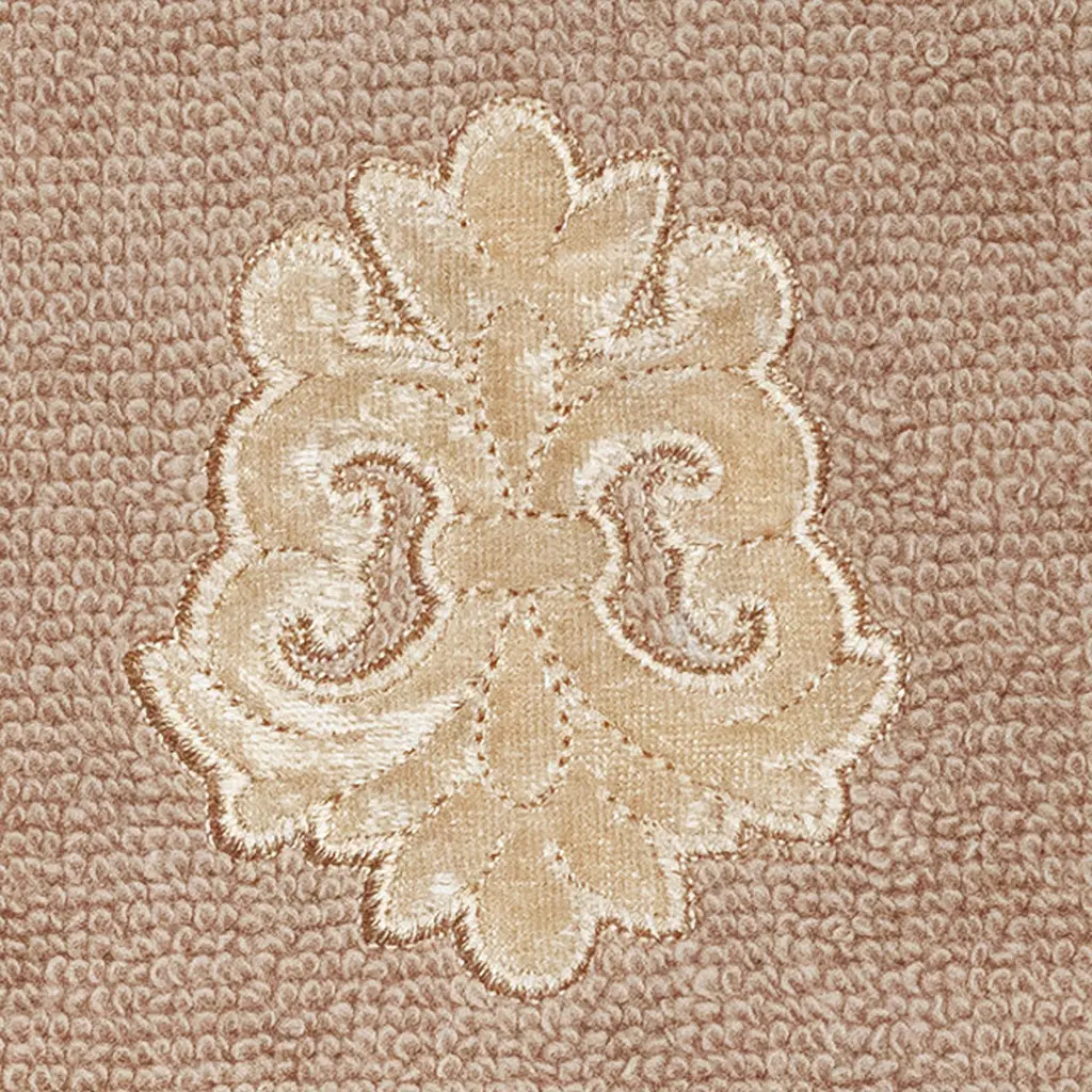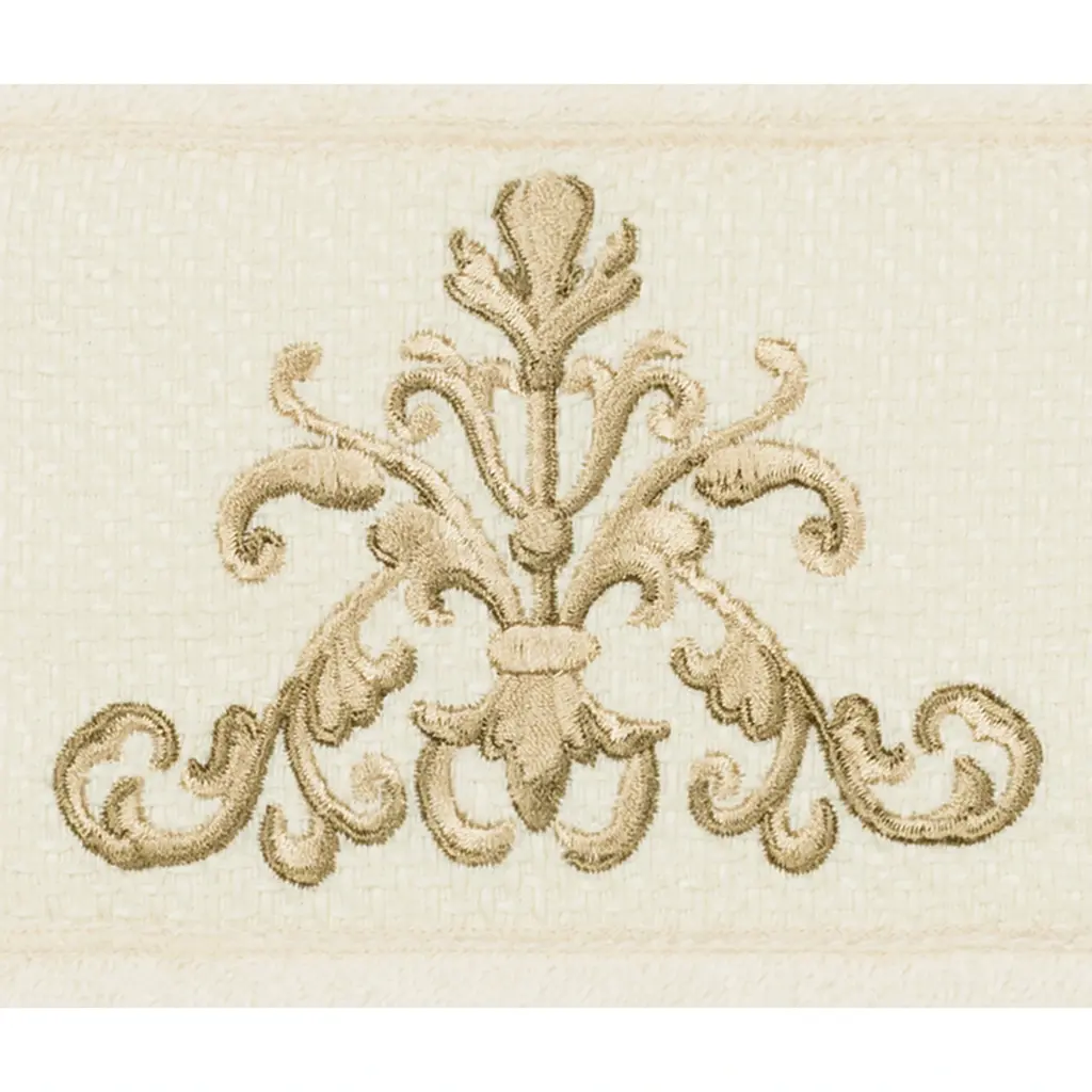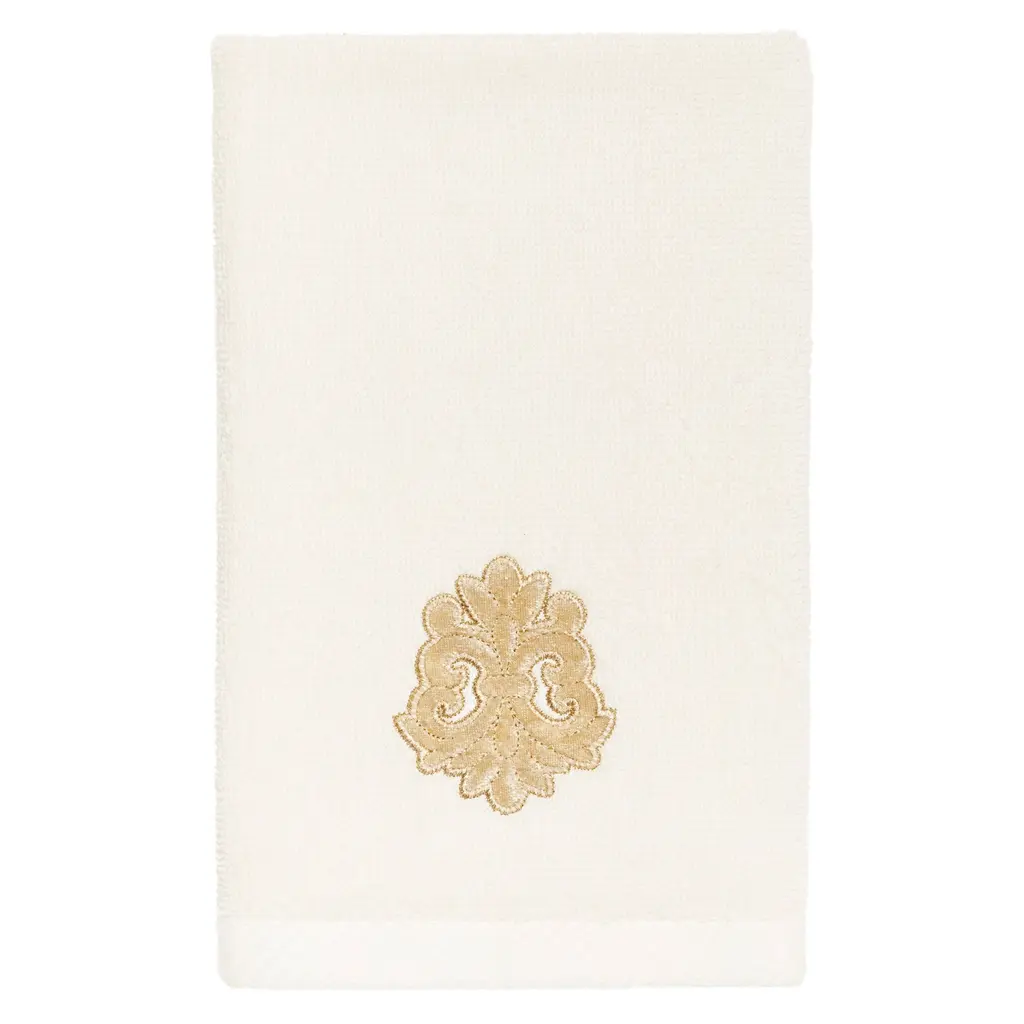 Your decorations are not complete without elegant embroidered towels by Authentic Hotel and Spa for the comfort of your family and guests. The May towels feature a classic velvet crest applique and are trimmed with the same lustrous velvet border. Cloud soft and super absorbent, these luxurious, durable towels keep their plush appearance after washing. This collection is available in 8 elegant colors: White, Beige, Blush, Aqua, Silver, Cocoa, Charcoal and Marine. The May Towel Collection brings a refined spirit and richness to your home decor and makes a great gift. Note: Due to variations in computer screen resolutions, slight color differences may exist between images provided and actual product.Embroidered Velvet Crest design100% Premium Turkish CottonSuperbly absorbent and quick dryingAvailable in 8 elegant colorsMachine wash cold, No bleach, line dry or dry cleanSet includes 2 fingertip towels (11" x 18")Made in TurkeyProudly Embellished in USA