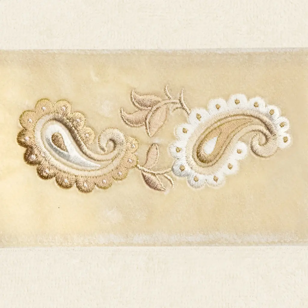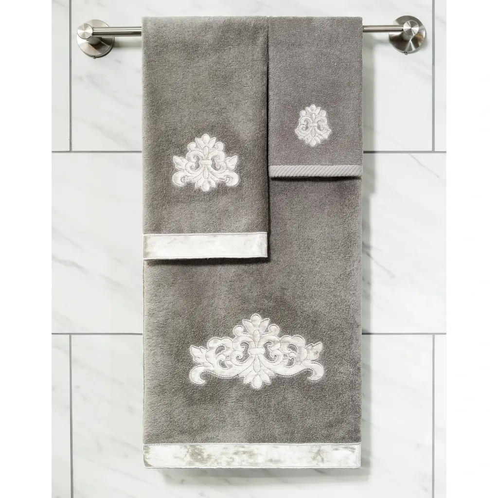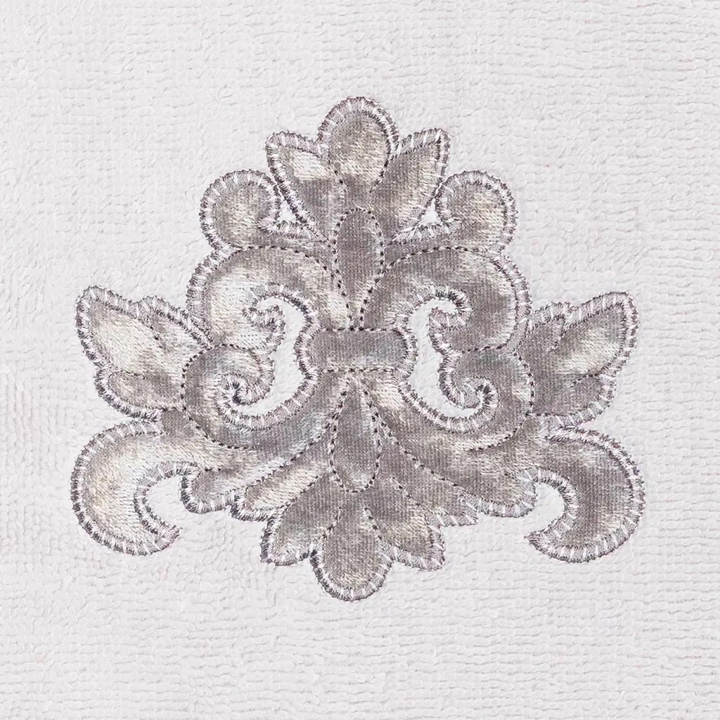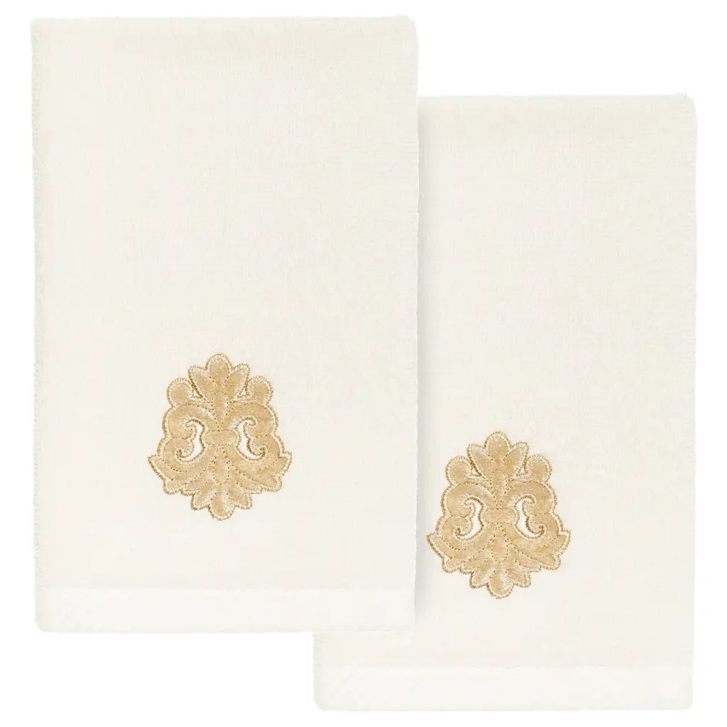 Your decorations are not complete without elegant embroidered towels by Authentic Hotel and Spa for the comfort of your family and guests. The May towels feature a classic velvet crest applique and are trimmed with the same lustrous velvet border. Cloud soft and super absorbent, these luxurious, durable towels keep their plush appearance after washing. This collection is available in 8 elegant colors: White, Beige, Blush, Aqua, Silver, Cocoa, Charcoal and Marine. The May Towel Collection brings a refined spirit and richness to your home decor and makes a great gift. Note: Due to variations in computer screen resolutions, slight color differences may exist between images provided and actual product.Embroidered Velvet Crest design100% Premium Turkish CottonSuperbly absorbent and quick dryingAvailable in 8 elegant colorsMachine wash cold, No bleach, line dry or dry cleanSet includes 2 fingertip towels (11" x 18")Made in TurkeyProudly Embellished in USA