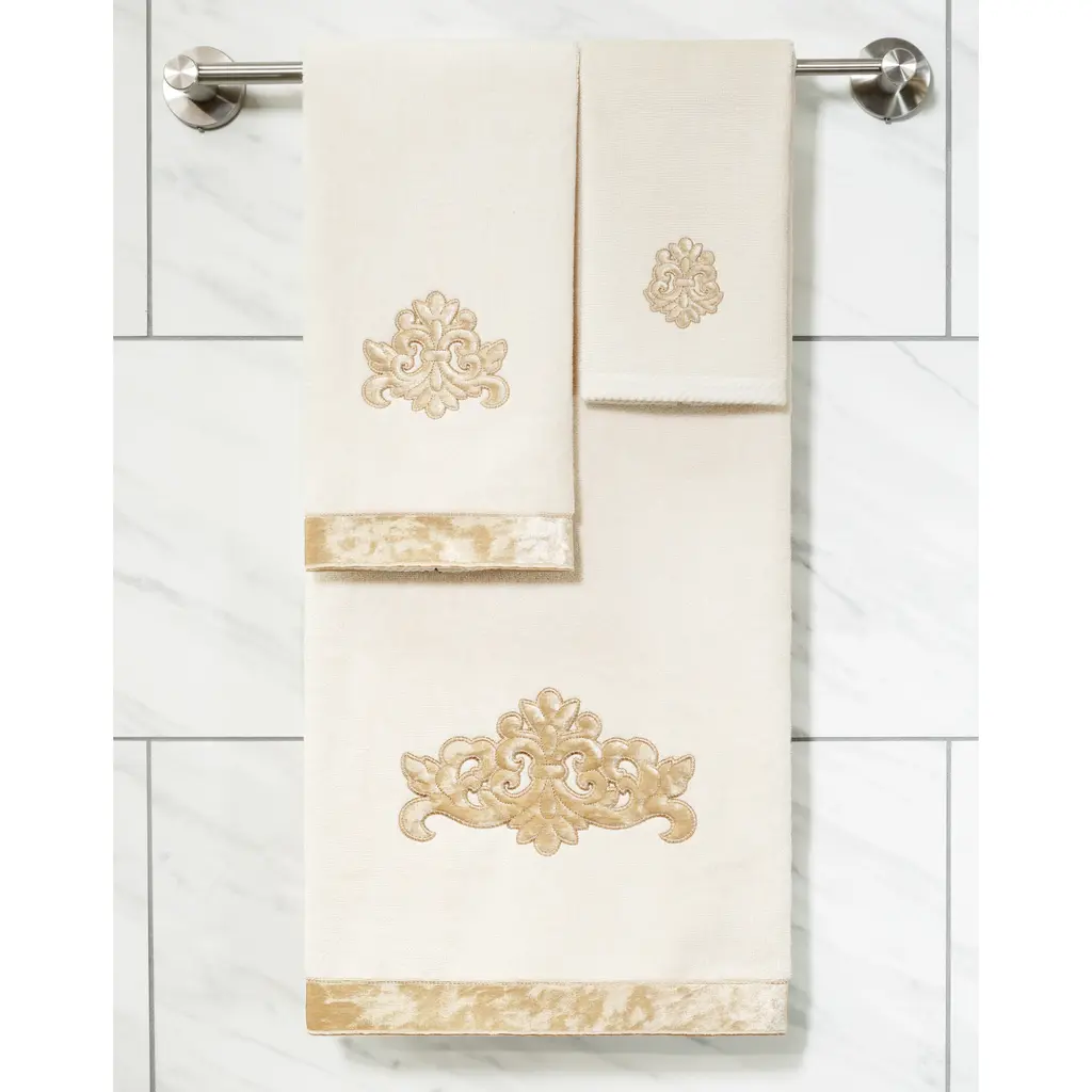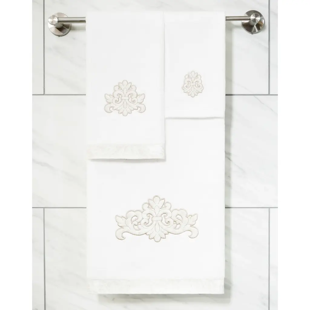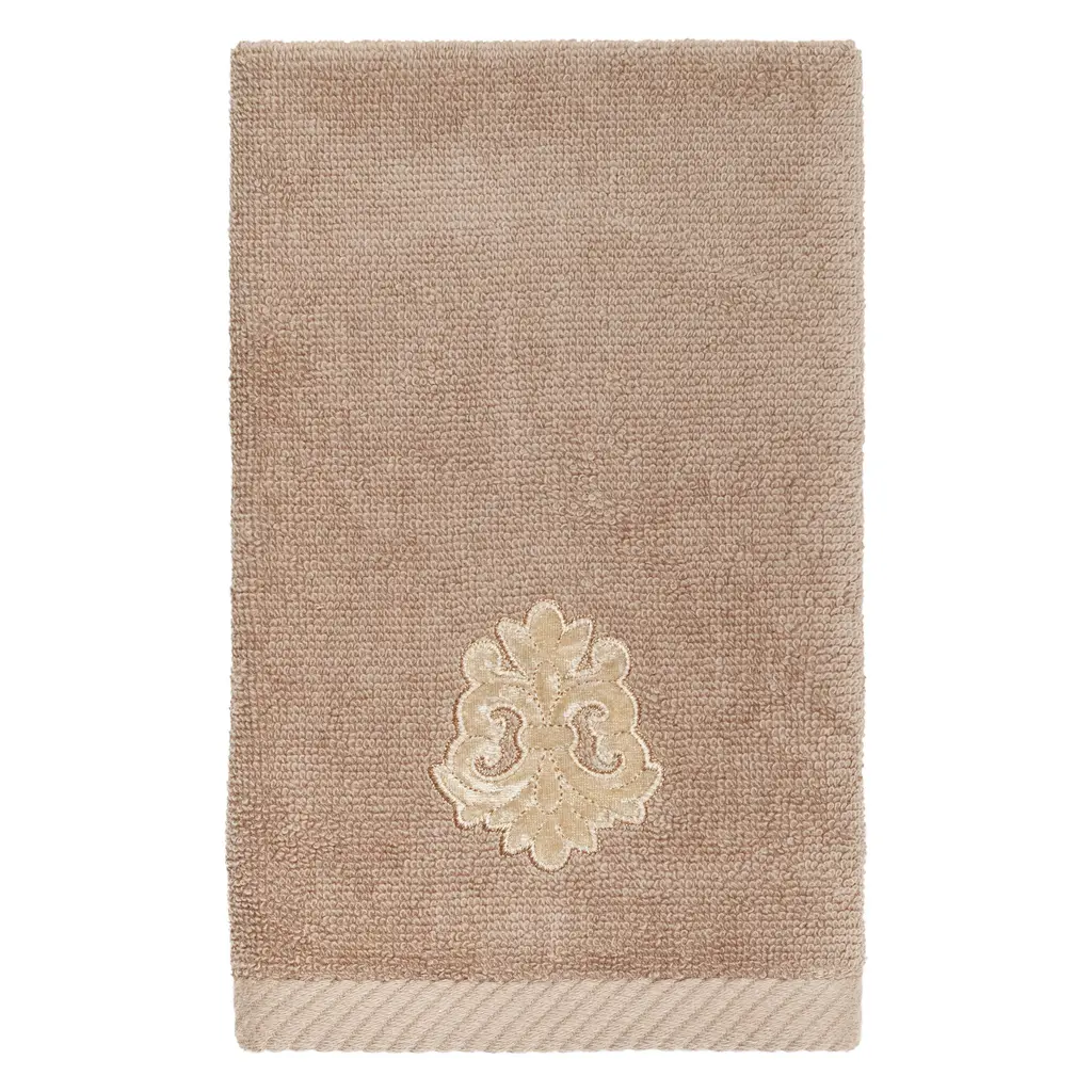 Your decorations are not complete without elegant embroidered towels by Authentic Hotel and Spa for the comfort of your family and guests. The May towels feature a classic velvet crest applique and are trimmed with the same lustrous velvet border. Cloud soft and super absorbent, these luxurious, durable towels keep their plush appearance after washing. This collection is available in 8 elegant colors: White, Beige, Blush, Aqua, Silver, Cocoa, Charcoal and Marine. The May Towel Collection brings a refined spirit and richness to your home decor and makes a great gift. Note: Due to variations in computer screen resolutions, slight color differences may exist between images provided and actual product.Embroidered Velvet Crest design100% Premium Turkish CottonSuperbly absorbent and quick dryingAvailable in 8 elegant colorsMachine wash cold, No bleach, line dry or dry cleanSet includes 2 fingertip towels (11" x 18")Made in TurkeyProudly Embellished in USA